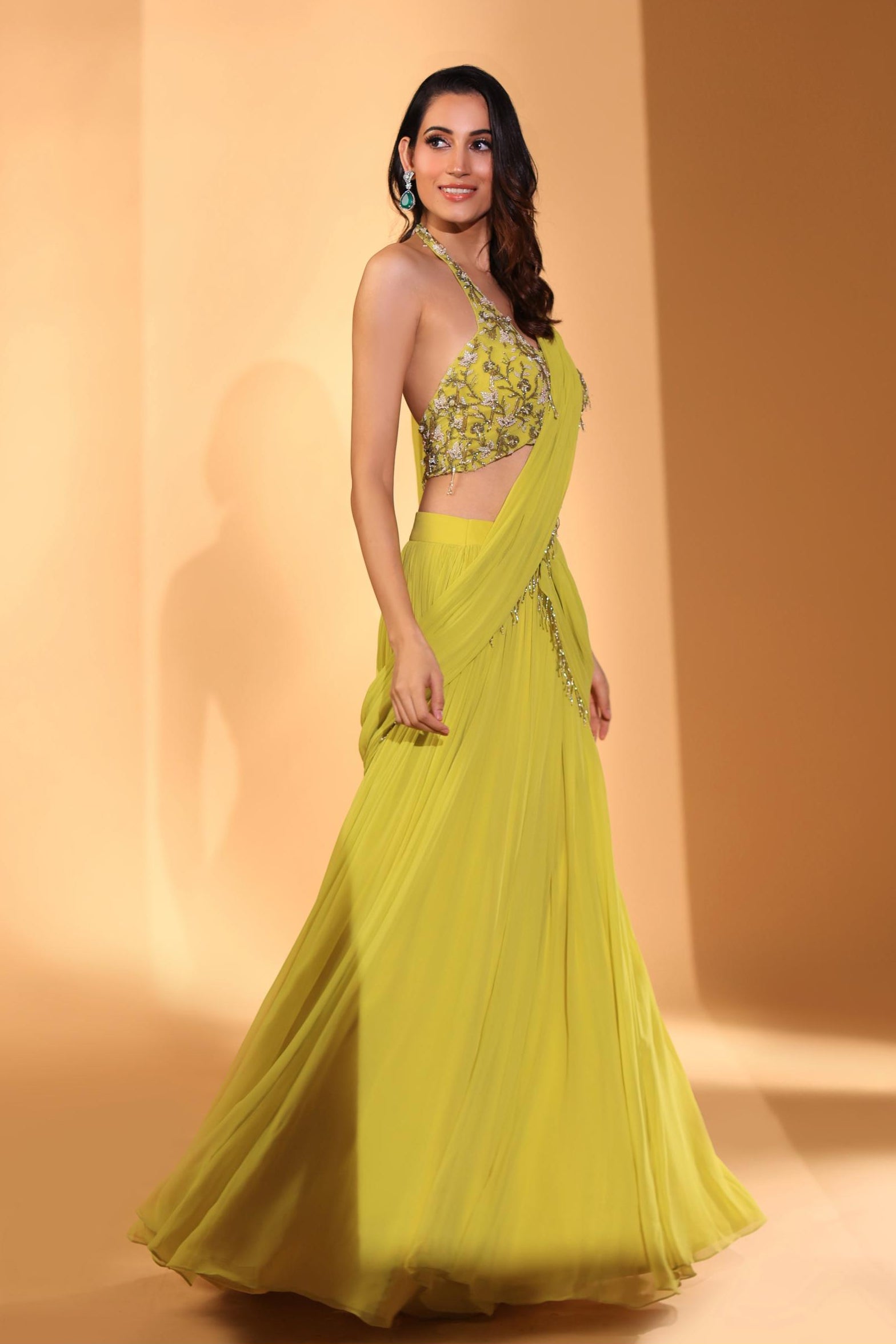 The pre-draped saree-lehenga in lime yellow is perfect for daytime weddings, festive events, and receptions. Its pre-draped design ensures effortless wear while the flowing lehenga skirt adds volume and elegance. Ideal for celebrations, this pre-draped saree-lehenga highlights a vibrant silhouette and brings a refreshing twist to traditional attire. The bright lime yellow hue makes it stand out, while the design balances comfort with style. Perfect for festive occasions, this pre-draped saree-lehenga combines ease, elegance, and grandeur, making it a must-have for your wardrobe.