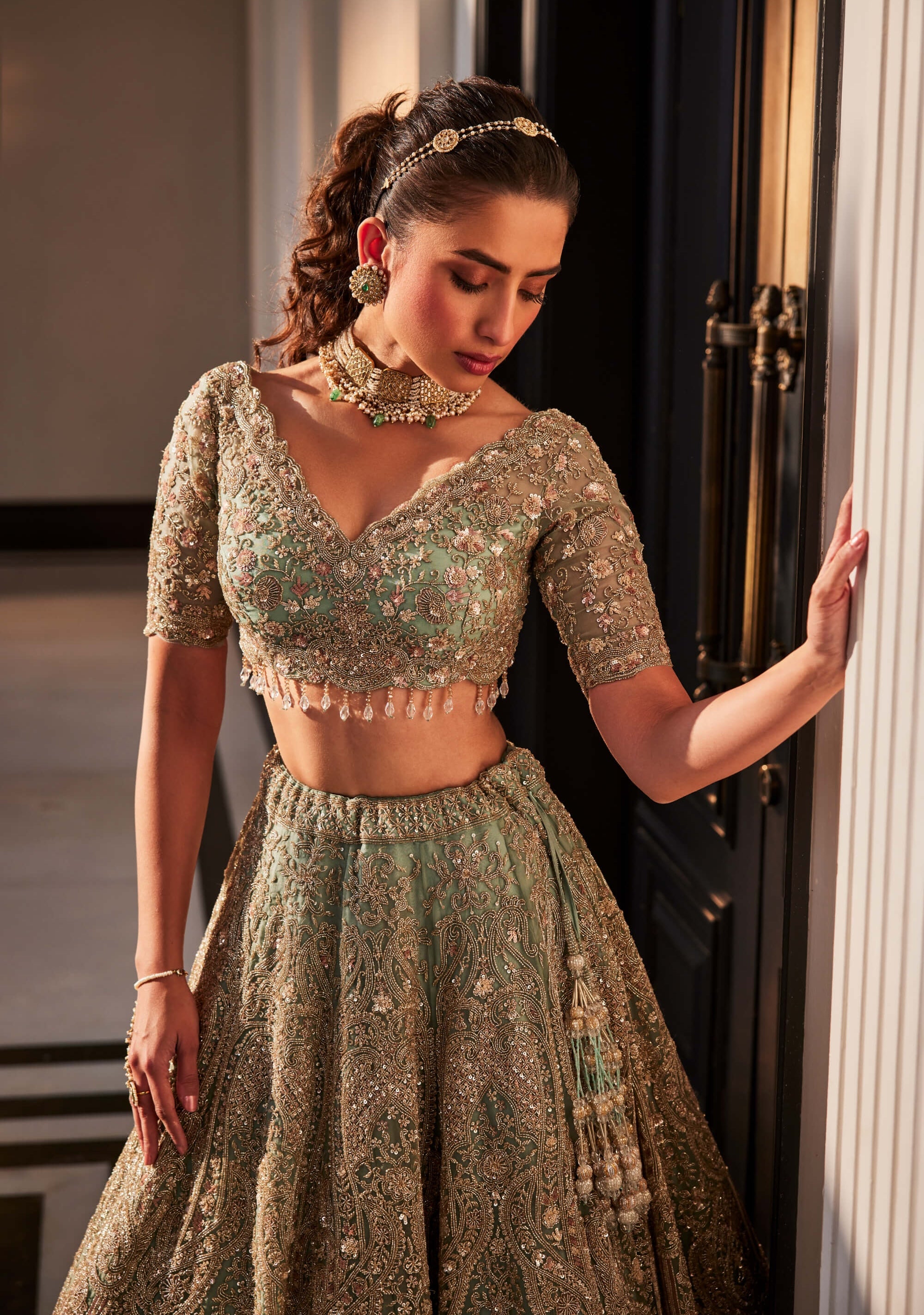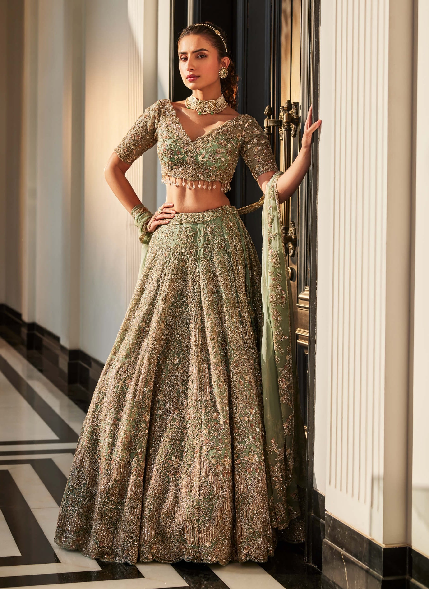 The kyle lehenga is paired with a v-neckline blouse, which complements the overall design with a modern and flattering silhouette. A net dupatta completes the look, adding a layer of graceful elegance. Ideal for special occasions and festive events, the kyle lehenga ensures you make a memorable impression with its exquisite embroidery and elegant design, blending both modern allure and timeless beauty.