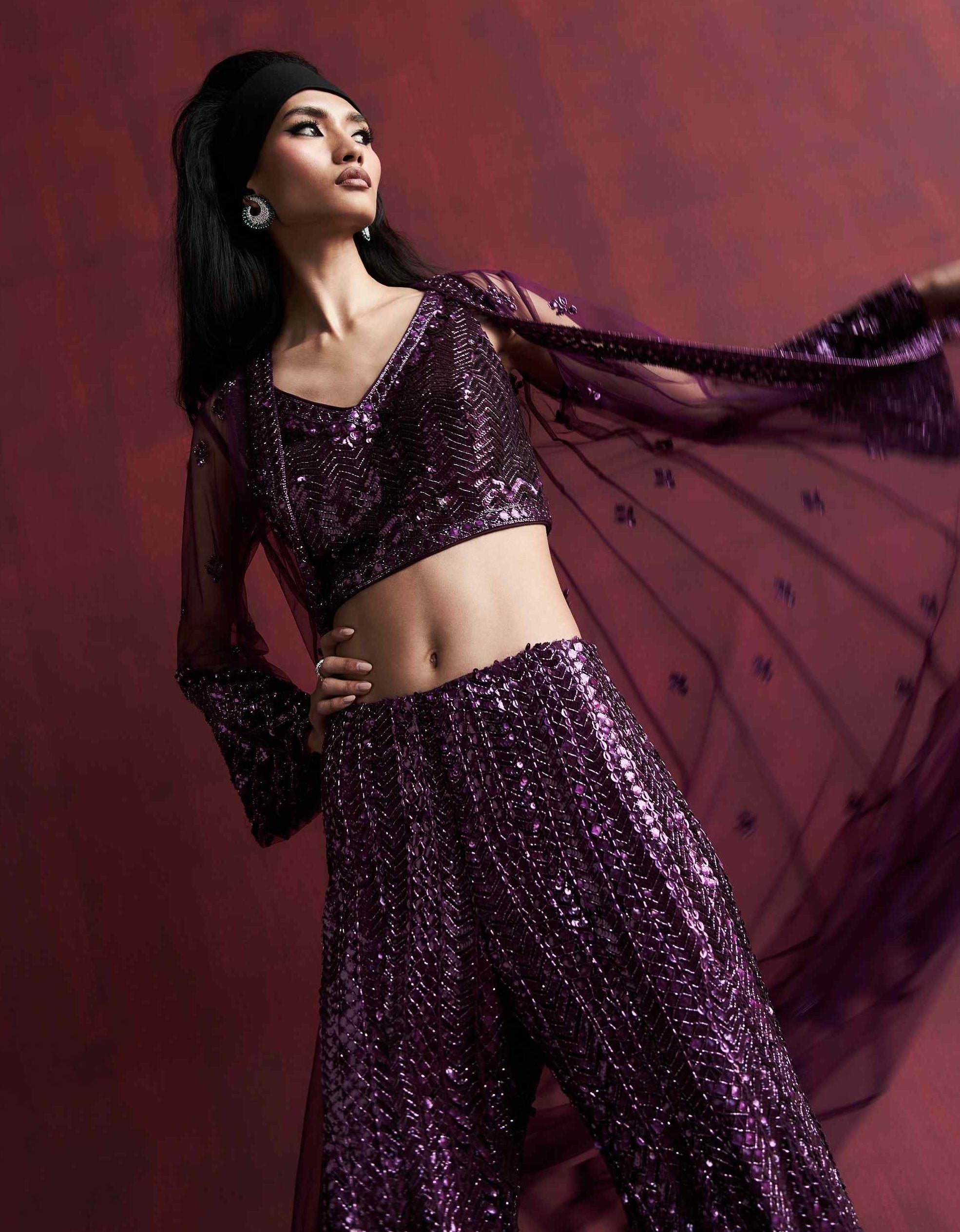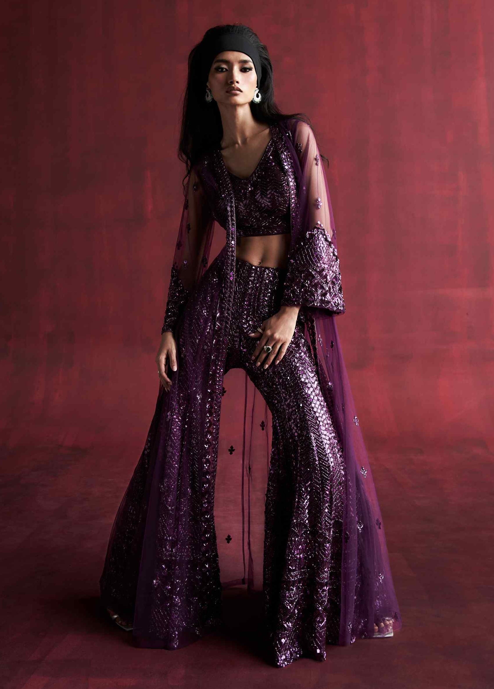 Embrace timeless elegance with our stunning ensemble featuring a backless blouse, sharara, and a long jacket. The backless blouse offers a modern, chic touch, perfectly complemented by the flowing sharara that adds grace and sophistication to your look.