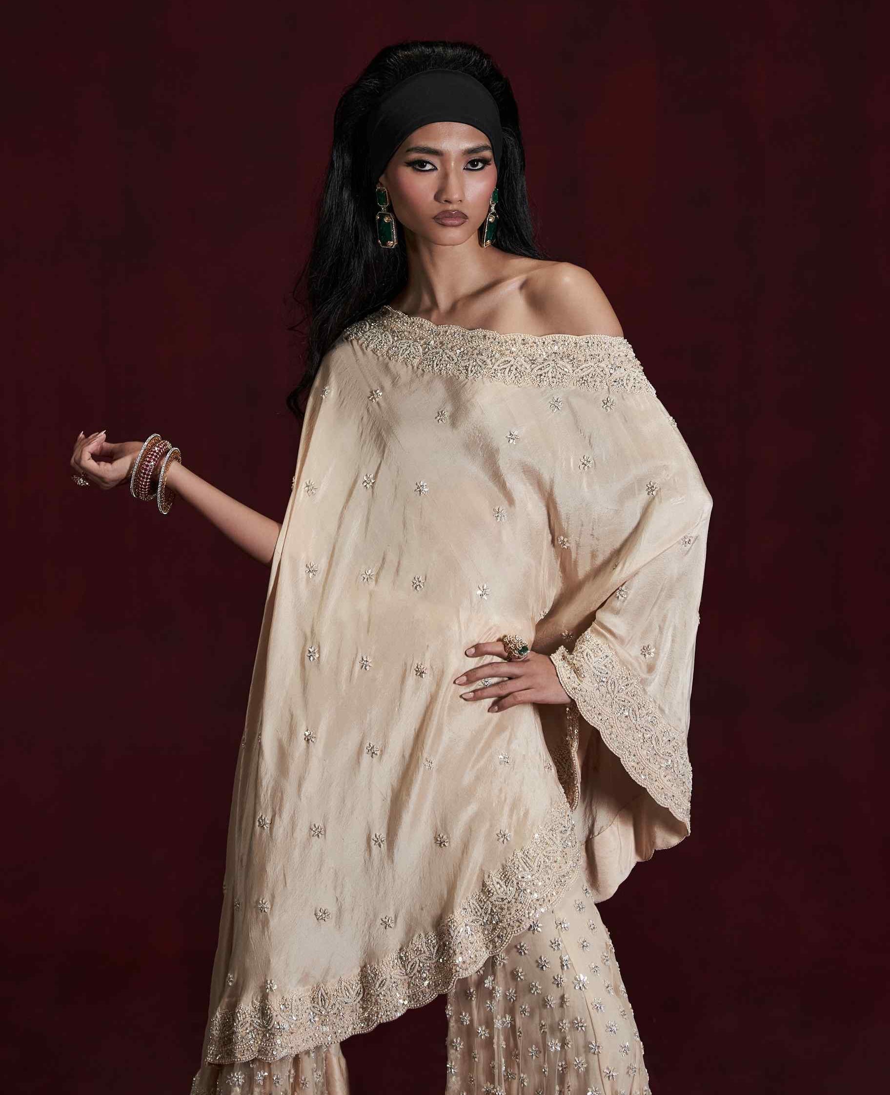 Paired with the cape is the bordered sharara, which flows elegantly and complements the cape’s ornate detailing. The hemwork on the sharara mirrors the cape's embellishments, enhancing the overall grandeur of the ensemble. Perfect for special occasions, this outfit blends classic charm with modern refinement, ensuring you make a memorable impression.
