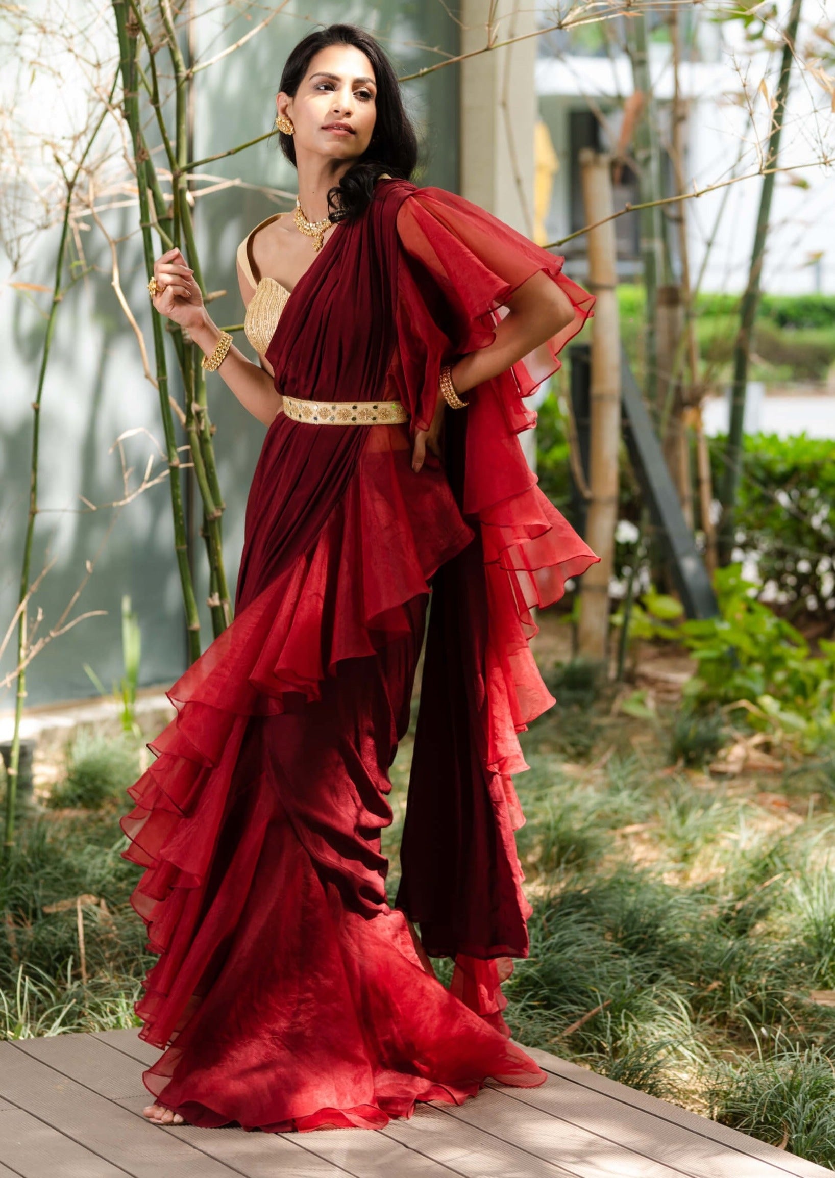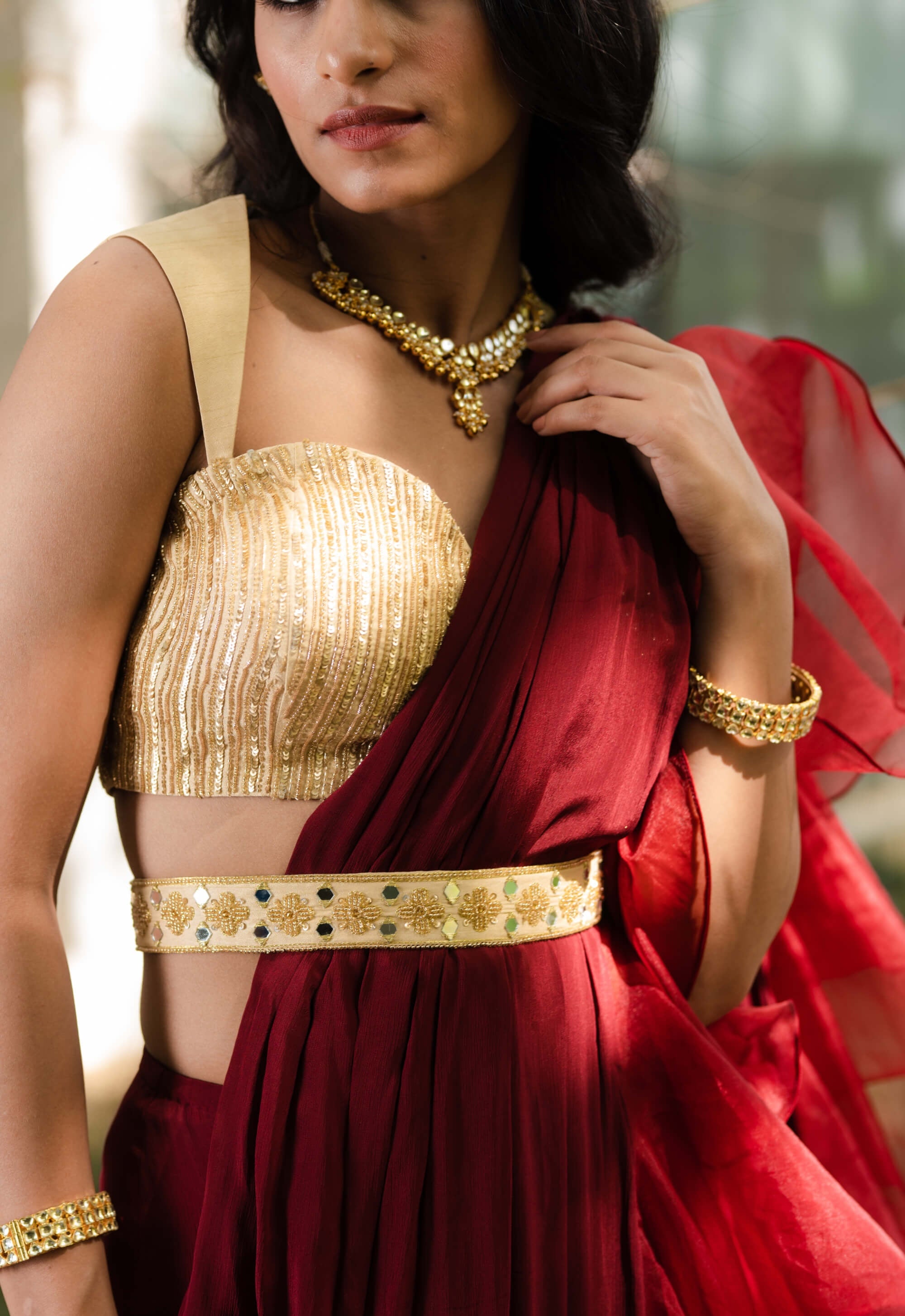 Fabric: Blouse: croma silk, saree: chinnon chiffon and organza, belt: croma silk, lining: shantoon