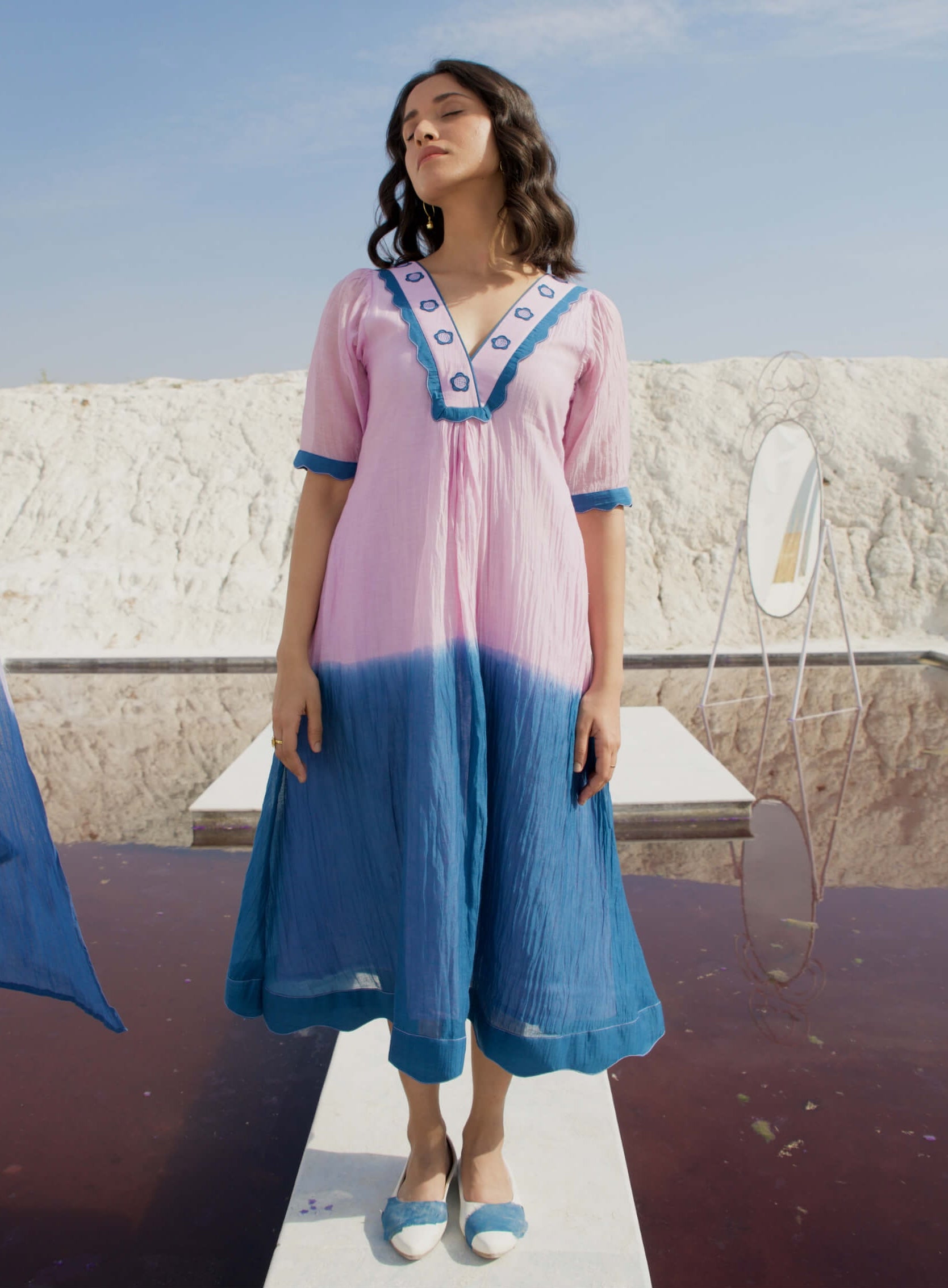 Introducing the 'Happy Vacation' dress, designed in a striking combination of cobalt and lavender that creates a beautiful ombre effect. This delightful dress features an overlapping V-neckline with abstract highlights on the edges of the neckline and sleeves, adding a touch of modern flair. It includes two convenient side pockets and appliqued sea waves at the hem, enhancing its charm and practicality. Adorned with beautifully crafted poppy flowers on the neckline, the dress exudes a sense of artistry and whimsical elegance, making it perfect for a relaxed and joyful vacation vibe.