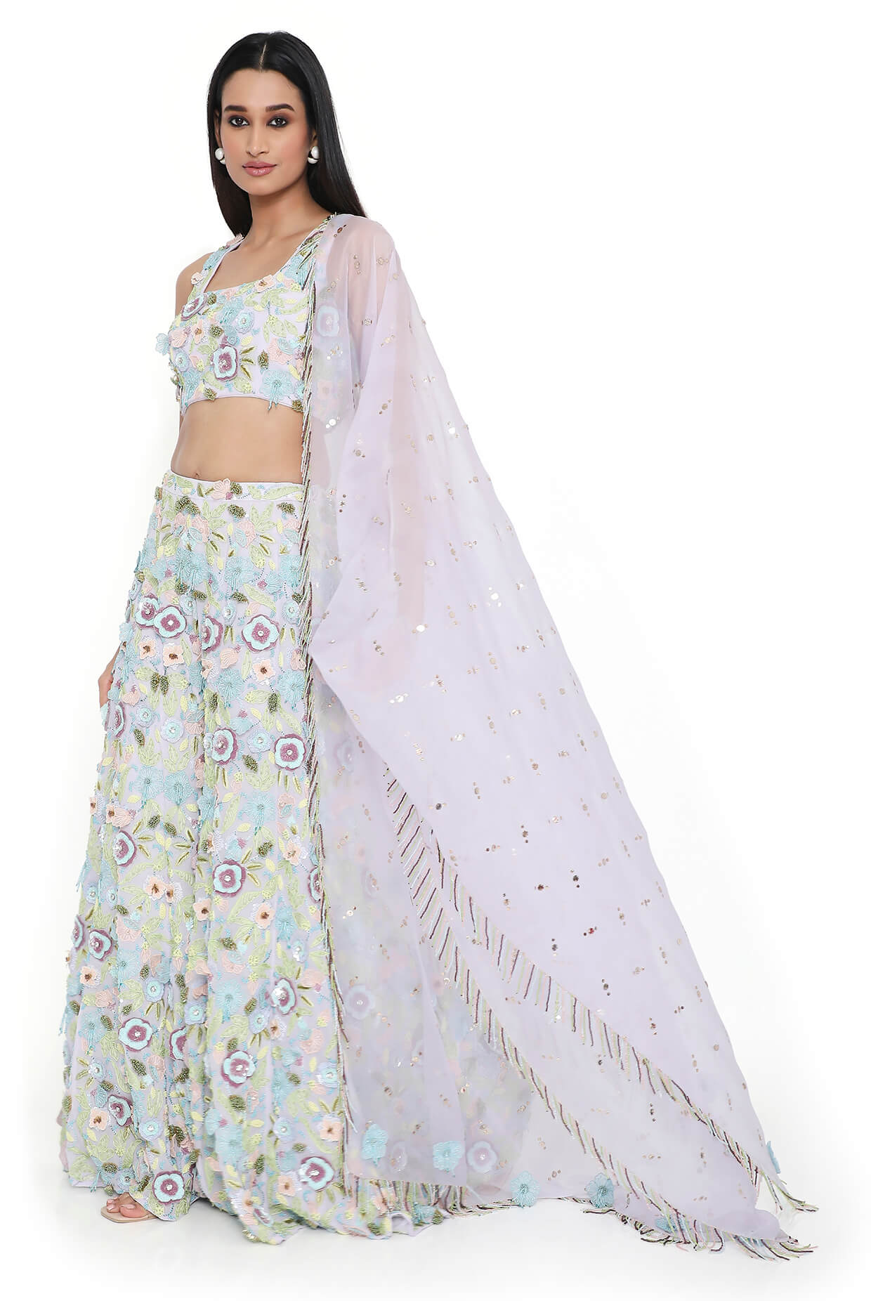 Step into elegance with our Lavender Georgette Embroidered Choli and Sharara set. The choli, crafted from delicate georgette, features intricate embroidery that adds a refined touch to your look. The matching sharara offers a flowing silhouette, creating a graceful movement. Complementing this ensemble is the Dot Mukaish Organza Dupatta, adorned with shimmering dot mukaish details that catch the light beautifully. Perfect for special occasions, this outfit seamlessly blends traditional charm with contemporary sophistication.