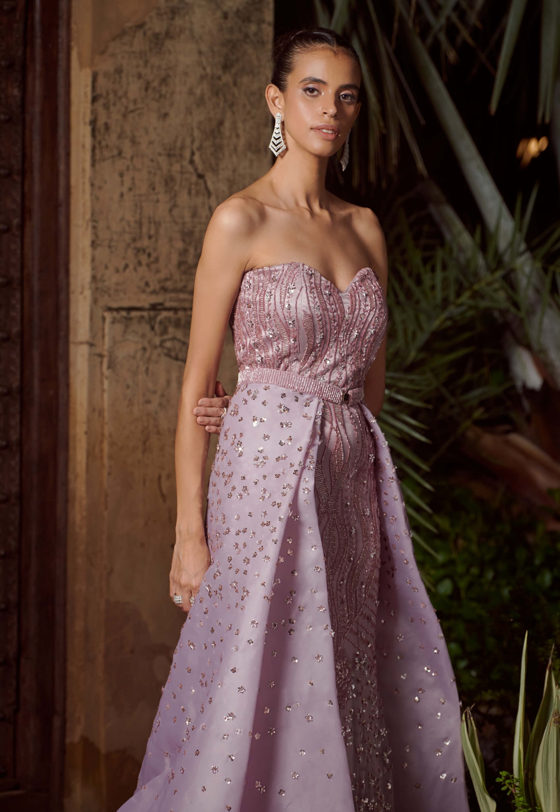 Exude elegance in this lavender mermaid gown, crafted from luxurious heavy satin and delicate organza. The gown features a figure-hugging mermaid silhouette, complemented by a flowing organza belt layer that adds a touch of ethereal grace. The soft lavender hue and layered detail create a stunning and sophisticated look, perfect for a memorable entrance at any special event.