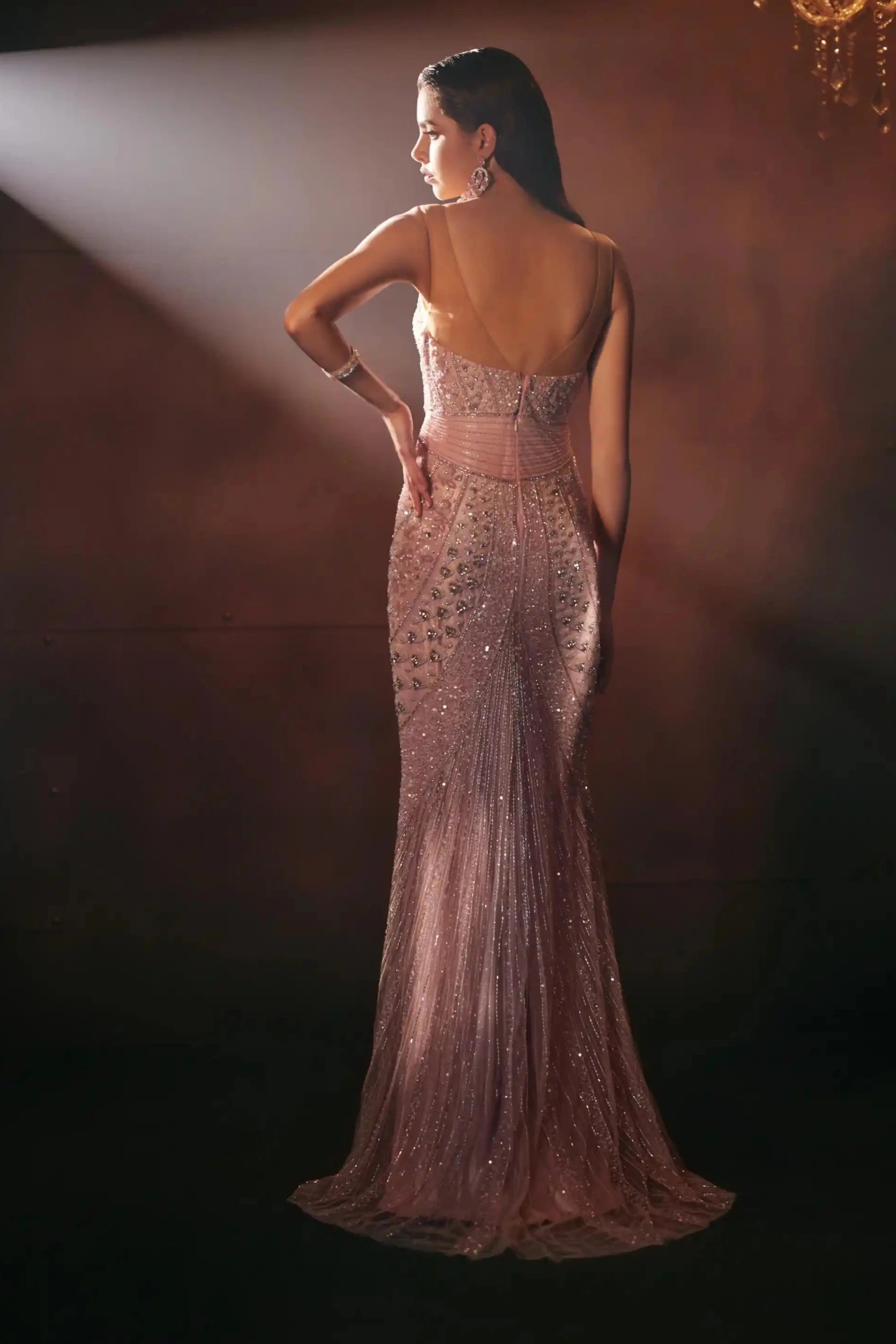 Awaken your inner goddess with this timeless gown in a delicate lavender pink hue. Crafted from illusion tulle, the gown showcases rhythmic lines that create a dreamlike bodycon fit, beautifully accentuating your silhouette. The elegant center slit adds a touch of allure, making it perfect for formal occasions or special events. This enchanting gown effortlessly blends sophistication and femininity, ensuring you turn heads and leave a lasting impression wherever you go.