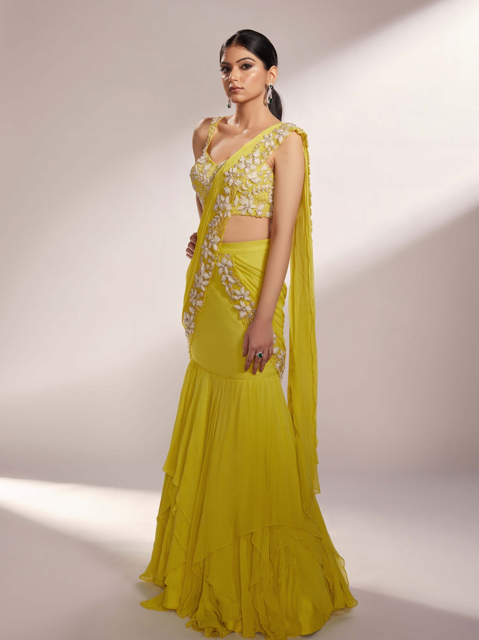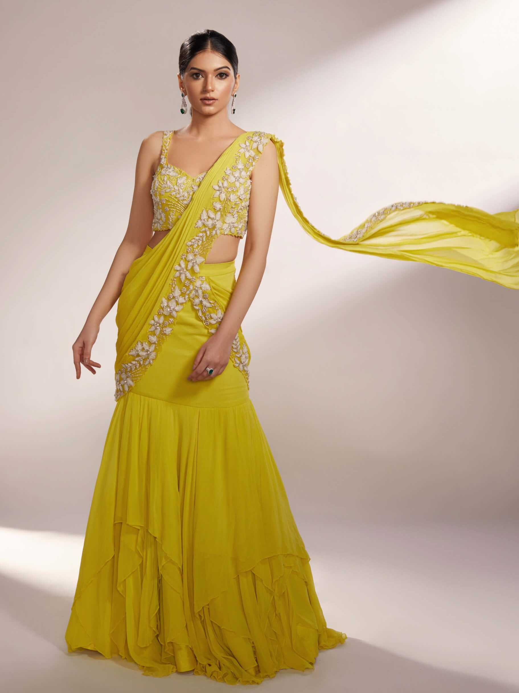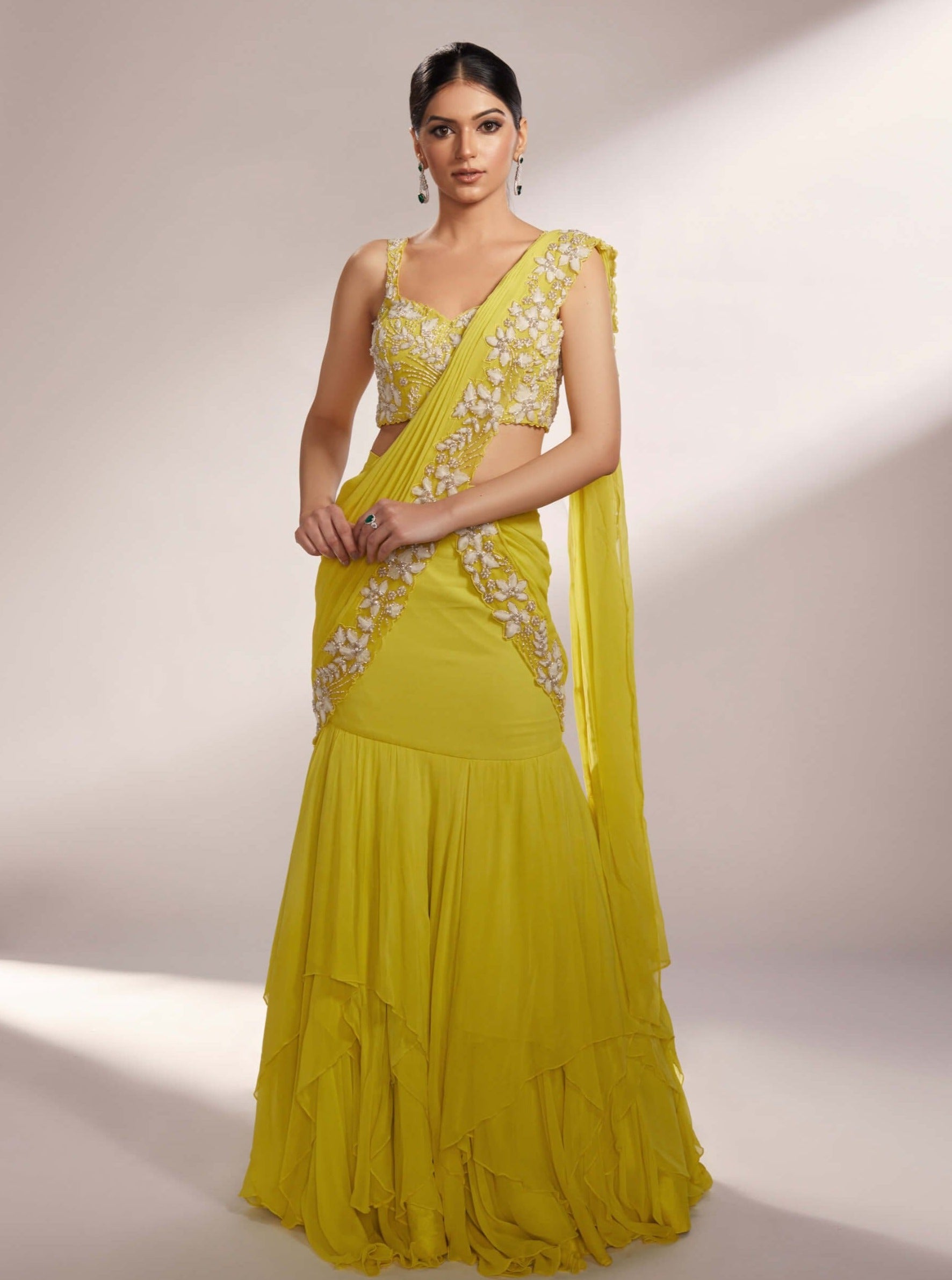 Illuminate your presence with our lime yellow pre-draped saree lehenga a masterpiece of vibrant elegance and modern sophistication. This striking ensemble features a pre-draped saree adorned with exquisite organza floral details meticulously embellished with shimmering silver glass beads and elegant pearls. The layered georgette skirt adds a graceful flowing movement enhancing your silhouette with every step. Perfect for making a memorable impression at any special event this lehenga seamlessly blends contemporary design with timeless allure ensuring you radiate with effortless grace and style.