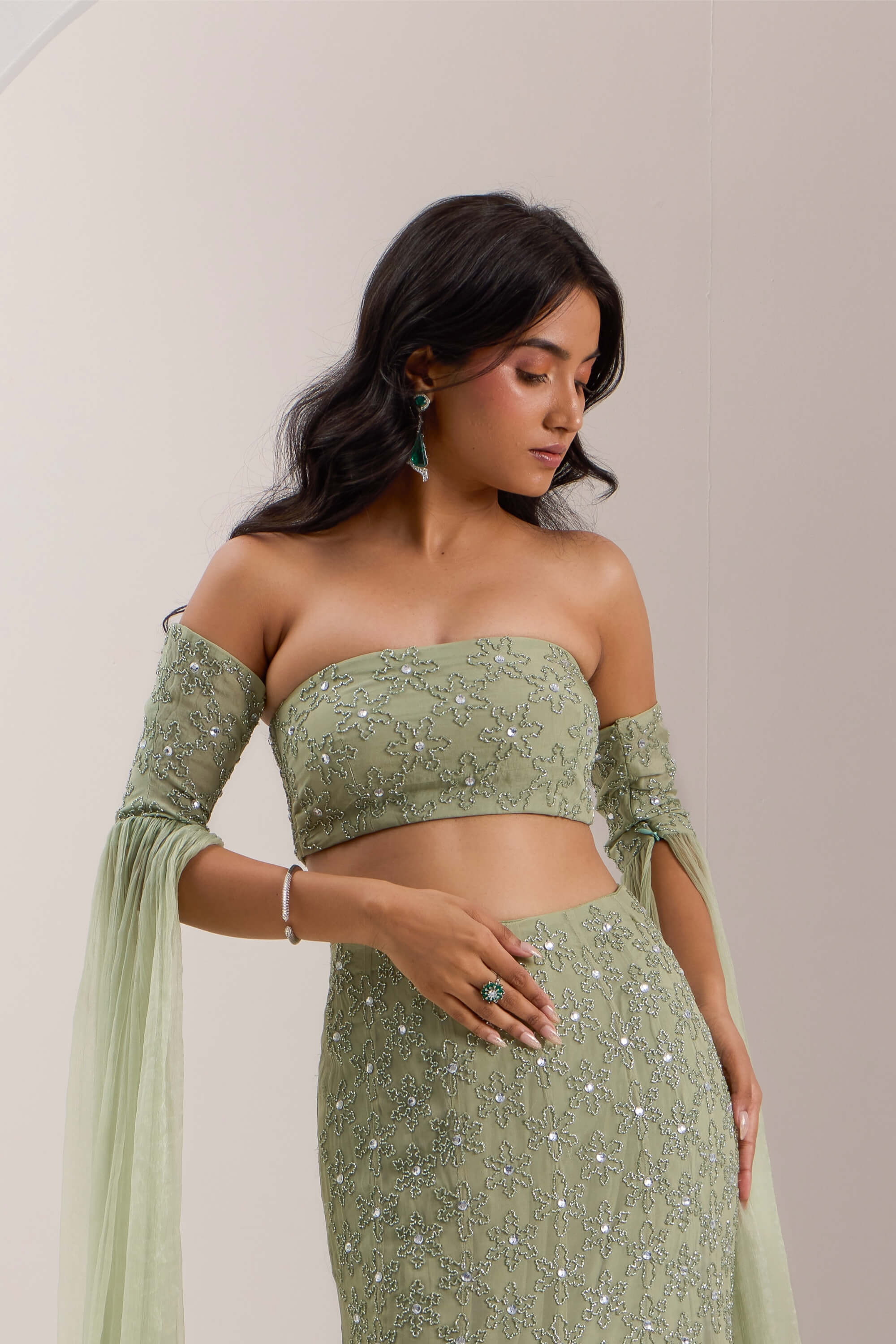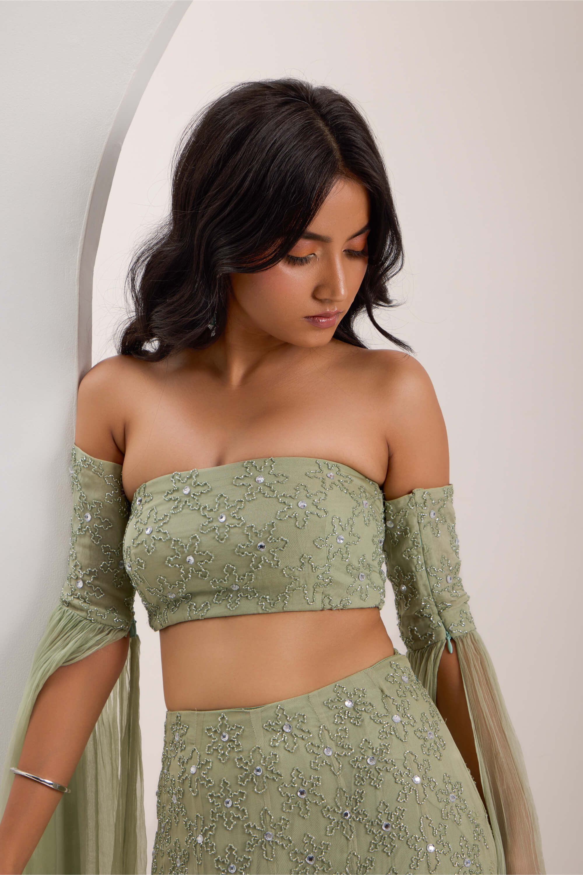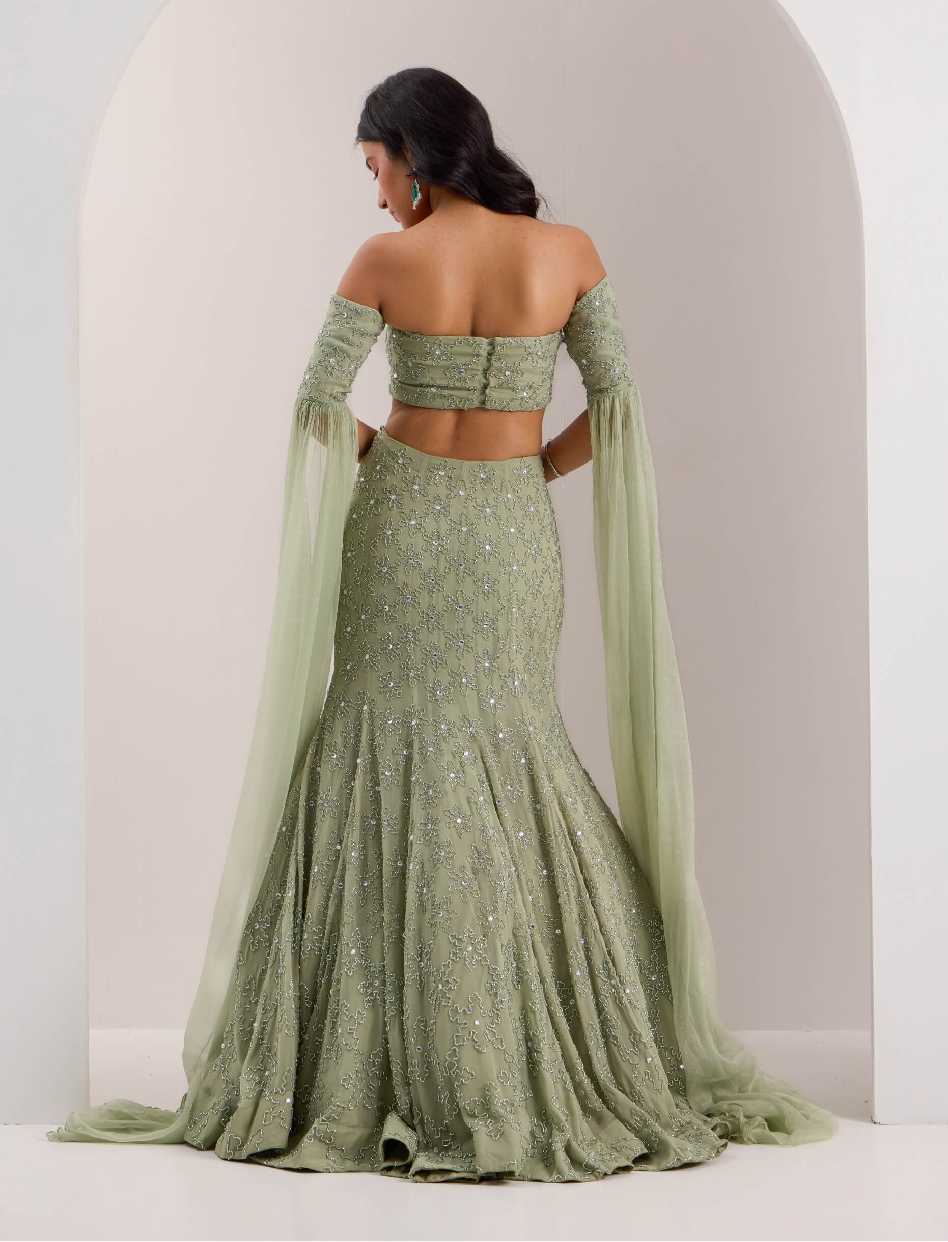 Embroidery: Silver dori work and hand embroidery highlighting using pearls, mirrors & sequins