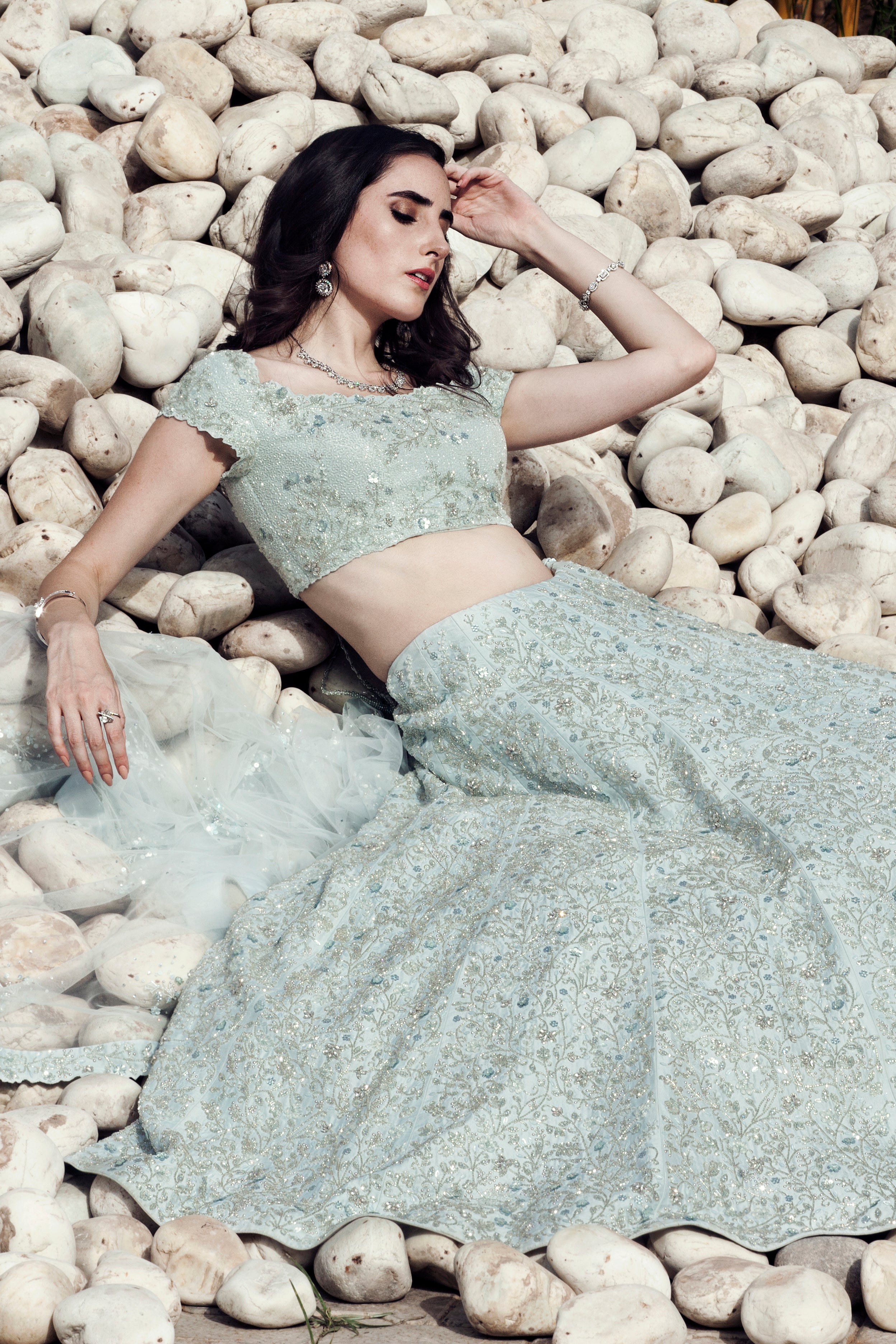 Embrace celestial elegance with this light blue crystal-embellished lehenga set, a stunning blend of ethereal charm and intricate craftsmanship. The soft pastel blue hue evokes a sense of serenity, while the delicate crystal embellishments add a touch of refined sparkle, making this ensemble perfect for weddings, receptions, and festive soirŽes. Designed for those who appreciate subtle opulence, this lehenga set creates a graceful and mesmerizing silhouette.