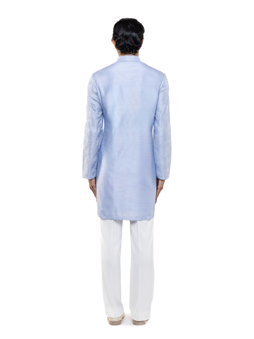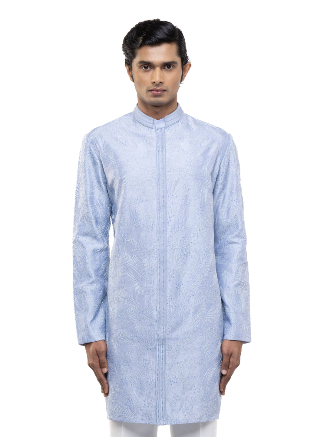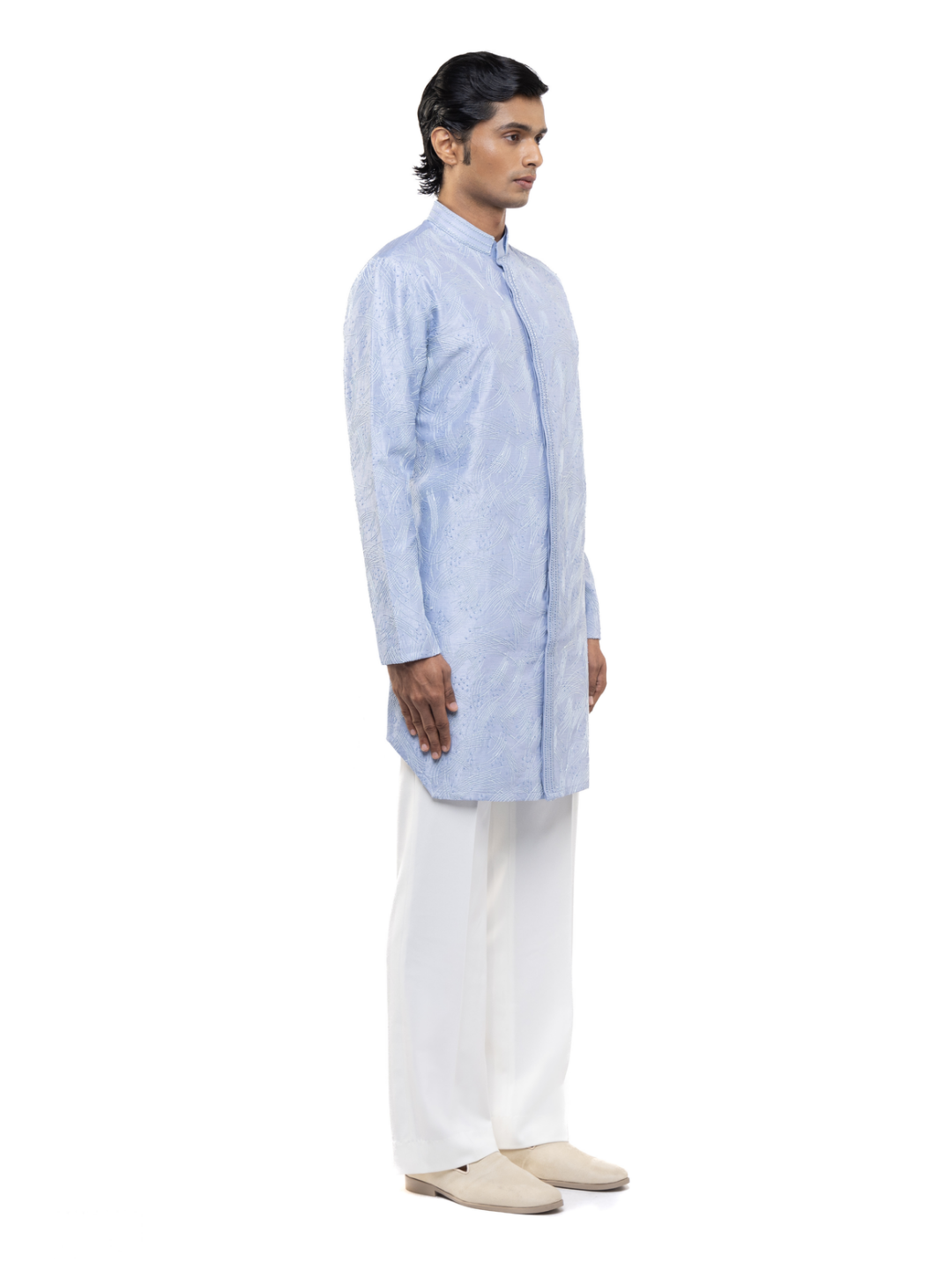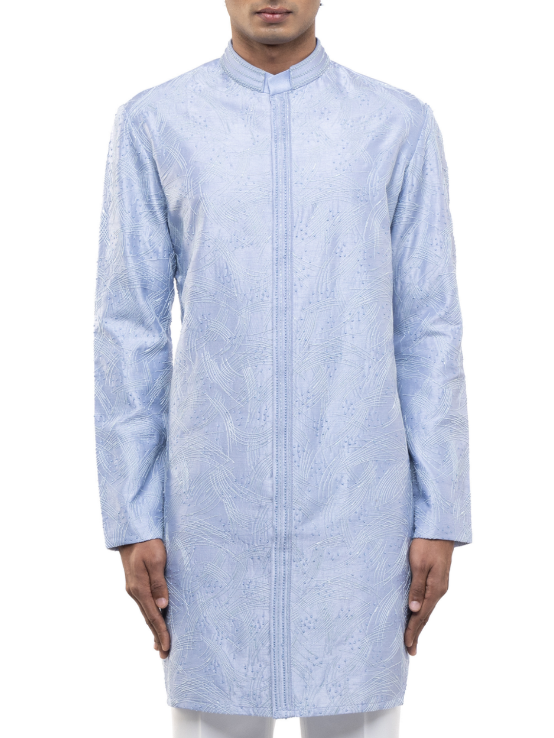 Light Blue Hand Embroidered Kurta Set. A serene and elegant kurta set crafted in luxurious silk with delicate hand embroidery. Featuring a stand collar, concealed placket, and refined Mother of Pearl buttons, this kurta is designed with a stylish bucket cut hem for a contemporary touch. The regular fit ensures comfort and ease, making it perfect for festive occasions and sophisticated gatherings.