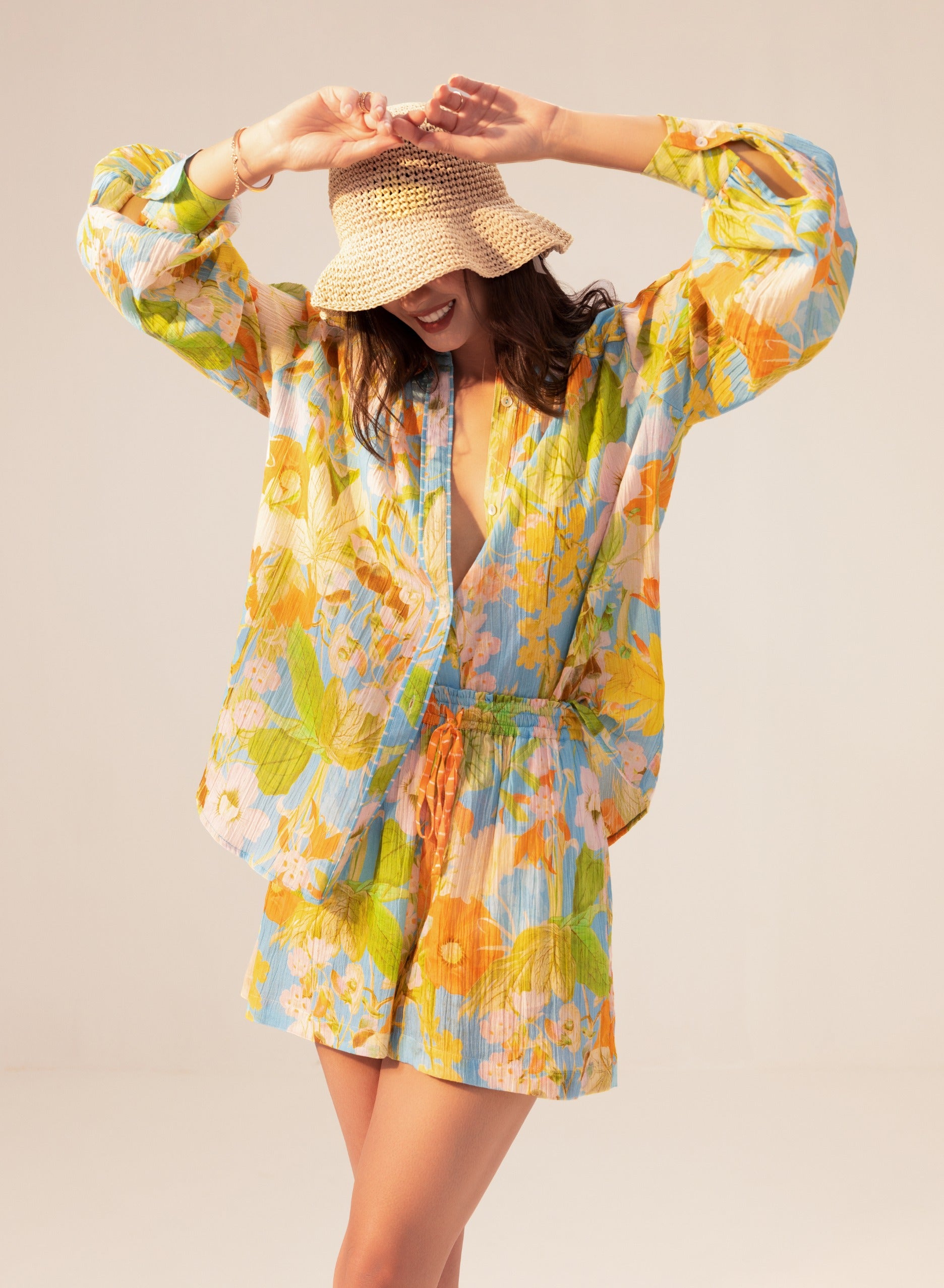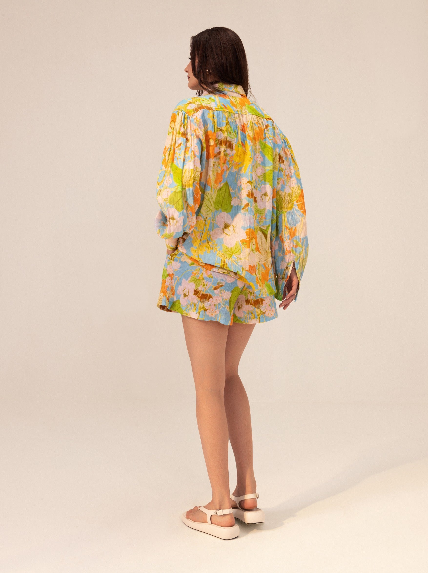 Bright, breezy, and effortlessly chic, the Light Blue Orange Iris Shirt and Shorts set combines vibrant hues with laid-back elegance. The relaxed-fit shirt paired with comfortable shorts creates a perfect blend of style and ease. Featuring a playful light blue and orange iris print, this set is perfect for casual outings, weekend getaways, or sunny beach days. For the woman who loves to embrace bold color and effortless style, this set is a must-have addition to your wardrobe.