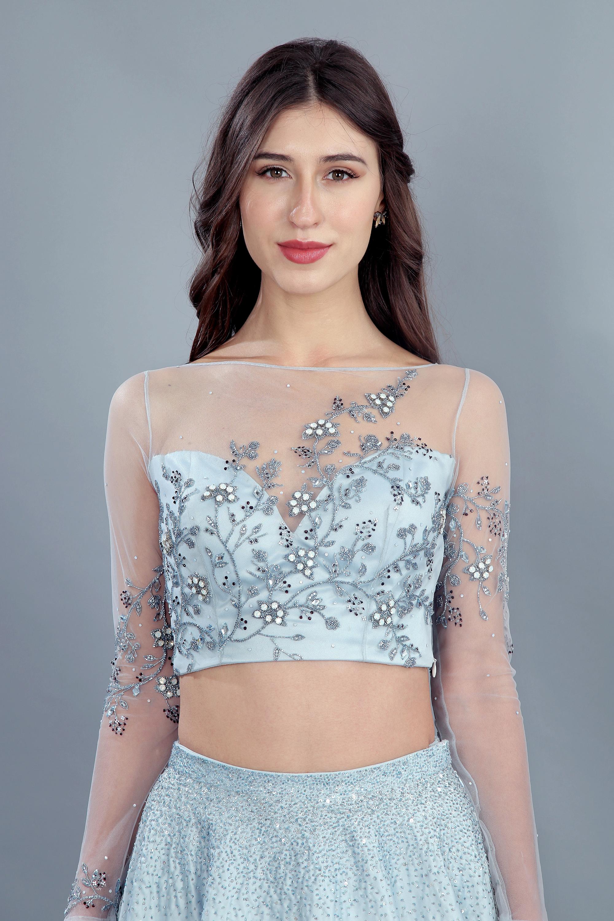 Step into sheer elegance with this light blue sheer-back embellished crop top and skirt set, a stunning fusion of contemporary allure and timeless grace. The delicate sheer-back detailing adds a touch of ethereal sophistication, while the intricate embellishments create a mesmerizing sparkle. The soft pastel blue hue enhances the ensembleÕs dreamy appeal, making it perfect for cocktail soirŽes, receptions, and festive celebrations. Designed for the modern muse, this ensemble ensures a graceful and effortlessly glamorous presence.