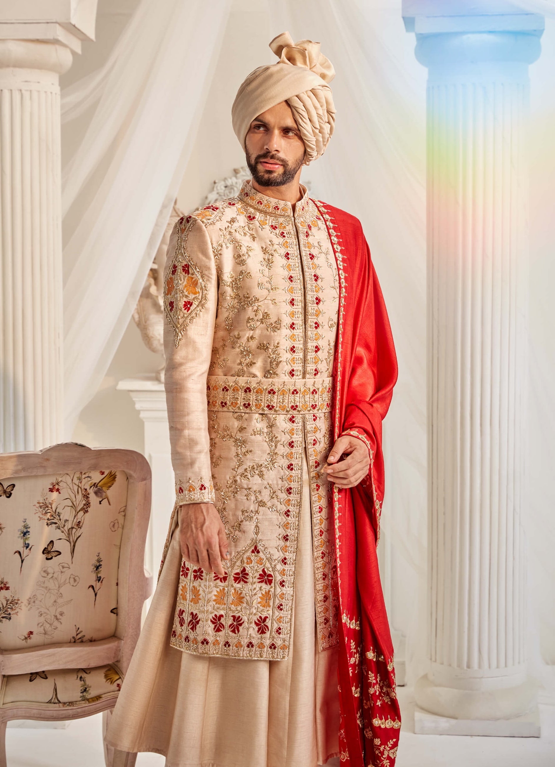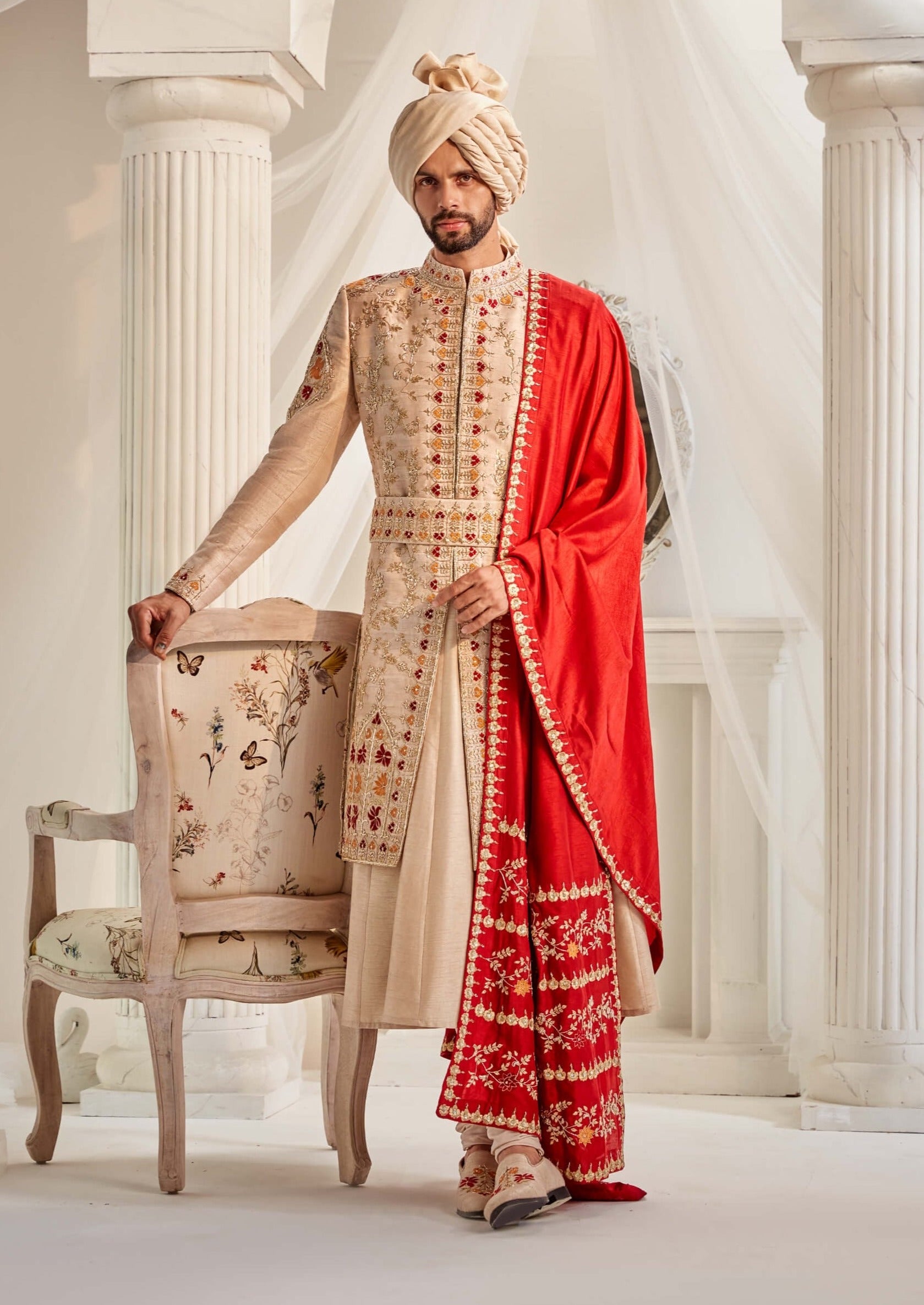 This opulent light gold sherwani set features intricate resham, dabka, and glass bead work. The ensemble includes a meticulously embroidered sherwani, paired with a kurta, churidaar, and a striking red embroidered stole. The set is completed with a coordinating embroidered belt, combining traditional craftsmanship with a touch of vibrant elegance. Crafted from luxurious fabric, this set ensures a sophisticated and distinguished look for any special occasion.