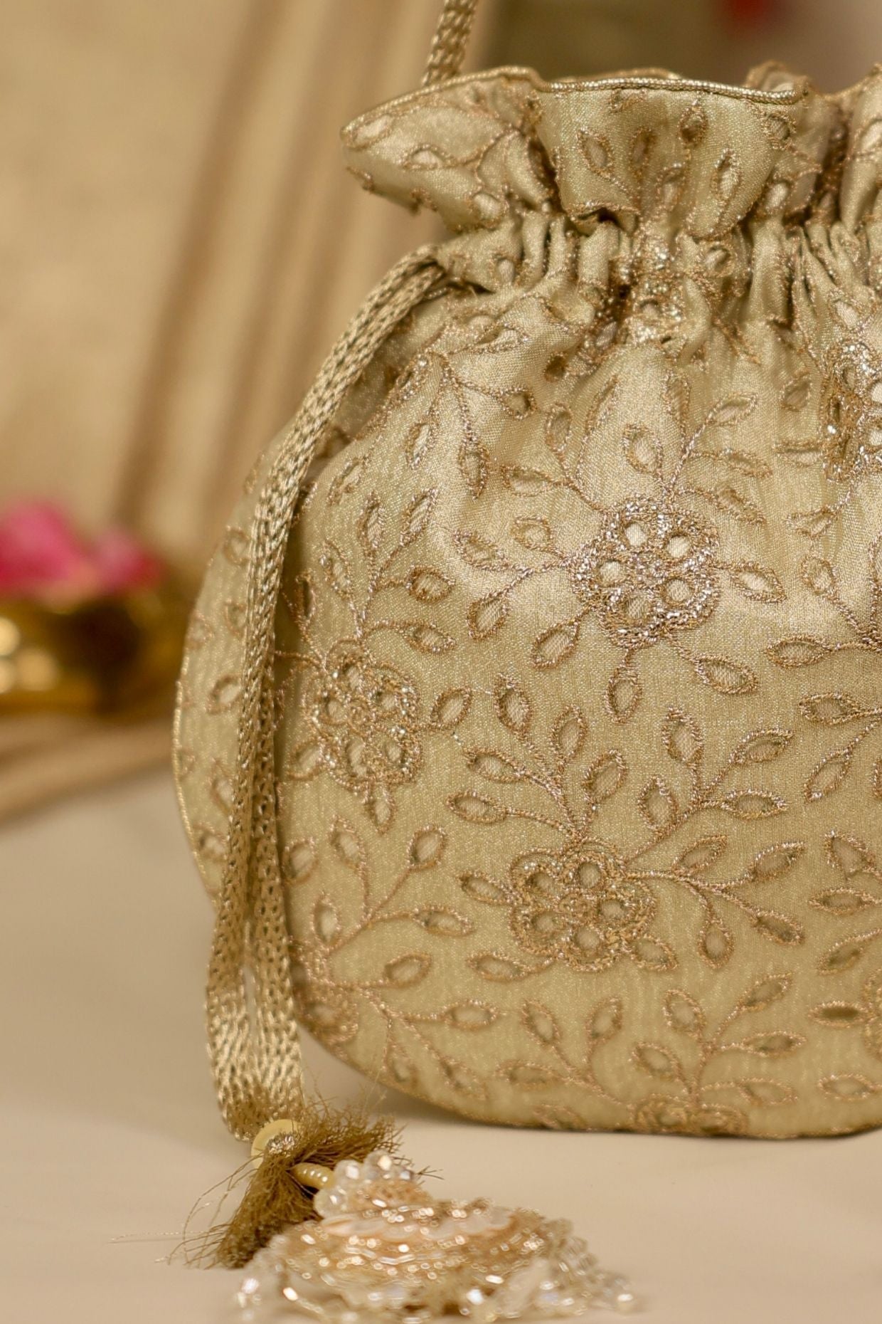 The Light Gold Tarang Cutwork Potli is a timeless accessory that exudes elegance and craftsmanship. Adorned with intricate cutwork in a soft gold finish, this potli blends traditional design with contemporary charm. Its spacious interior and delicate drawstring closure make it both stylish and functional. Perfect for weddings, festive occasions, or evening events, it adds a refined touch to any ethnic ensemble. A must-have for those who appreciate classic style with artisanal detail.