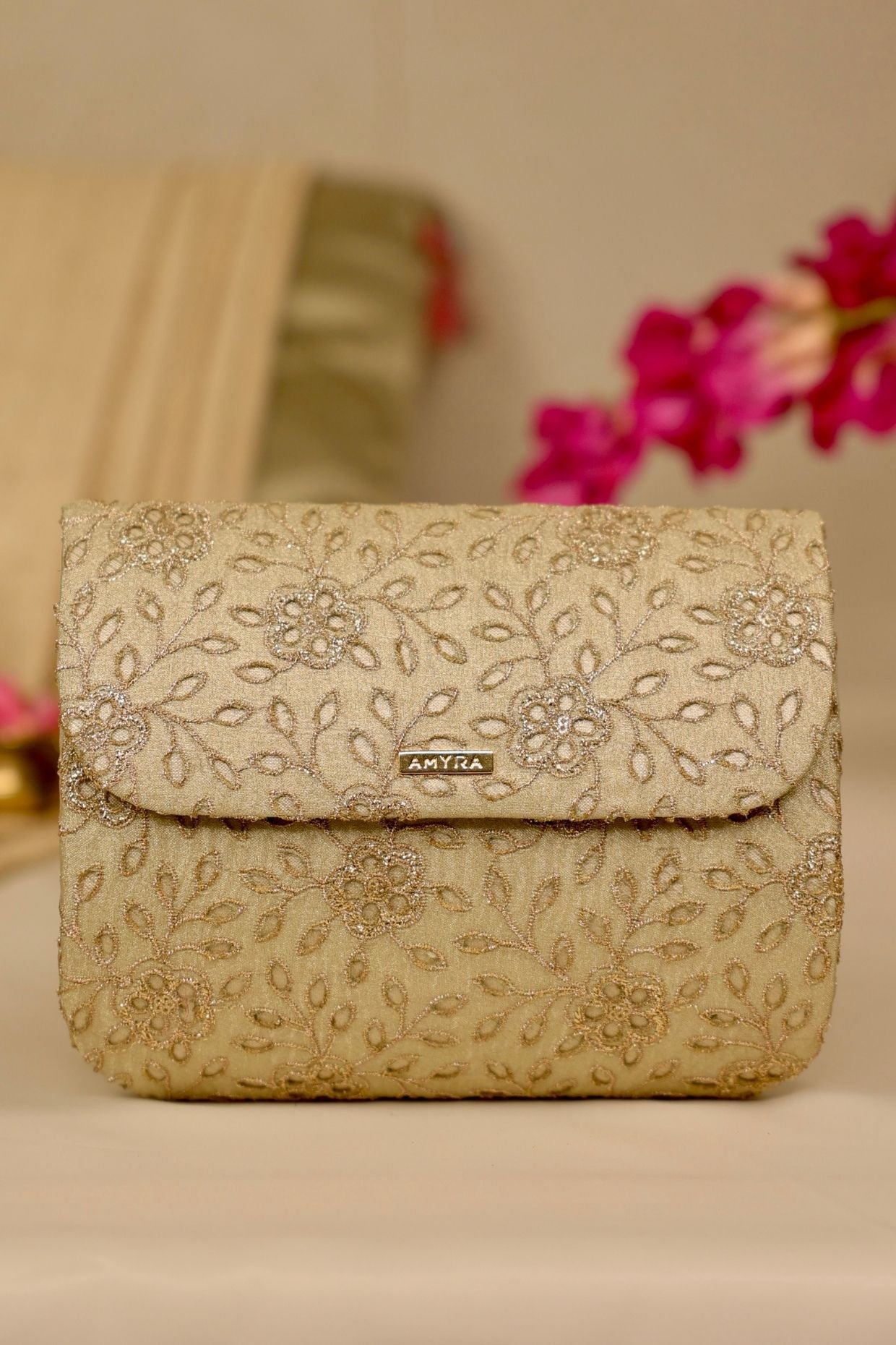 The Light Gold Tarang Flapover Bag combines subtle shimmer with intricate craftsmanship. Featuring a soft light gold finish and detailed design, this elegant bag boasts a classic flap closure for a refined look. Perfect for weddings, festive celebrations, or evening events, it offers both style and convenience. A chic accessory for those who appreciate understated luxury and timeless elegance.