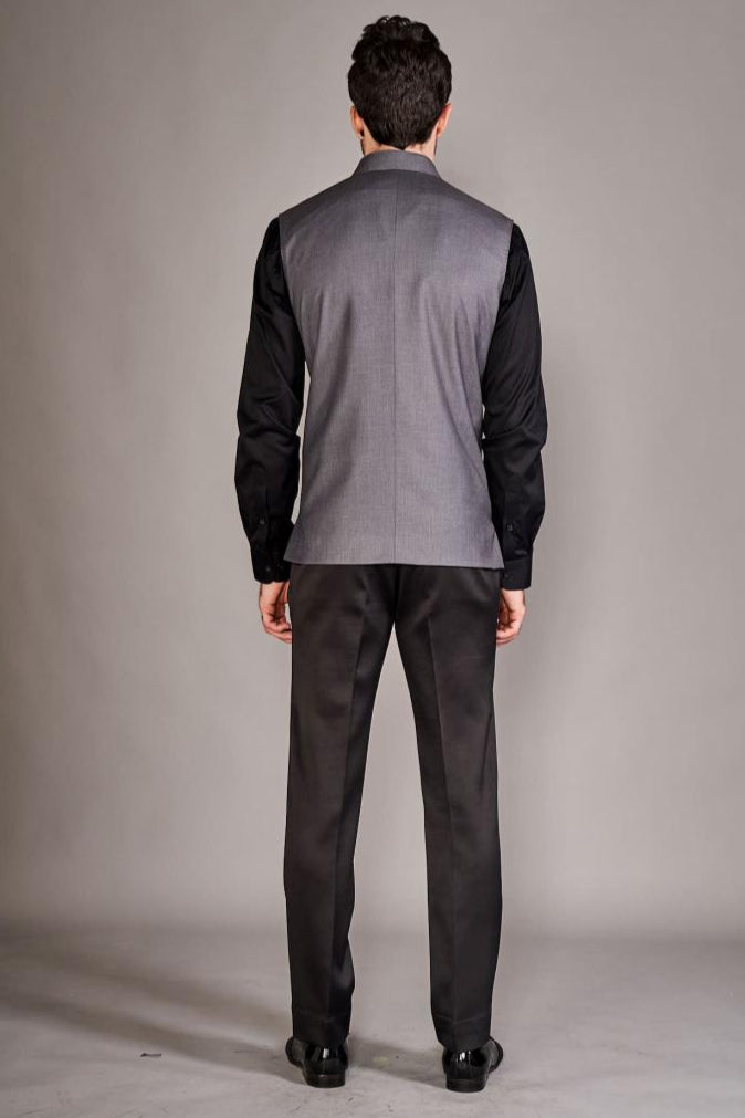 Create a sophisticated look with this Light Gray Classic Bundi paired with a Black Chinese Collar Shirt. The soft, neutral gray of the Bundi offers a versatile and timeless appeal, while the black Chinese collar shirt adds a bold, modern contrast. Perfect for semi-formal events or evening occasions, this combination effortlessly blends traditional charm with contemporary style.