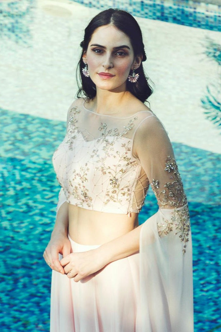 Light pink katdana and sequin embellished cape sleeve crop top skirt set
