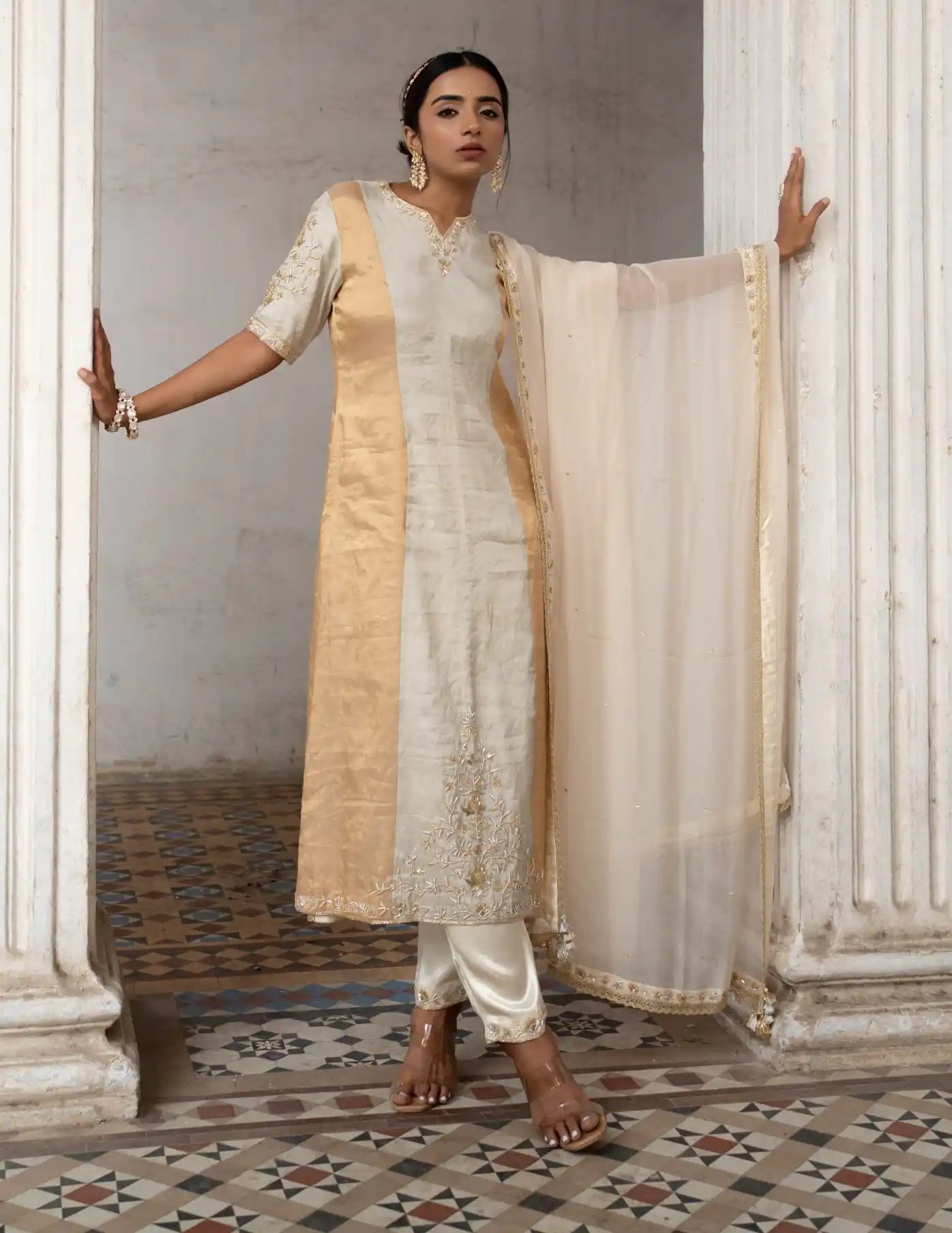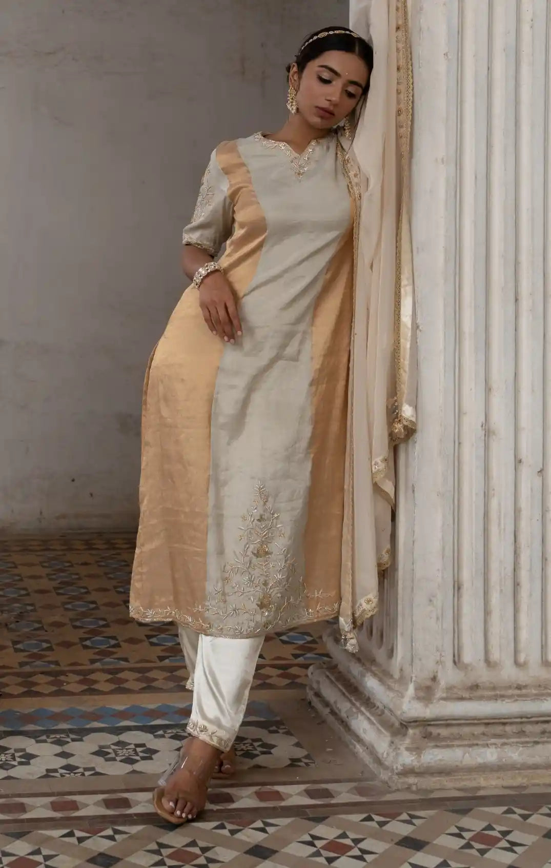 Discover the timeless elegance of our Light Silver and Gold Zari Tissue Embroidered Kurta Set. This enchanting ensemble features a delicately embroidered kurta, crafted from luxurious zari tissue fabric that shimmers with light silver and gold threads. Paired with an ivory embroidered pant and a matching dupatta, this outfit embodies sophistication and grace. Perfect for any special occasion, it combines traditional craftsmanship with contemporary style, making it a must-have addition to your wardrobe.