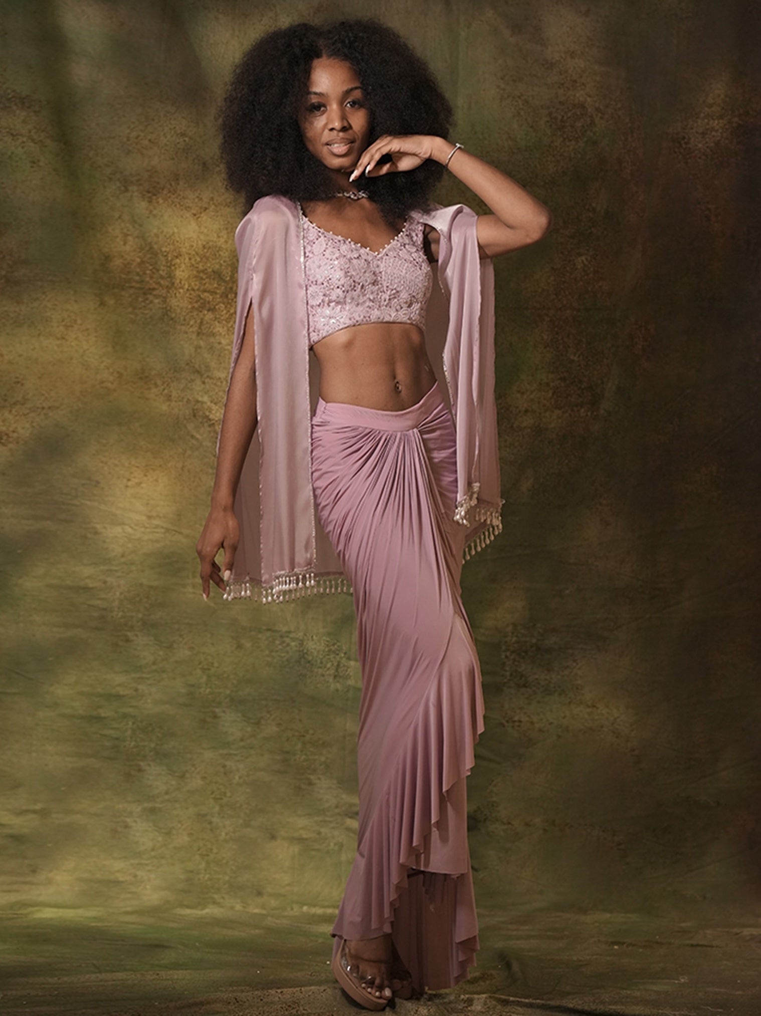 Experience the elegance of pastel lilac with this exquisite outfit, adorned with delicate floral embroidery. The lucknowi blouse features intricate thread work, enhanced with sparkling stones and sequins for a touch of glamour. Paired with an organza jacket and an embellished dhoti, the ensemble effortlessly combines traditional charm with modern sophistication.