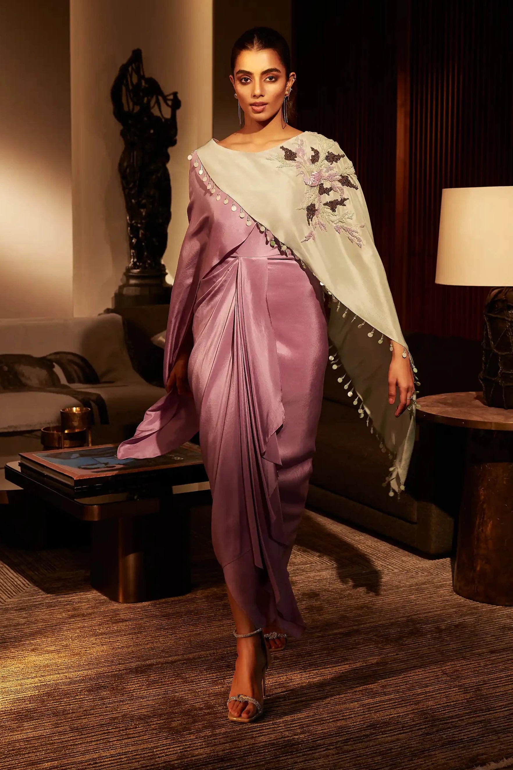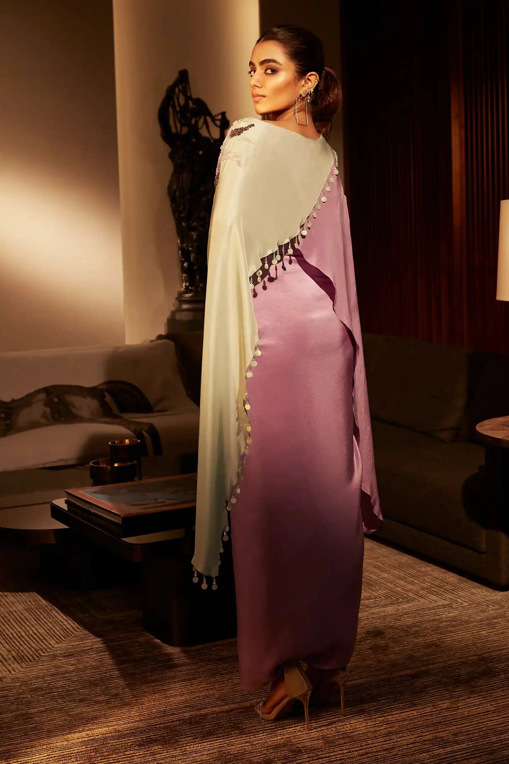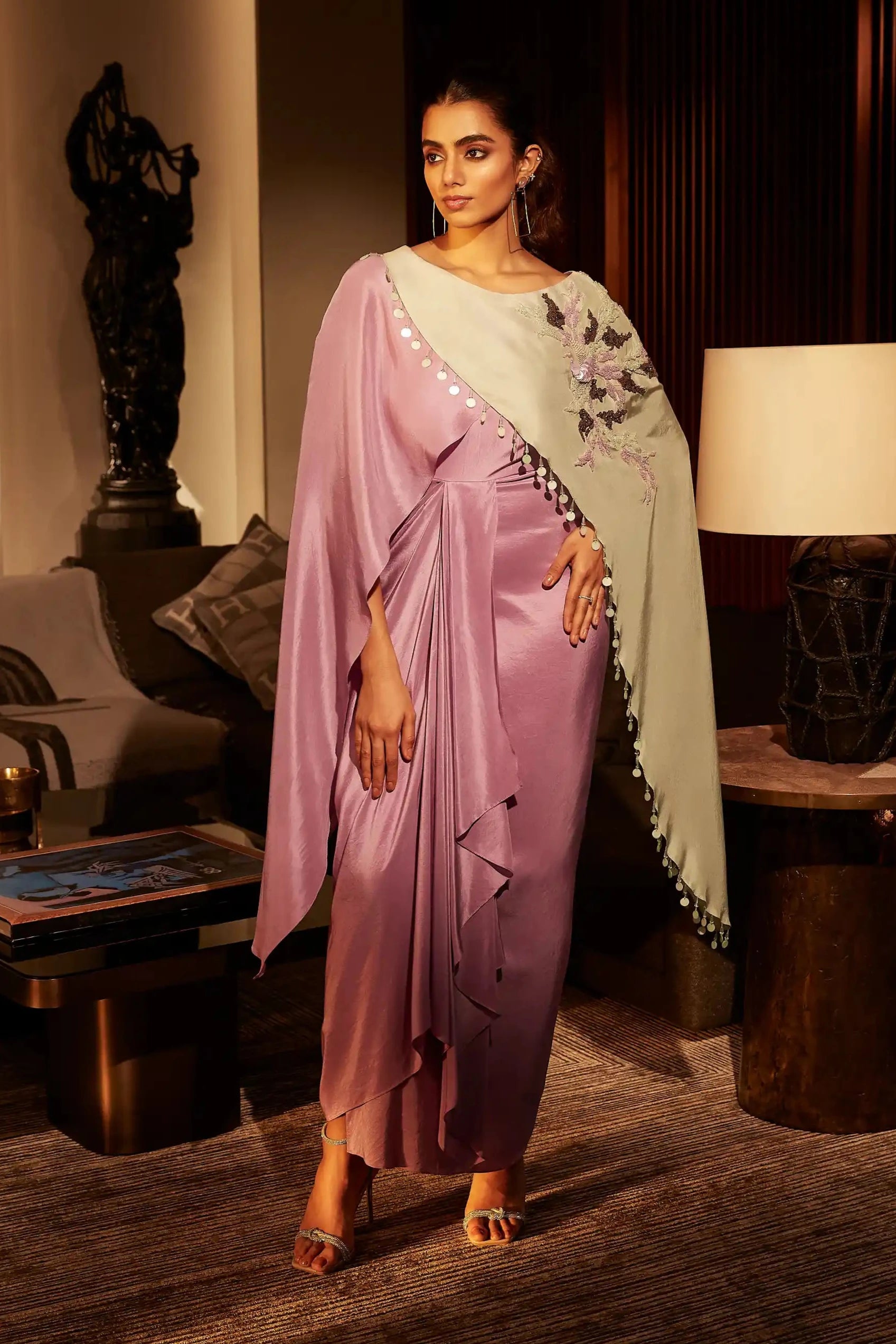 Step into sophistication with this enchanting lilac mist and frosted mint colorblock drape dress, designed to make a statement at any occasion. The elegant color combination creates a fresh and modern look, while the attached cape adds a layer of drama and elegance.