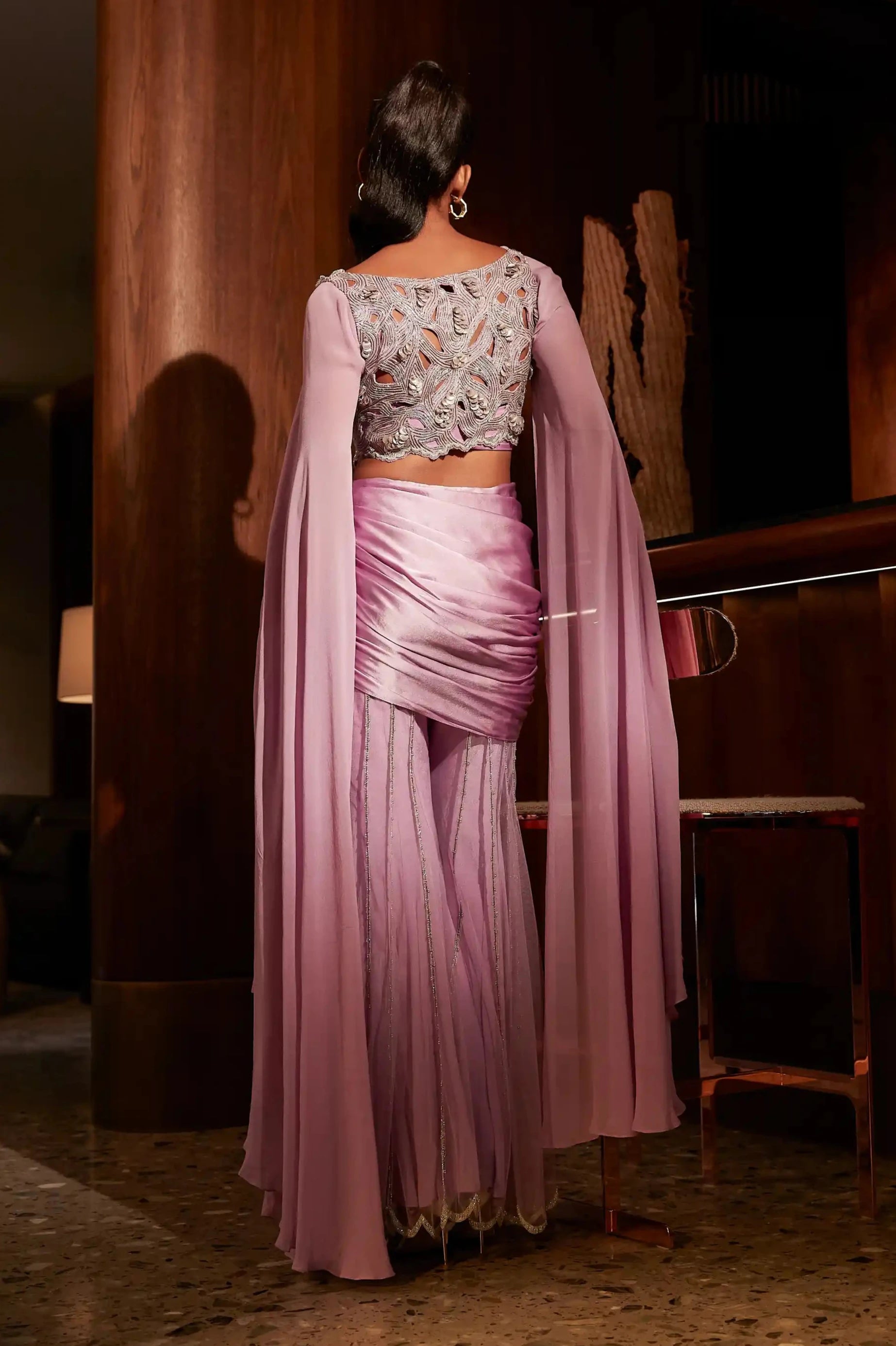 Make a stunning statement with this lilac mist coord set, featuring a chic cutout embroidered vest that showcases intricate detailing. The dramatic slit sleeves add a contemporary flair, elevating your look with elegance and sophistication.