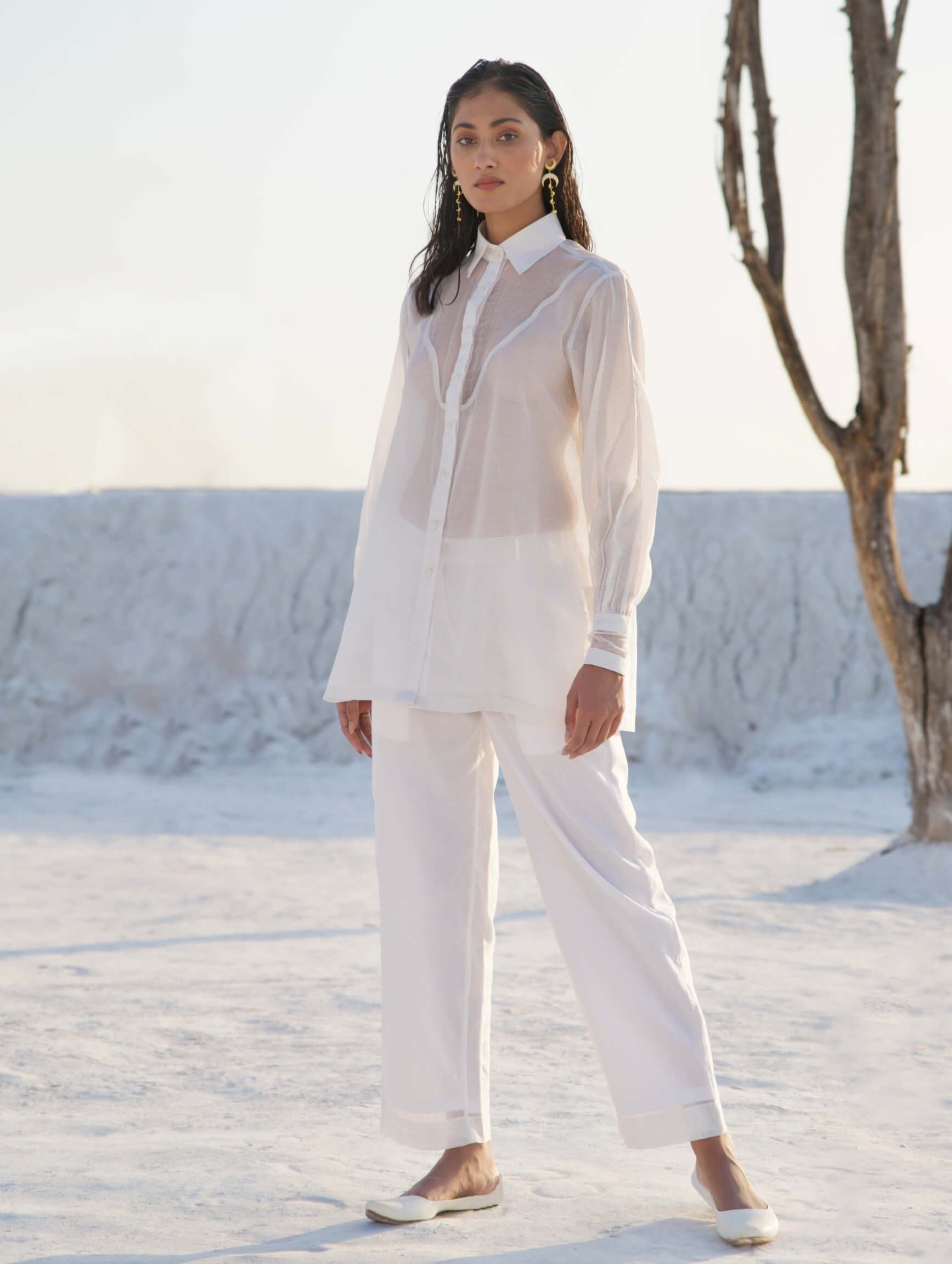 Discover effortless elegance with our breezy asymmetrical bias-cut tunic and matching flowing pants, crafted from luxurious crepe. The tunic features a stylish wave neckline and alternating wavy panels in both crepe and lace, blending texture and sophistication. Perfect for sun-kissed days and balmy evenings, this set transitions seamlessly from daytime adventures to evening relaxation. Embrace a chic, sun-soaked look with this versatile ensemble, designed to enhance your resort wardrobe with refined comfort and vibrant charm.