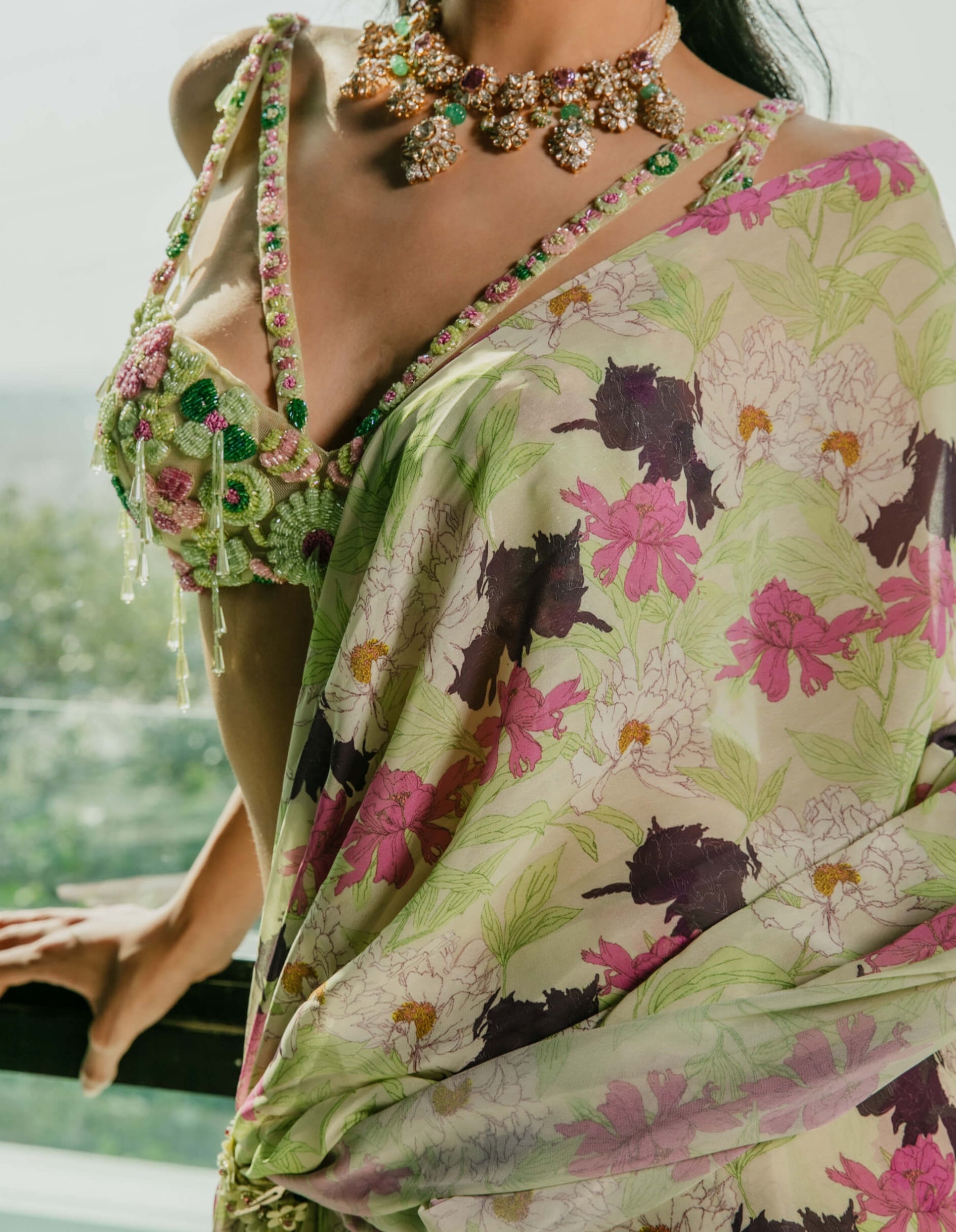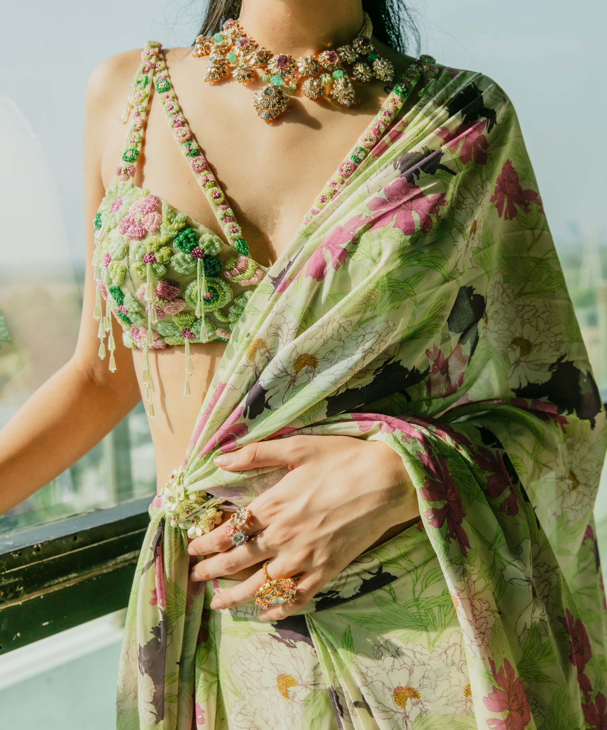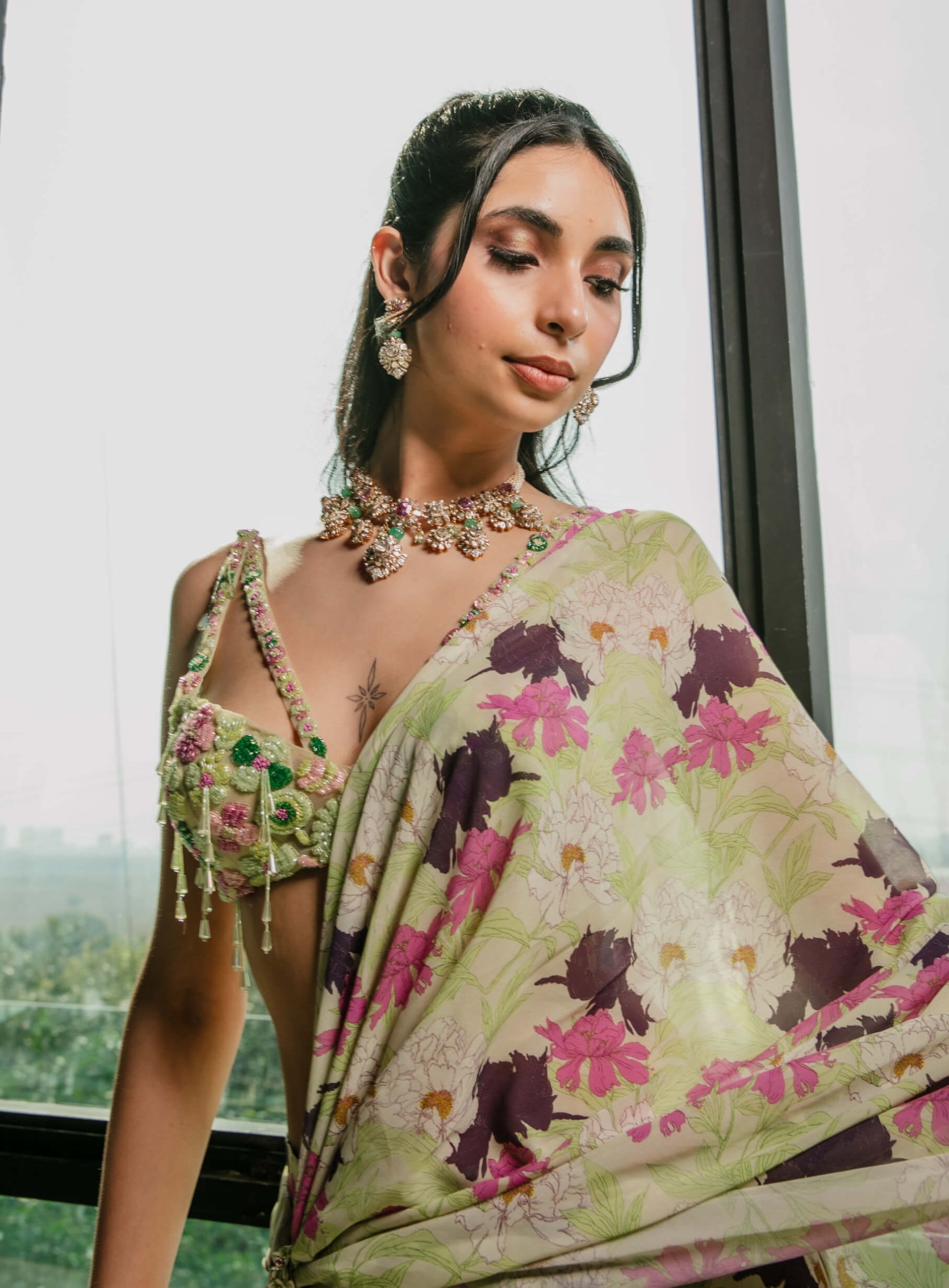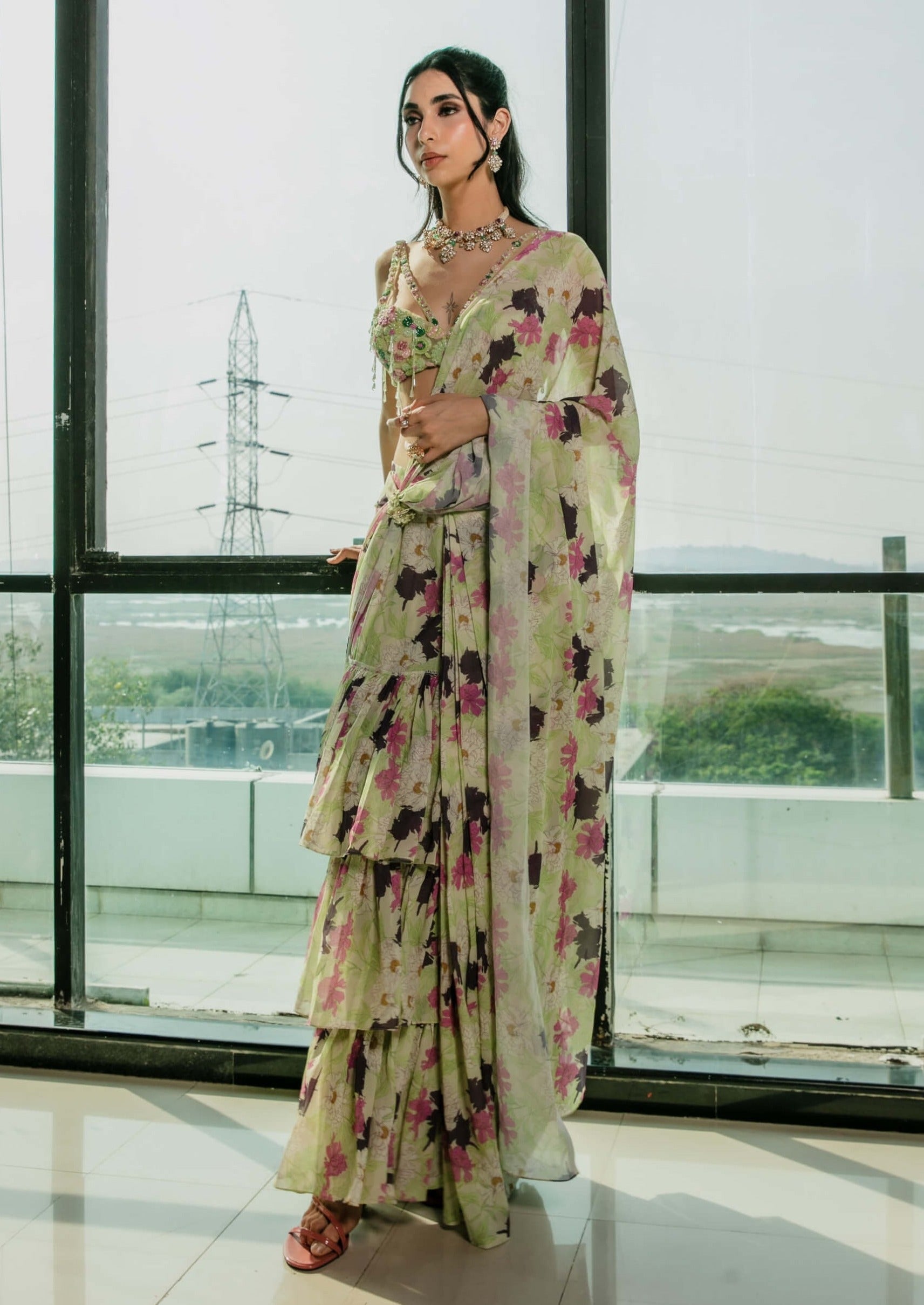 Drape yourself in elegance with our pre-draped ruffle saree, complemented by a cutout embroidered blouse. This ensemble combines effortless style with intricate detailing, featuring a saree that is pre-pleated and ruffled for a modern twist on traditional attire. The cutout embroidered blouse adds a touch of sophistication and allure, enhancing the overall look with its meticulous craftsmanship. Perfect for weddings, receptions, and formal occasions, this outfit promises to make you stand out with its unique design and graceful silhouette. Embrace the beauty of contemporary fashion and traditional elegance with this captivating ensemble that exudes confidence and charm.