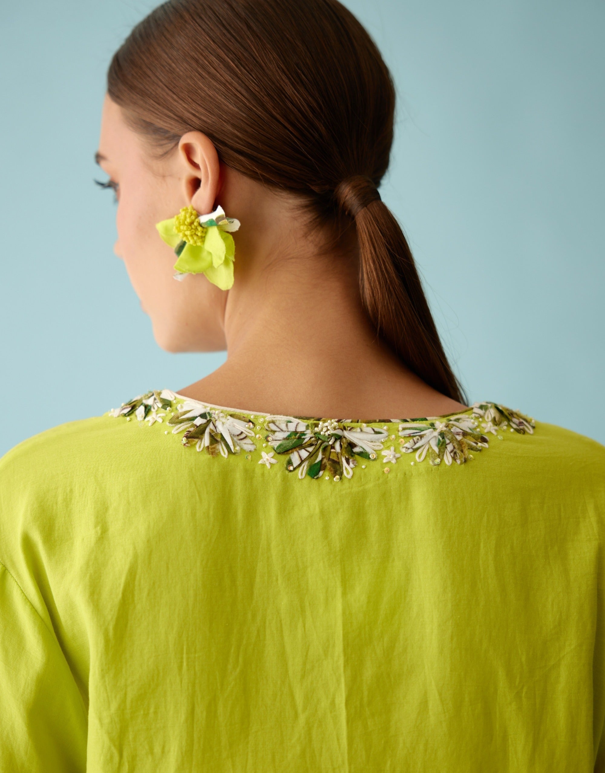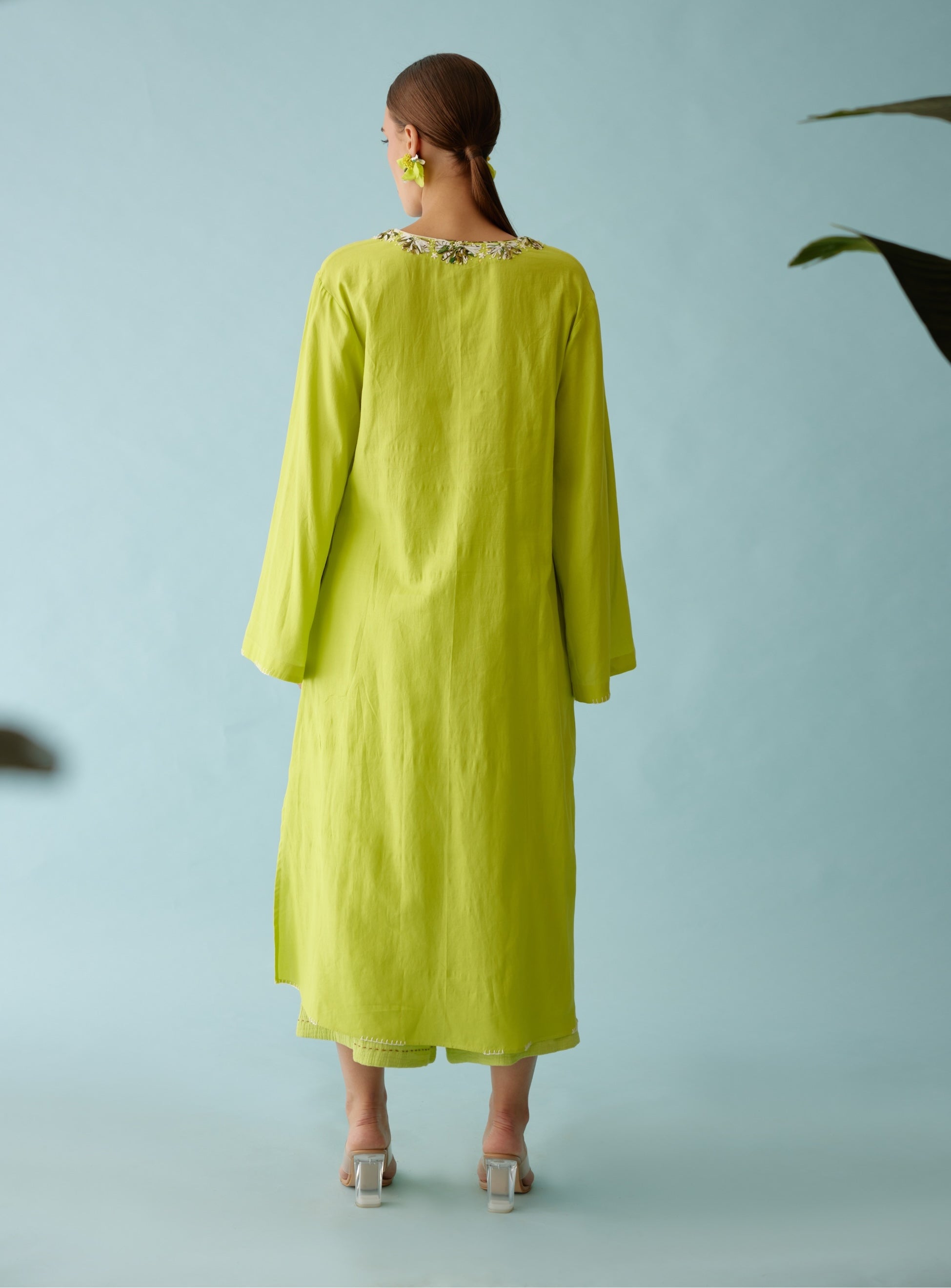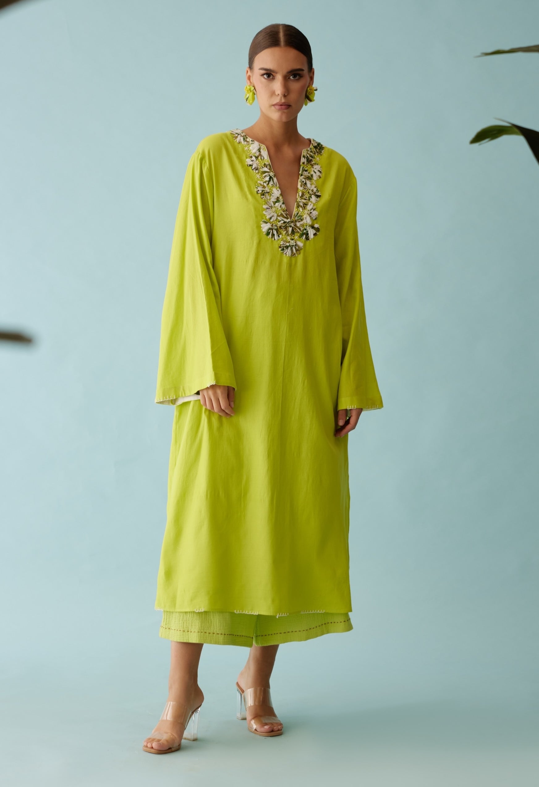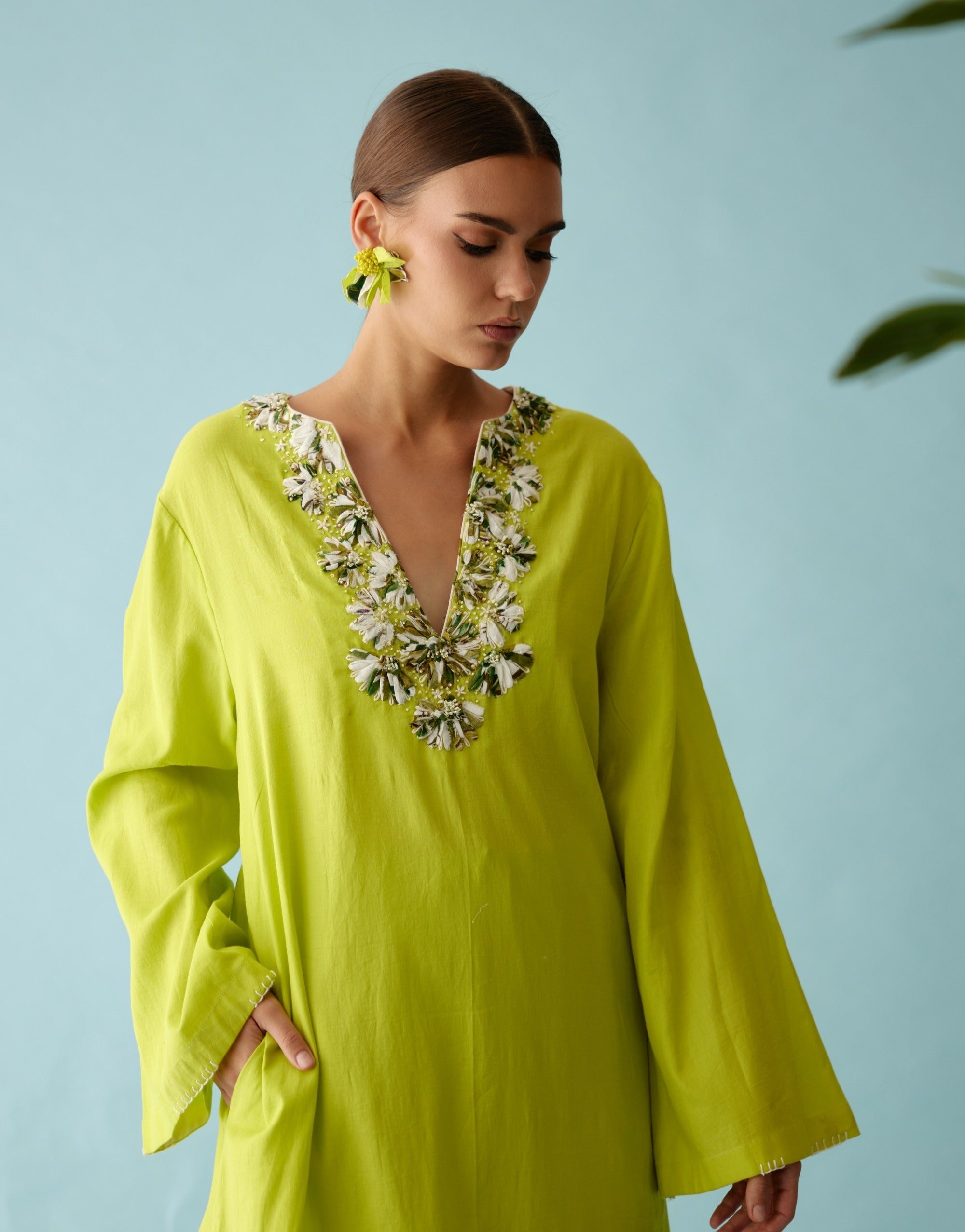 Refresh your wardrobe with our stunning lime green kaftan, featuring exquisite fabric ribbon flower embroidery and intricate hand-stitched details. Crafted from soft, high-quality cotton, this kaftan is paired with matching pants to create a chic and coordinated ensemble. The vibrant lime green color and artisanal embroidery make this outfit perfect for both casual outings and special occasions. Embrace effortless elegance and unique craftsmanship with this beautifully designed kaftan set, ensuring you stand out in style.