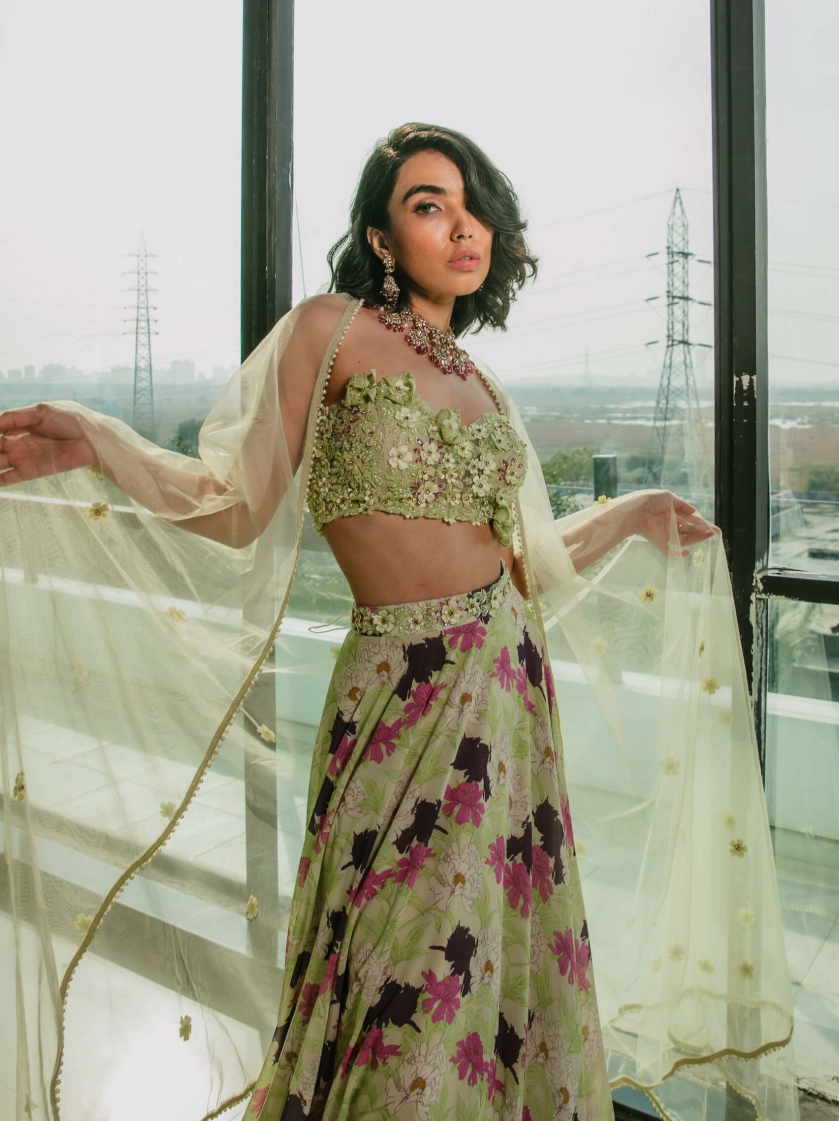 Introducing an exquisite lime green printed lehenga set, paired with a stunning 3d embroidered blouse and a delicate dupatta. This ensemble harmonizes traditional elegance with contemporary flair, showcasing vibrant prints and intricate craftsmanship. The lehenga's lively green hue adds a fresh and lively touch, while the 3d embroidery on the blouse enhances its luxurious appeal. Complete with a sheer dupatta for added grace, this ensemble is perfect for weddings and celebratory events, promising a timeless and graceful look that captures attention with every step. Embrace the beauty of cultural richness and modern design with this captivating outfit, designed to make you feel radiant and poised on your special day.