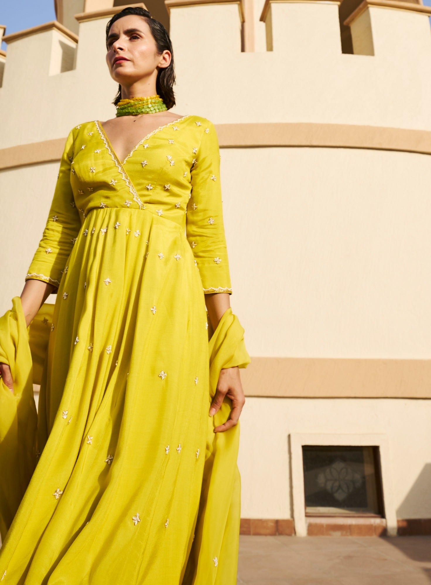 Fabric: Anarkali & palazzo- raw satin, dupatta- viscose organza