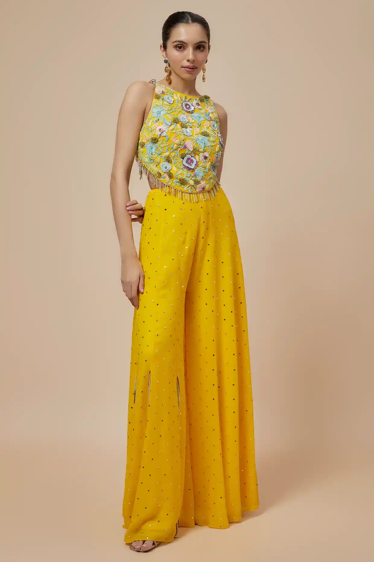 Brighten your wardrobe with this lime yellow georgette embroidered back tie-up choli, perfectly paired with a mukaish georgette sharara. The intricate embroidery on the choli adds a touch of elegance, while the mukaish detailing on the sharara brings a hint of shimmer and sophistication. Ideal for festive occasions and celebrations, this ensemble beautifully blends vibrant color with contemporary design, ensuring you make a memorable impression.