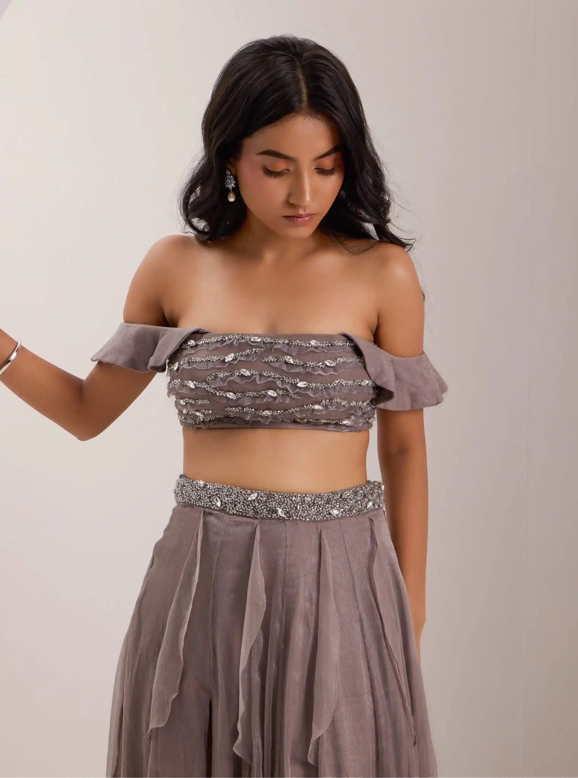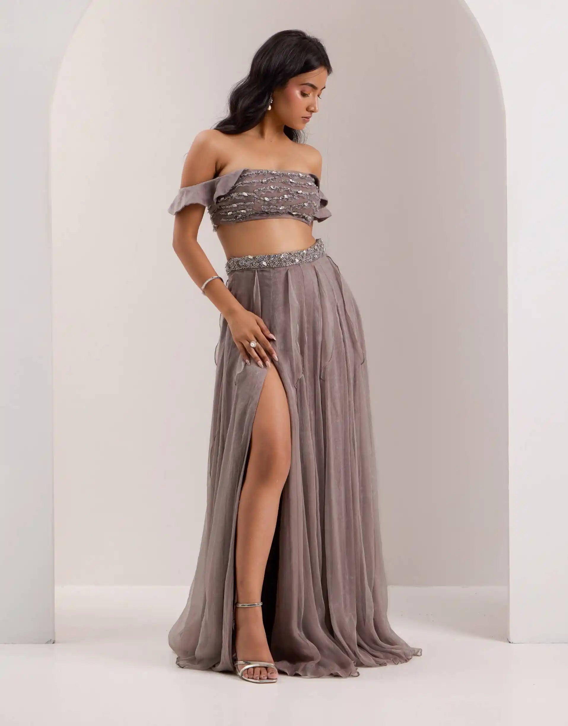 Introducing the lumi off-shoulder crystal work blouse with frill high waisted slit skirt in a chic gray hue. This stunning ensemble features exquisite mix media embroidery and dazzling crystal work, creating a sophisticated yet eye-catching look. The off-shoulder blouse elegantly showcases your neckline, while the frill high-waisted slit skirt adds a playful touch and enhances your figure.