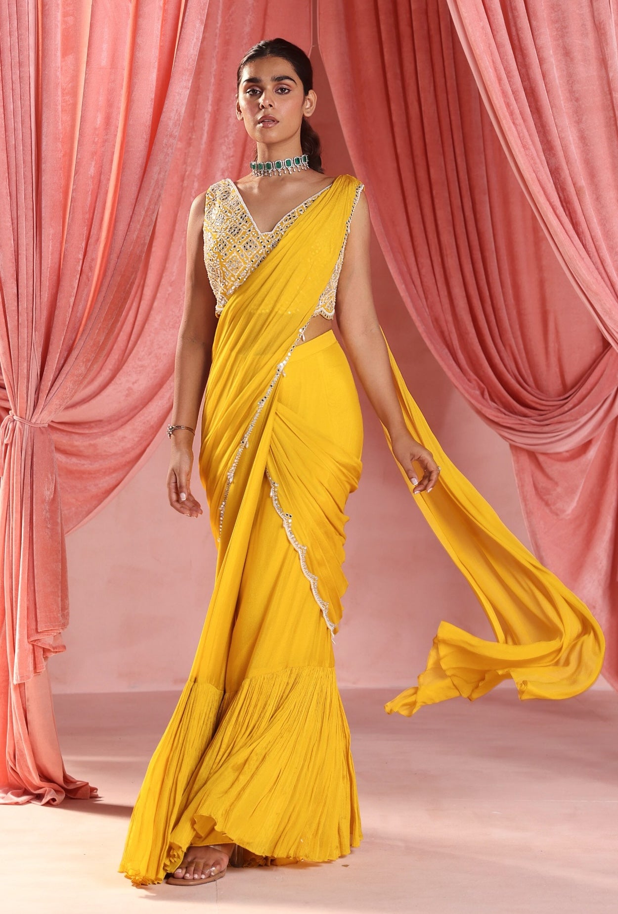 Luna mustard yellow pre-stitched tiered saree and blouse