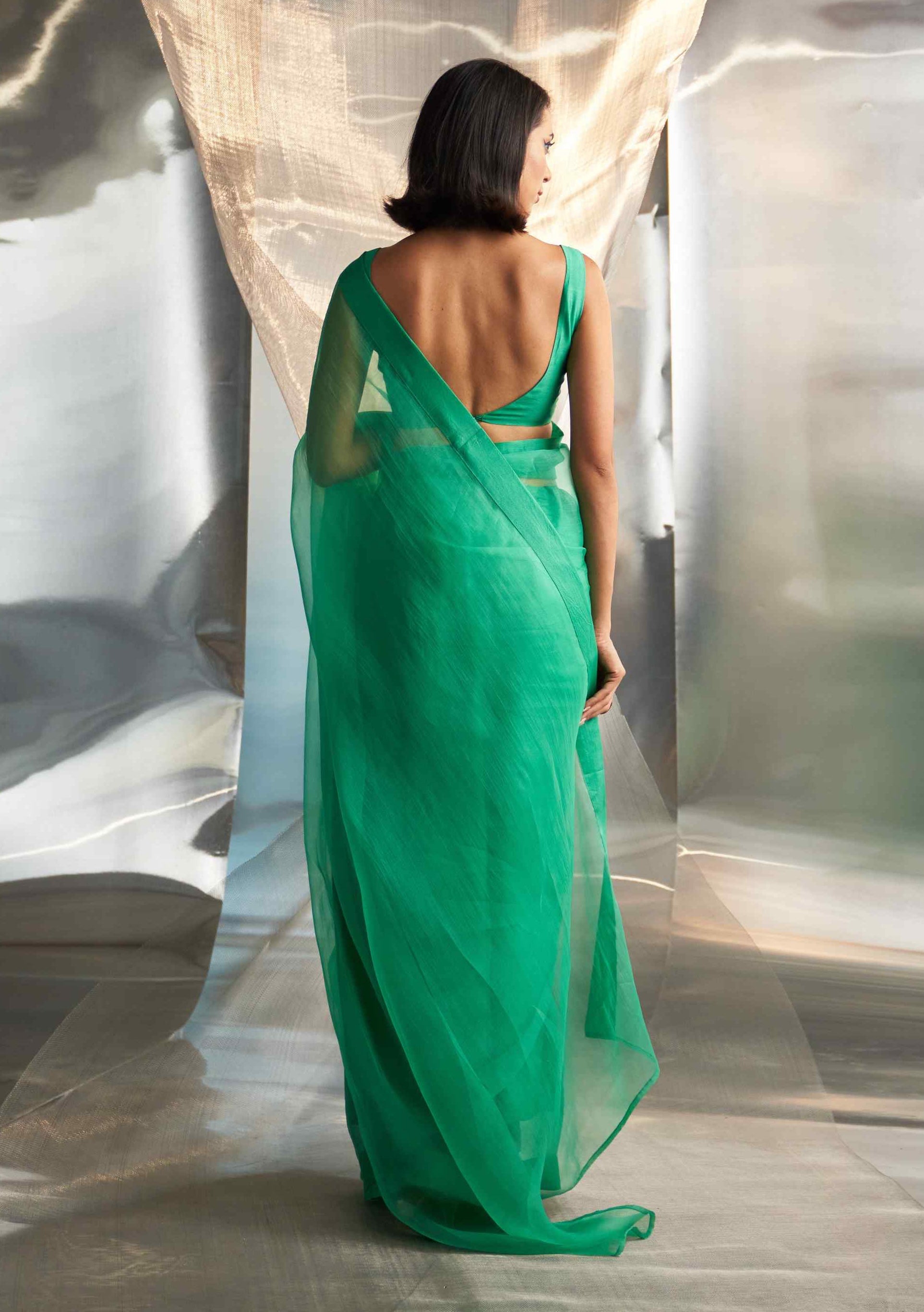 A green saree adorned with embroidery on the pleats represents a stunning traditional Indian ensemble. Crafted from exquisite green fabric, this saree features intricate embroidery with diverse patterns and designs, adding unmatched elegance and charm. Perfect for special occasions like weddings, festivals, or cultural events, it seamlessly combines classic tradition with modern style. This timeless and graceful saree is an ideal choice for making a memorable statement with your attire.