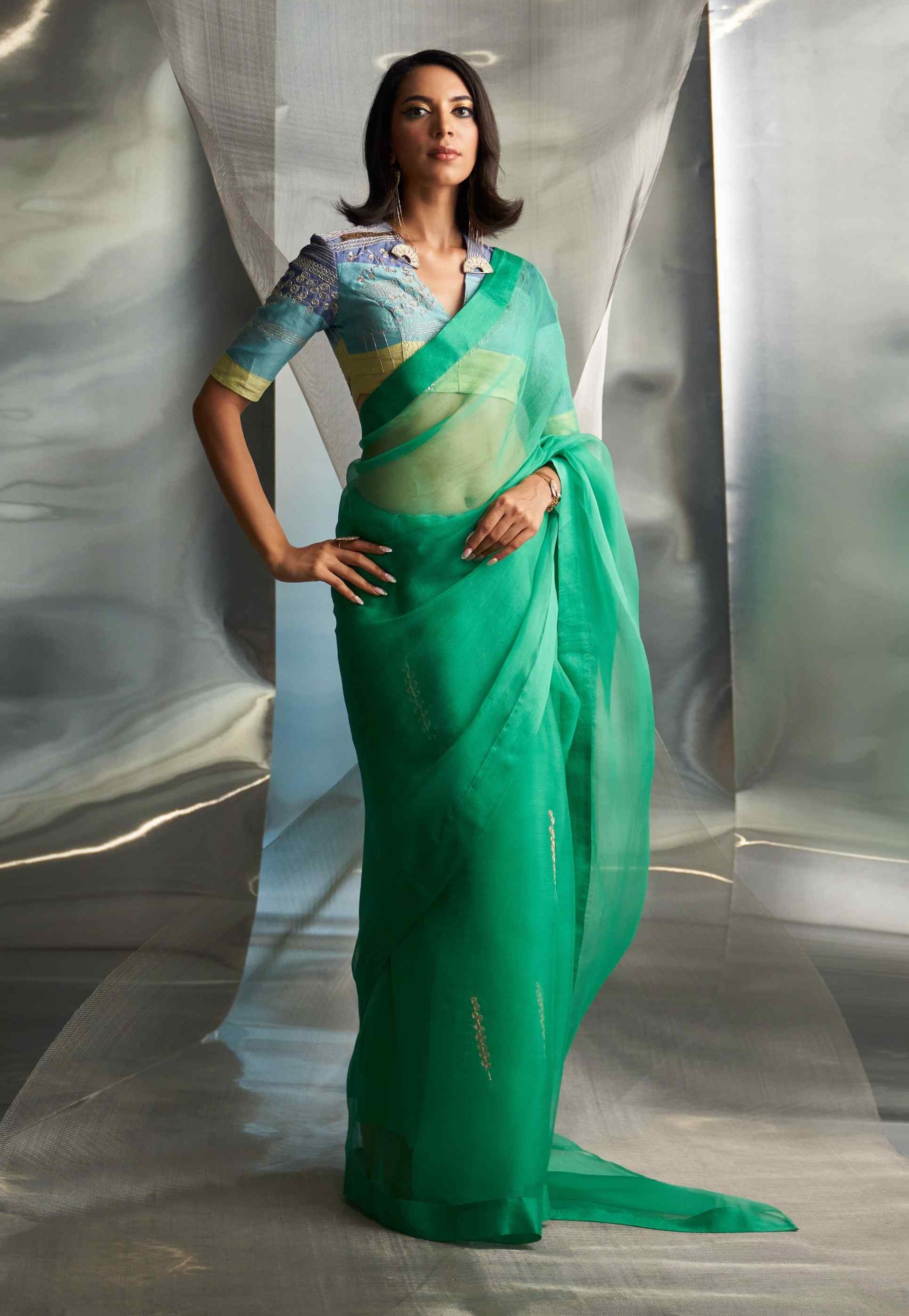 Embrace regal elegance with our green saree, crafted from luxurious fabric and adorned with intricate embroidery on the pleats. Paired with a blouse available in three vibrant colors, each featuring unique embroidery, this ensemble combines traditional charm with a modern twist. Ideal for making a grand statement, this saree reflects timeless grace and the dignified poise of royalty.