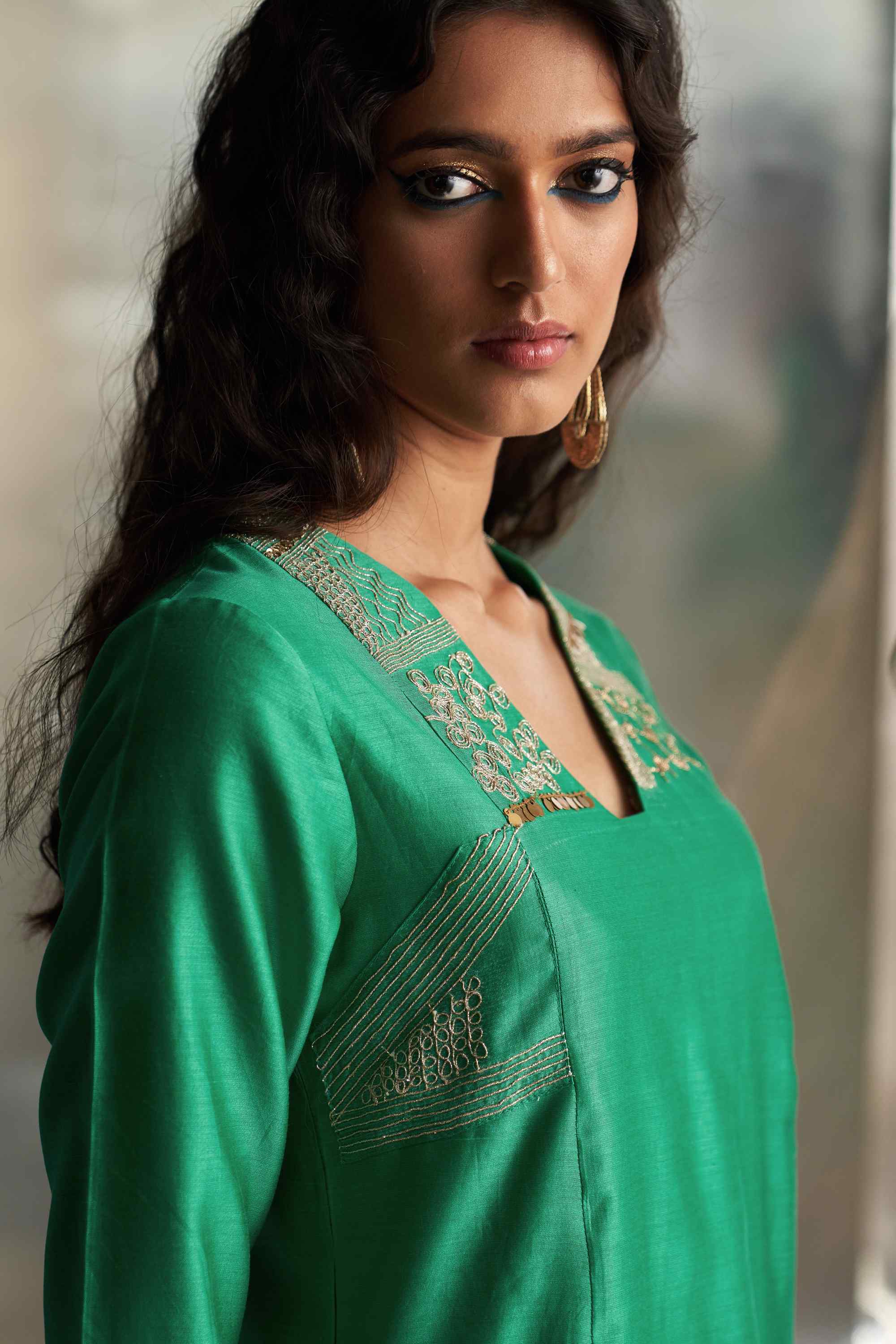 This kurta is adorned with intricate embroidery inspired by the symbols of pharaonic regalia on the neckline and side panels, weaving a tapestry of regal elegance. Paired with an embroidered dupatta featuring vibrant contrasting panels and gold-polished edge hangings, this ensemble is perfect for any occasion, blending sophistication with a touch of cultural grandeur.