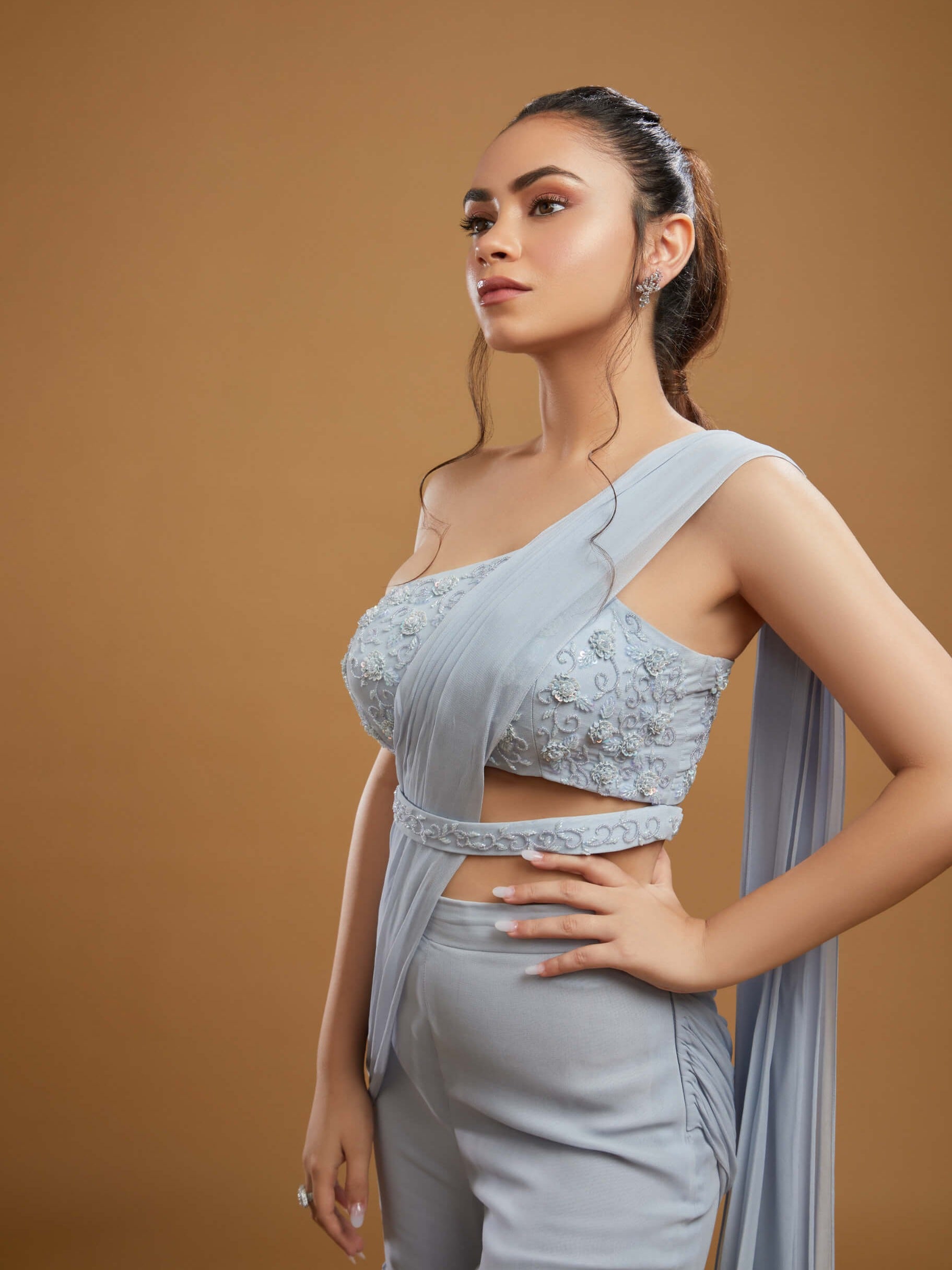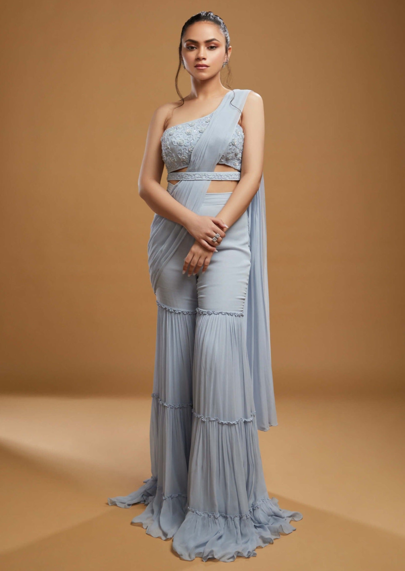Meet Mae, a stunning sharara set that combines tradition with a modern edge. This ensemble features an elegant attached drape and an asymmetric one-shoulder blouse, designed to make a statement. The intricate embellishments of seed beads, glass beads, and sequins are meticulously applied over a luxurious georgette base, adding a touch of sparkle and sophistication. Completing the look is a chic belt that cinches the waist, enhancing the overall silhouette. Mae is perfect for those who seek a blend of classic charm and contemporary flair, ensuring you stand out with grace and style.