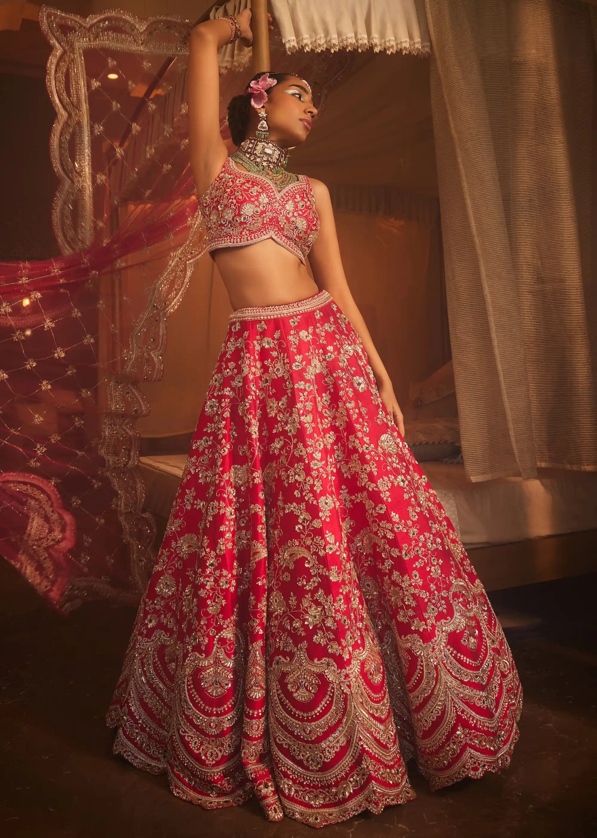 Introducing the magnum lehenga, a breathtaking cherry red raw silk creation that embodies opulence and sophistication. This exquisite lehenga is adorned with intricate zardosi hand embroidery throughout, showcasing a rich and detailed design that exudes traditional elegance.