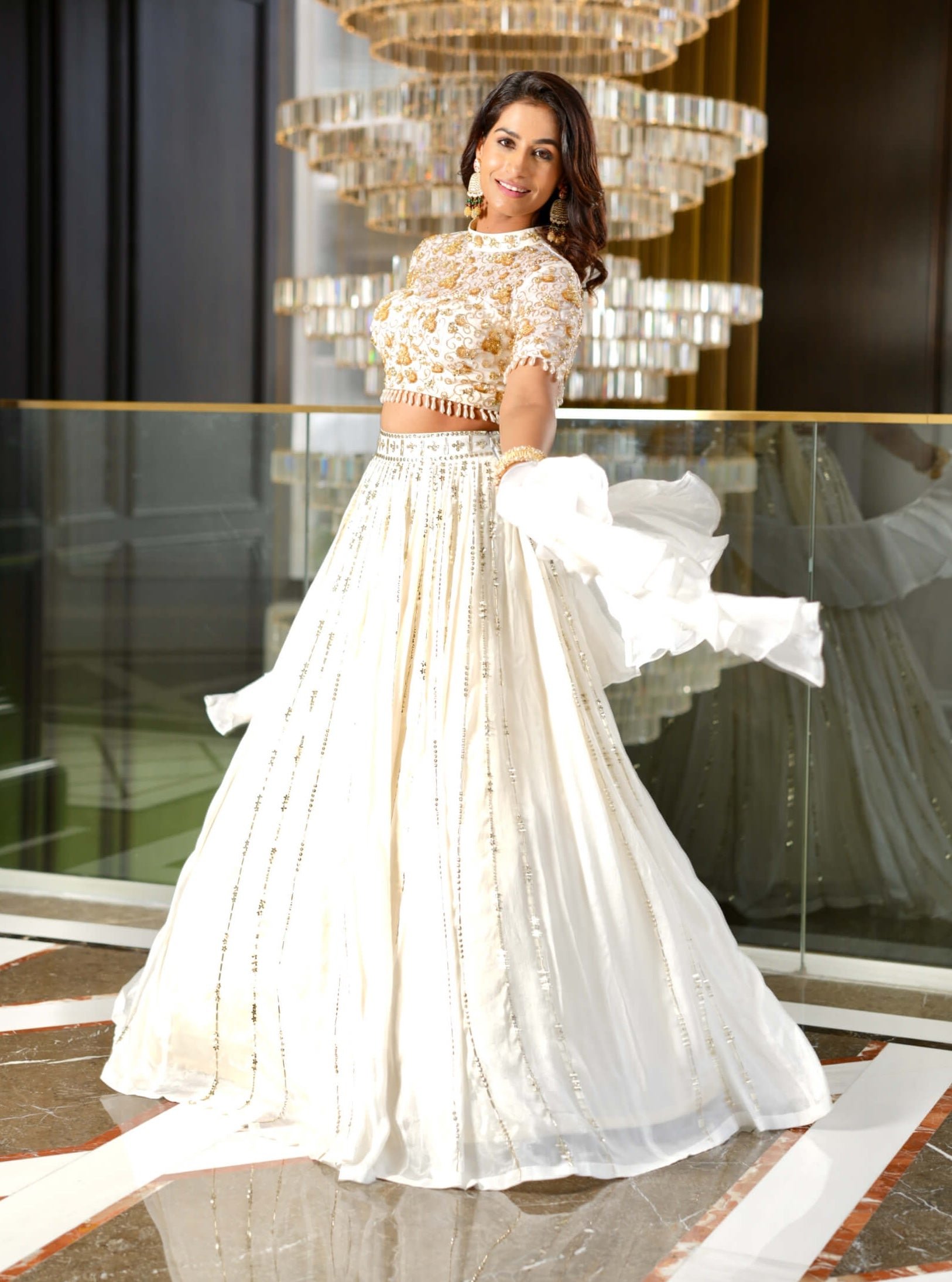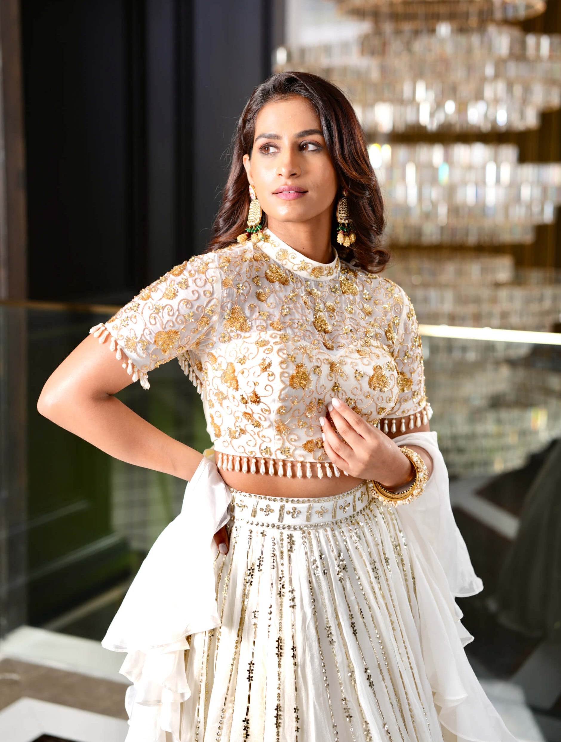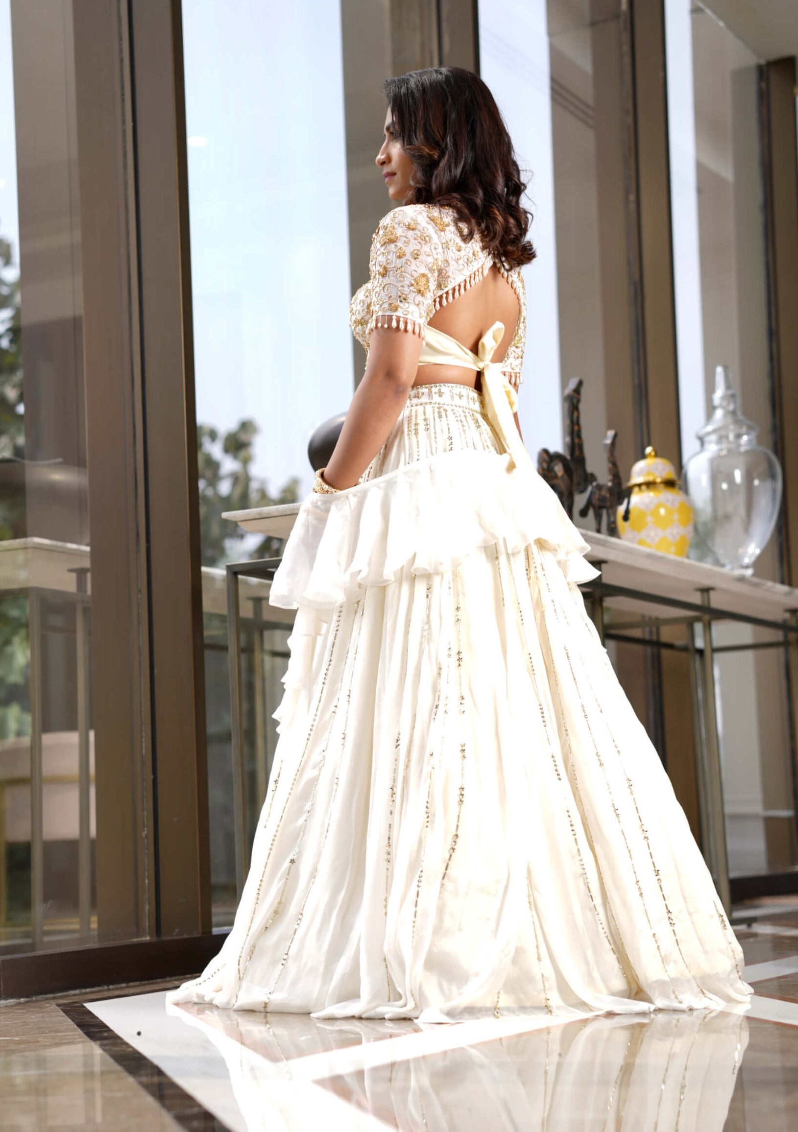 Discover elegance redefined with the white hand embroidered chiffon lehenga set. The chiffon lehenga, adorned with intricate hand embroidery, exudes grace and sophistication with every swirl. Paired perfectly, the hand-embroidered organza blouse features delicate detailing that adds a touch of timeless beauty to the ensemble. Complete your look with the organza ruffled dupatta, adding a hint of whimsical charm and elegance to this exquisite outfit. Ideal for weddings and special occasions, this ensemble seamlessly blends traditional craftsmanship with contemporary design, ensuring you stand out with grace and refinement.
