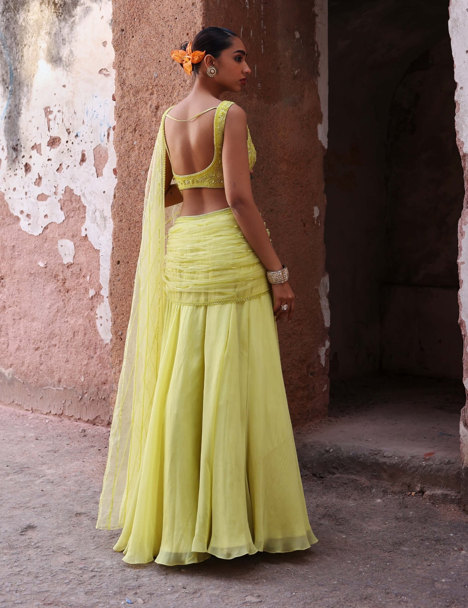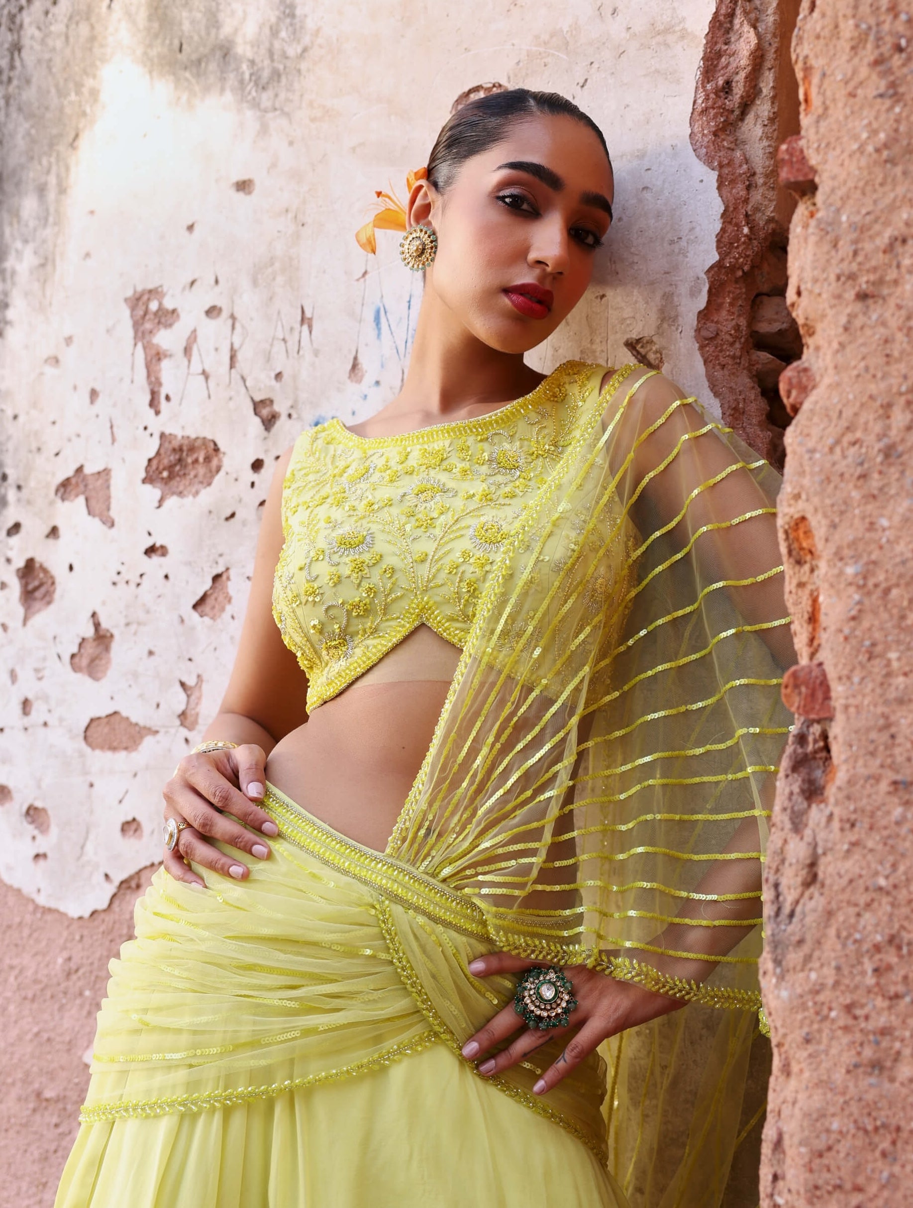 The mahi neon green embellished choli is perfectly paired with a circular skirt featuring can-can for added volume, complemented by a pre-draped dupatta adorned with intricate embellishments. This vibrant ensemble beautifully blends traditional charm with modern style, making it an ideal choice for festive occasions and celebrations, ensuring you stand out with elegance and grace.