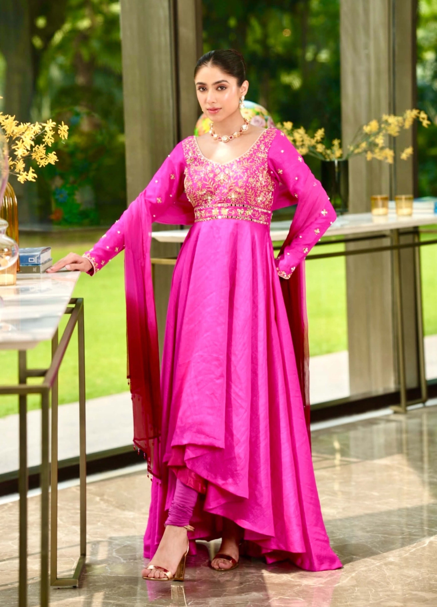 Step into elegance with the hand embroidered nyasa silk asymmetrical anarkali. This exquisite piece features intricate hand embroidery that adds a touch of timeless beauty and sophistication. Paired with a comfortable cotton lycra churidaar, this ensemble offers both style and ease of movement. Complete the look with the ombre dyed chiffon dupatta, adorned with tassel details, adding a whimsical charm and enhancing the outfit's grace. Ideal for weddings and special occasions, creation combines traditional craftsmanship with modern design, ensuring you radiate elegance and refinement with every wear.