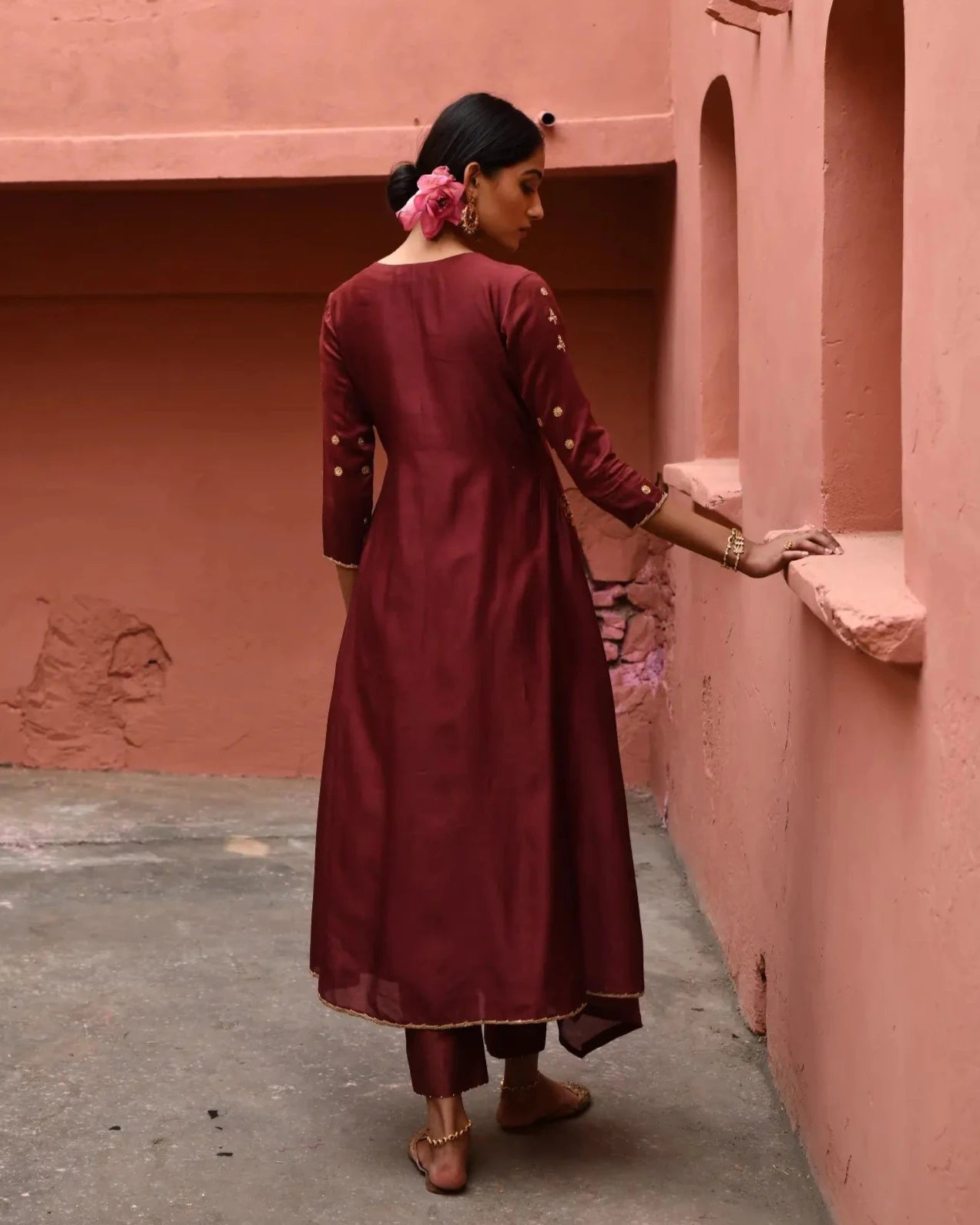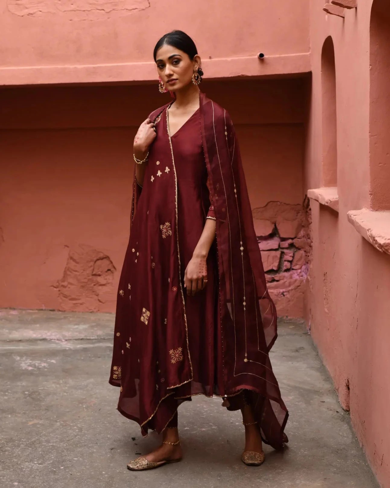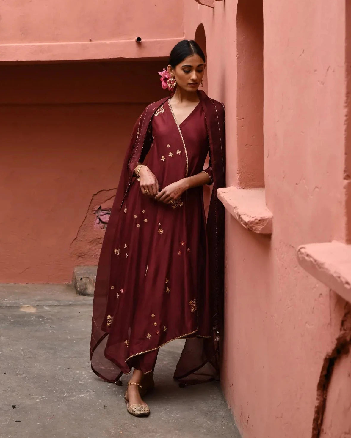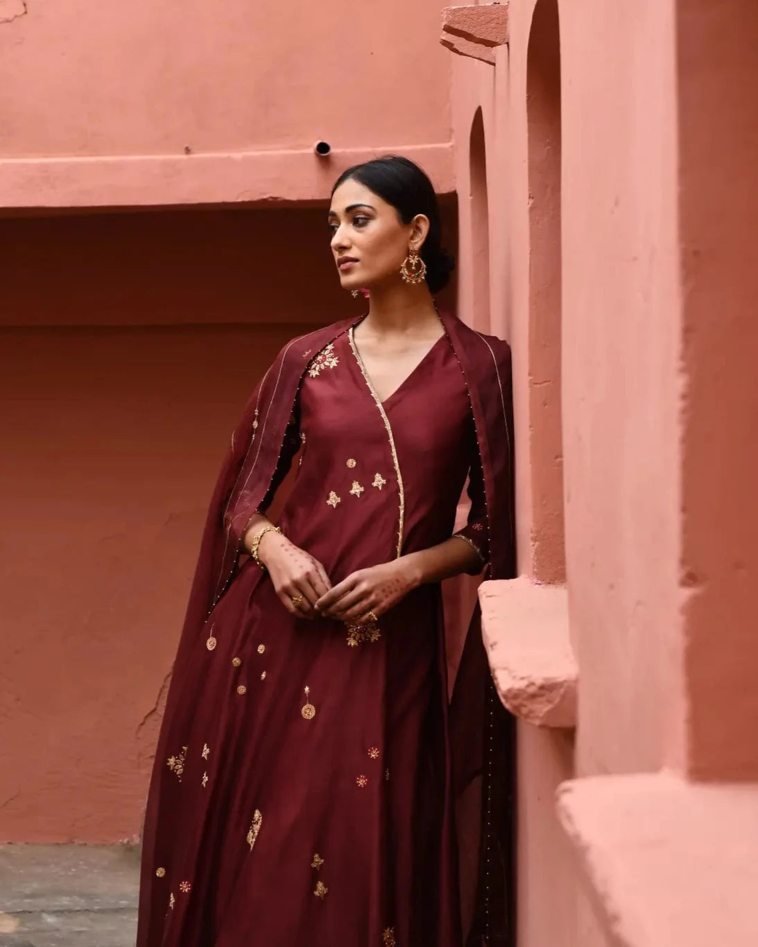 This elegant mahogany crossover kurta features a beautifully embroidered front panel adorned with a mix of boota designs in luxurious zari, zardosi, and resham. The intricate detailing creates a stunning visual effect, making it perfect for festive occasions or special gatherings. Paired with straight pants for a sleek silhouette, the ensemble is complemented by a dupatta featuring three exquisite embroidered boxes, adding an artistic touch. This outfit seamlessly blends traditional craftsmanship with modern style, making it a versatile and sophisticated addition to any wardrobe.