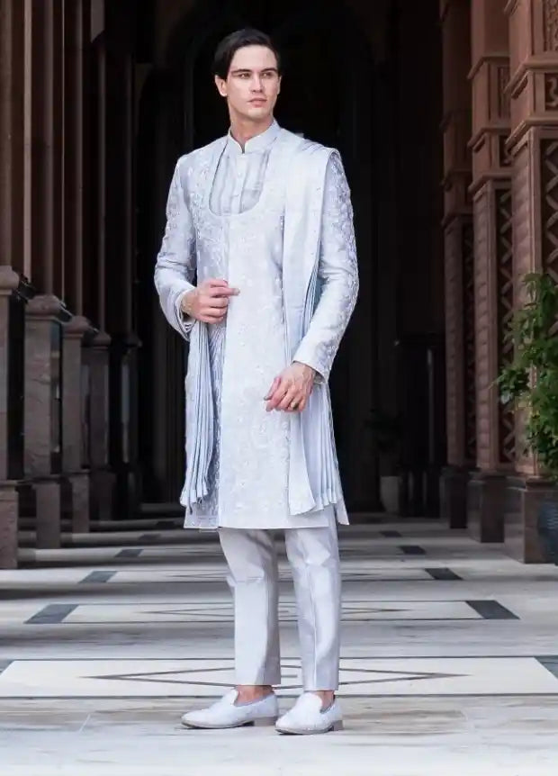Step into a realm of regal elegance with our silver grey menswear outfit, a masterpiece of refined design and craftsmanship. This distinguished set includes a sherwani, kurta, pants, and a matching dupatta, all crafted from luxurious vegan raw silk in a sophisticated silver grey hue. The sherwani features a unique neckline, meticulously designed to impart a regal and distinguished look. Adorned with subtle zari work and sophisticated hand embroidery, the outfit showcases intricate detailing that enhances its luxurious appeal.