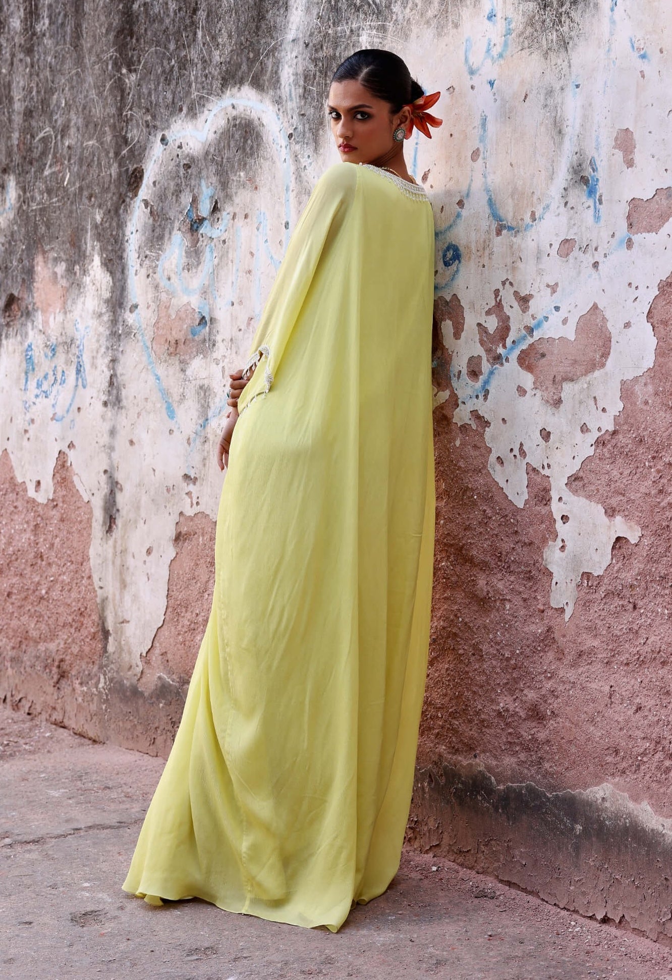 The manat neon green full-length draped embellished kaftan is a showstopper, featuring stunning embellishments that add a touch of glamour. With its flowing silhouette, this vibrant piece offers both comfort and style, making it perfect for special occasions. Elevate your wardrobe with this bold and elegant kaftan that guarantees you’ll stand out.