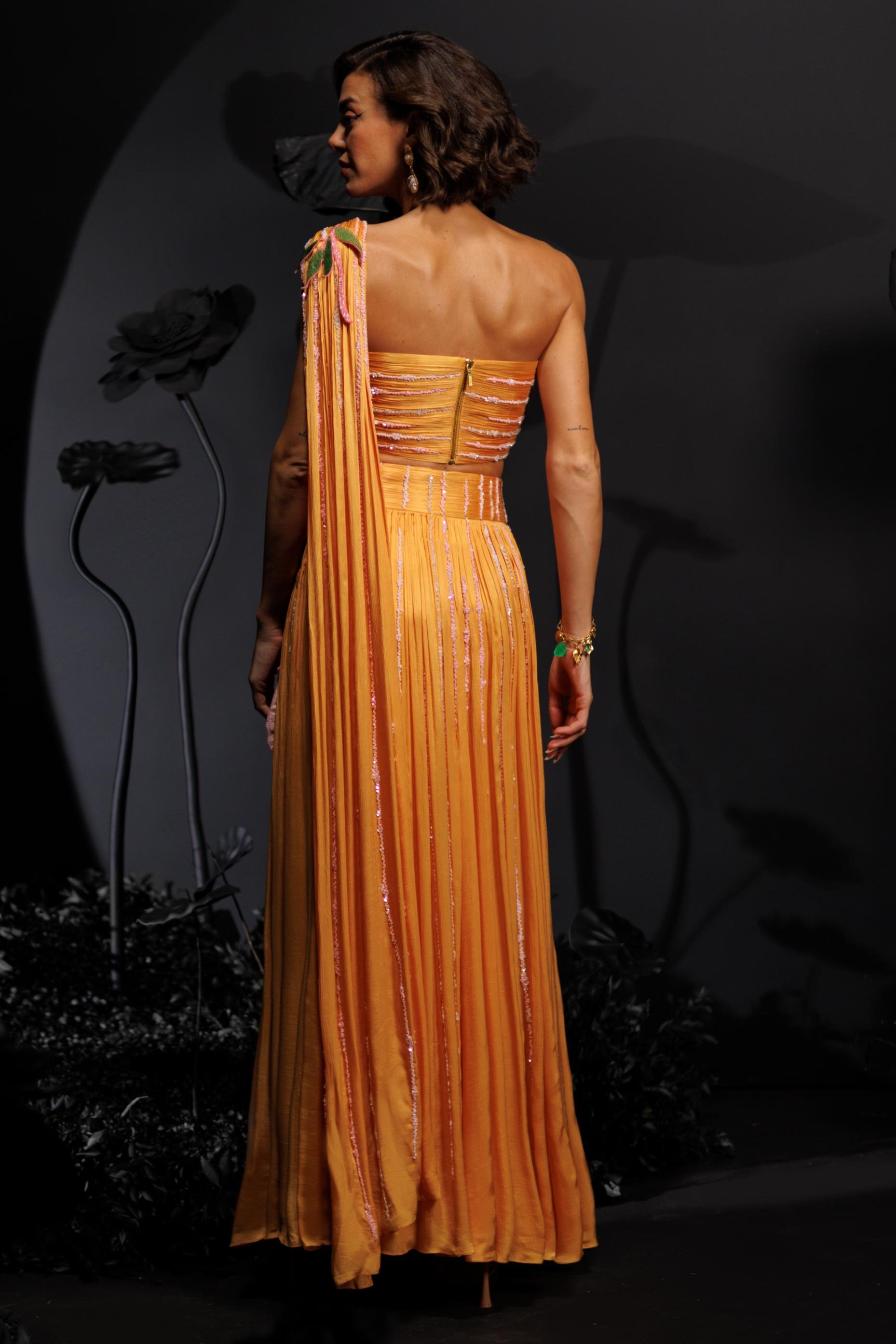 The Golden Hour Drape Lehenga from Nautanky is a vibrant two-piece ensemble, featuring sequined lines and bold floral details. Perfect for Haldi or Mehendi ceremonies, its bright mango yellow hue and festive embellishments make it ideal for daytime events. The sleeveless design offers a chic, elegant look, making it the perfect choice for celebratory occasions filled with joy and color.