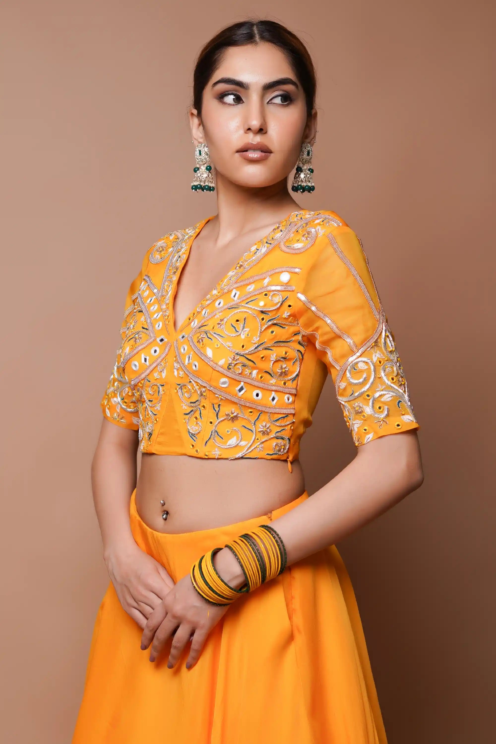 This mango yellow bustier is adorned with intricate jaal handwork, highlighted by shimmering zardosi and mirror accents. The D-cut lehenga offers an invisible belt and pockets for added practicality. The outfit is designed with a V-neckline, making it a captivating blend of traditional charm and modern elegance, perfect for celebrations.