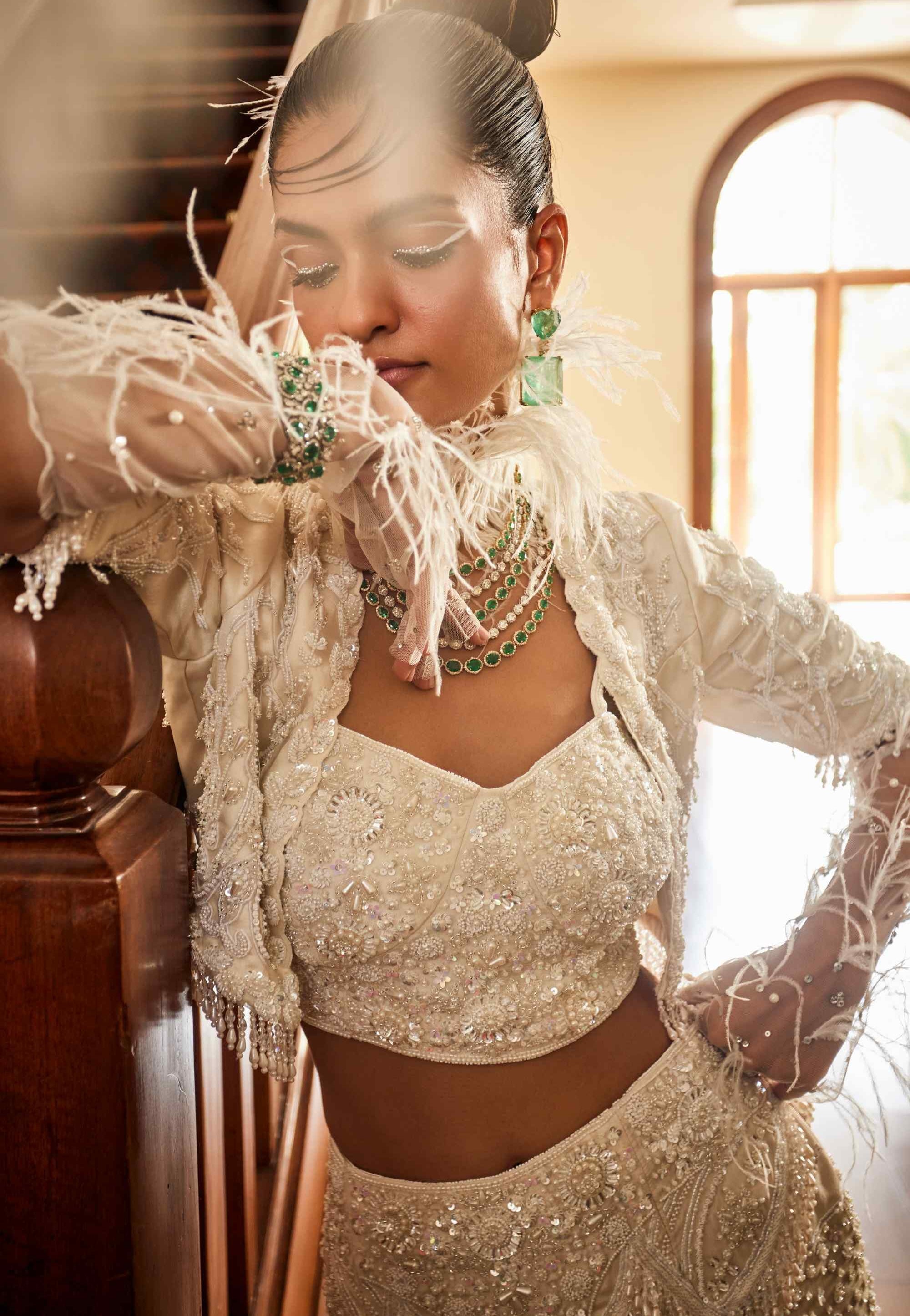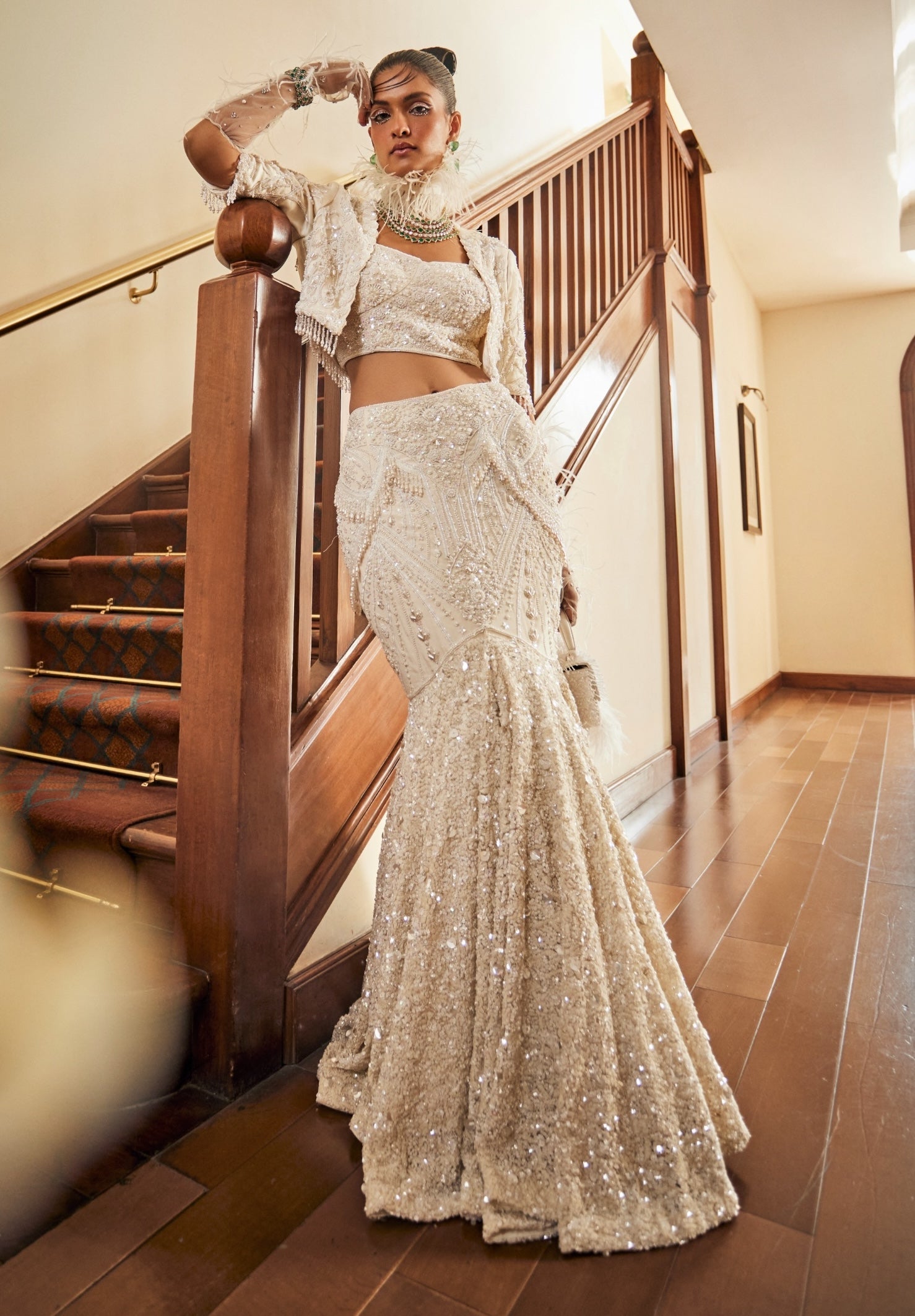 This elegant set features a stunning ivory shrug adorned with intricate embroidery in pearls, cutdana, sequins, and resham, creating a luxurious and sophisticated look. The shrug is paired with a chic bustier that complements its opulent detailing. Completing the ensemble is a mermaid lehenga, embroidered with sequins and resham, which enhances the outfit with a touch of shimmer and refinement. This set beautifully combines detailed craftsmanship with modern elegance, making it perfect for a memorable appearance at any special occasion.