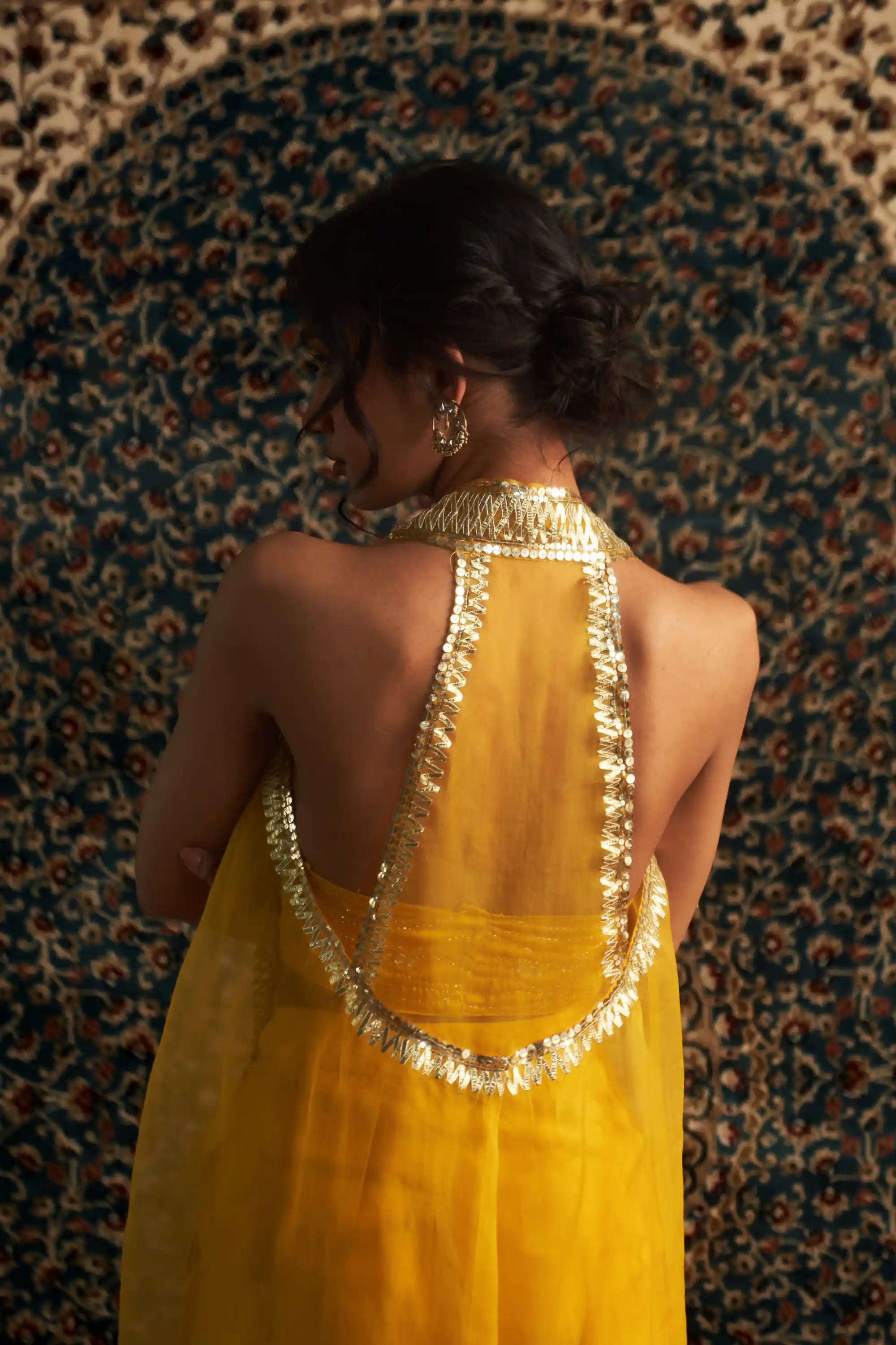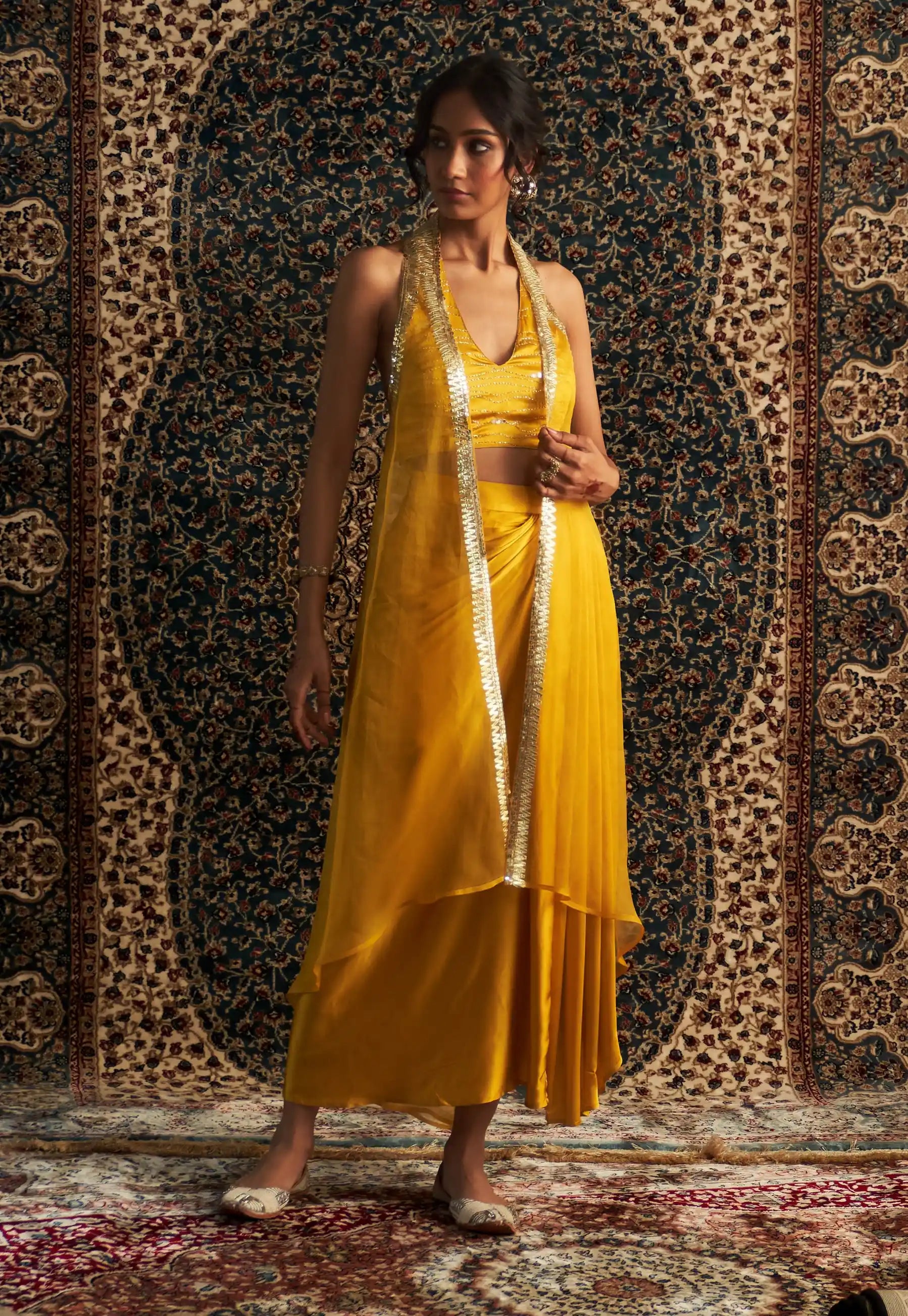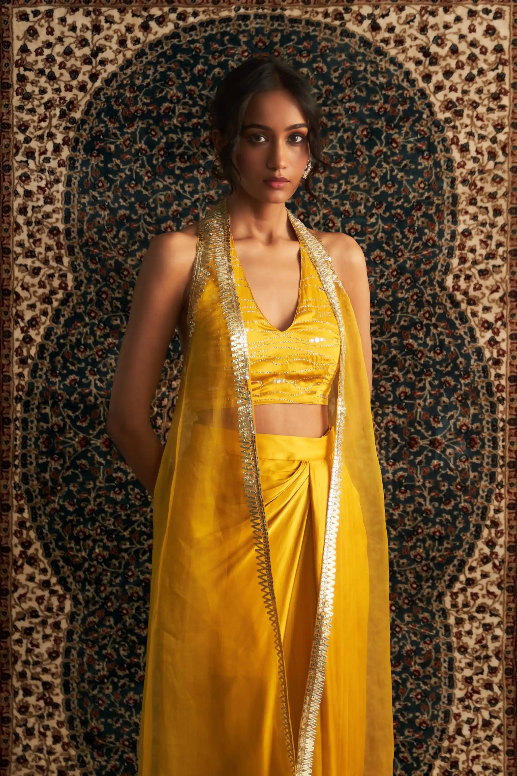This ensemble epitomizes elegance for any special occasion, showcasing a fully embroidered marigold halter neck top paired with a beautifully draped skirt. The sleeveless sheer organza overlay, enriched with an ornate border, adds a touch of opulence to the look.