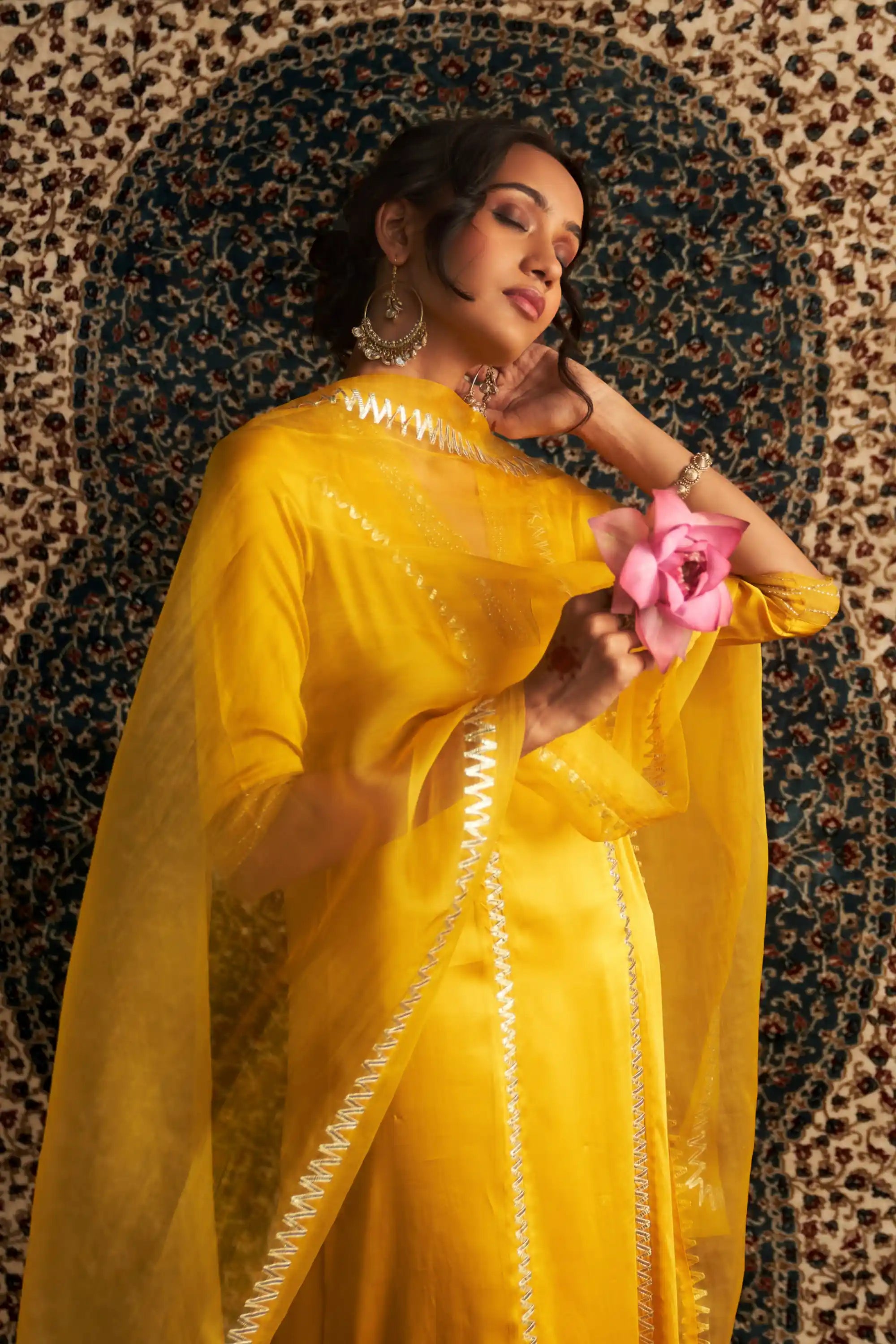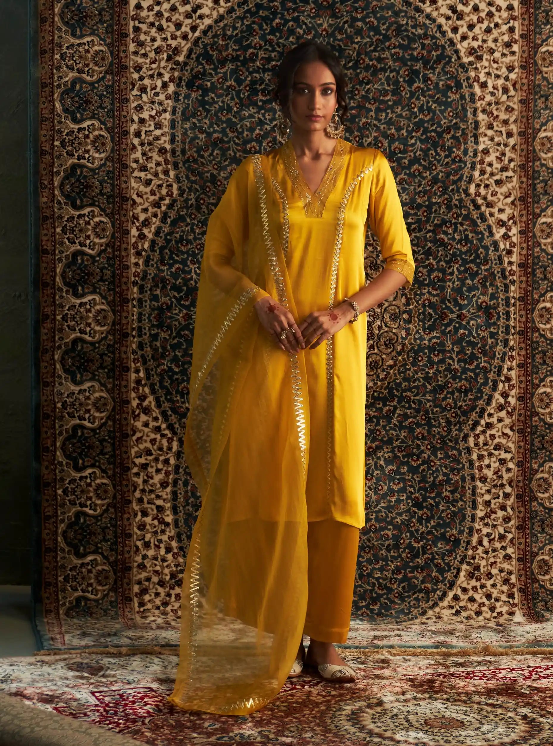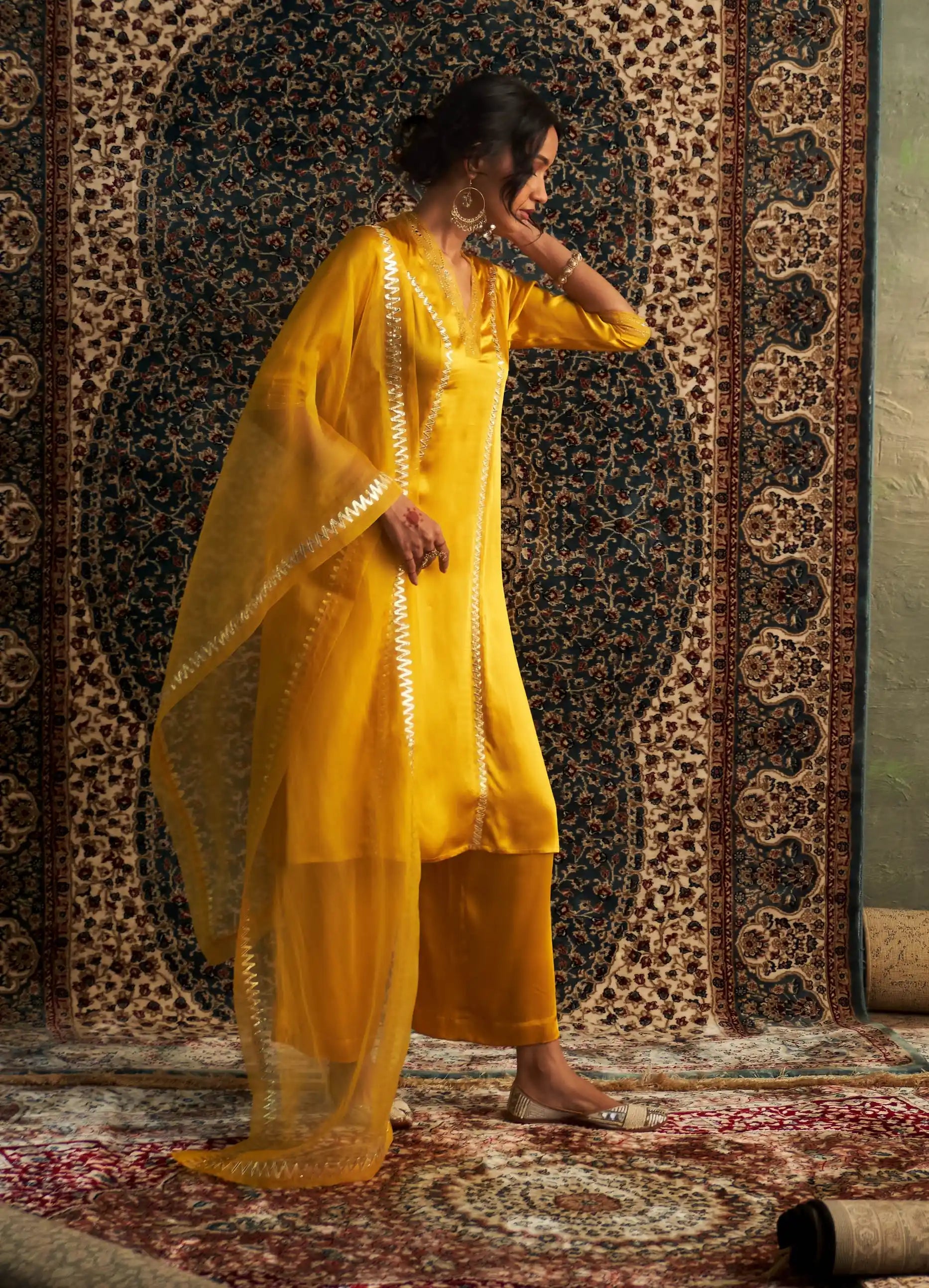 This marigold kurta is a stunning fusion of craftsmanship and comfort, elegantly blending tradition with modernity. The delicate organza neckline, adorned with intricate embroidery, elevates the overall look, while the princess panels featuring gota detailing create a flattering and relaxed silhouette.