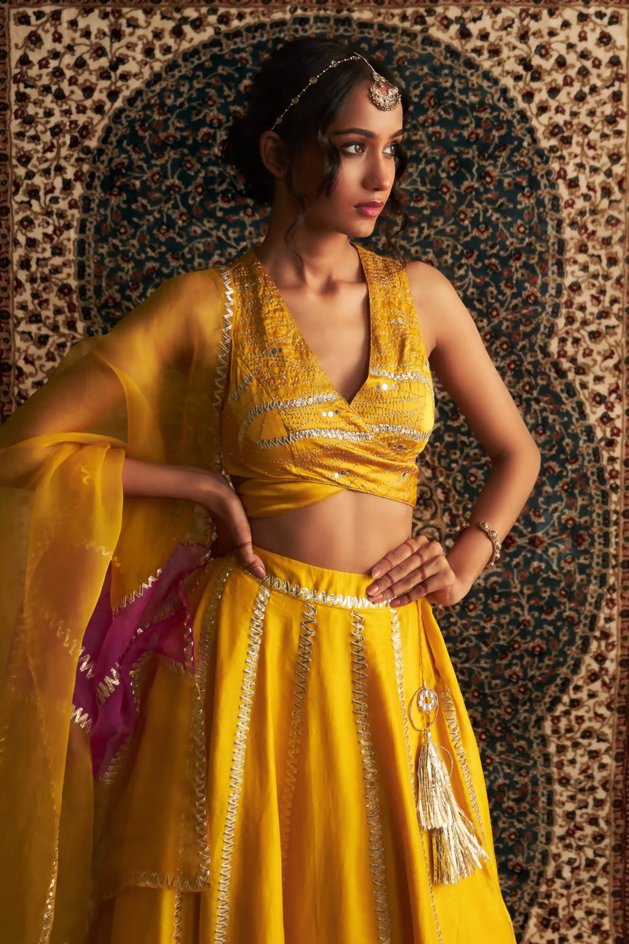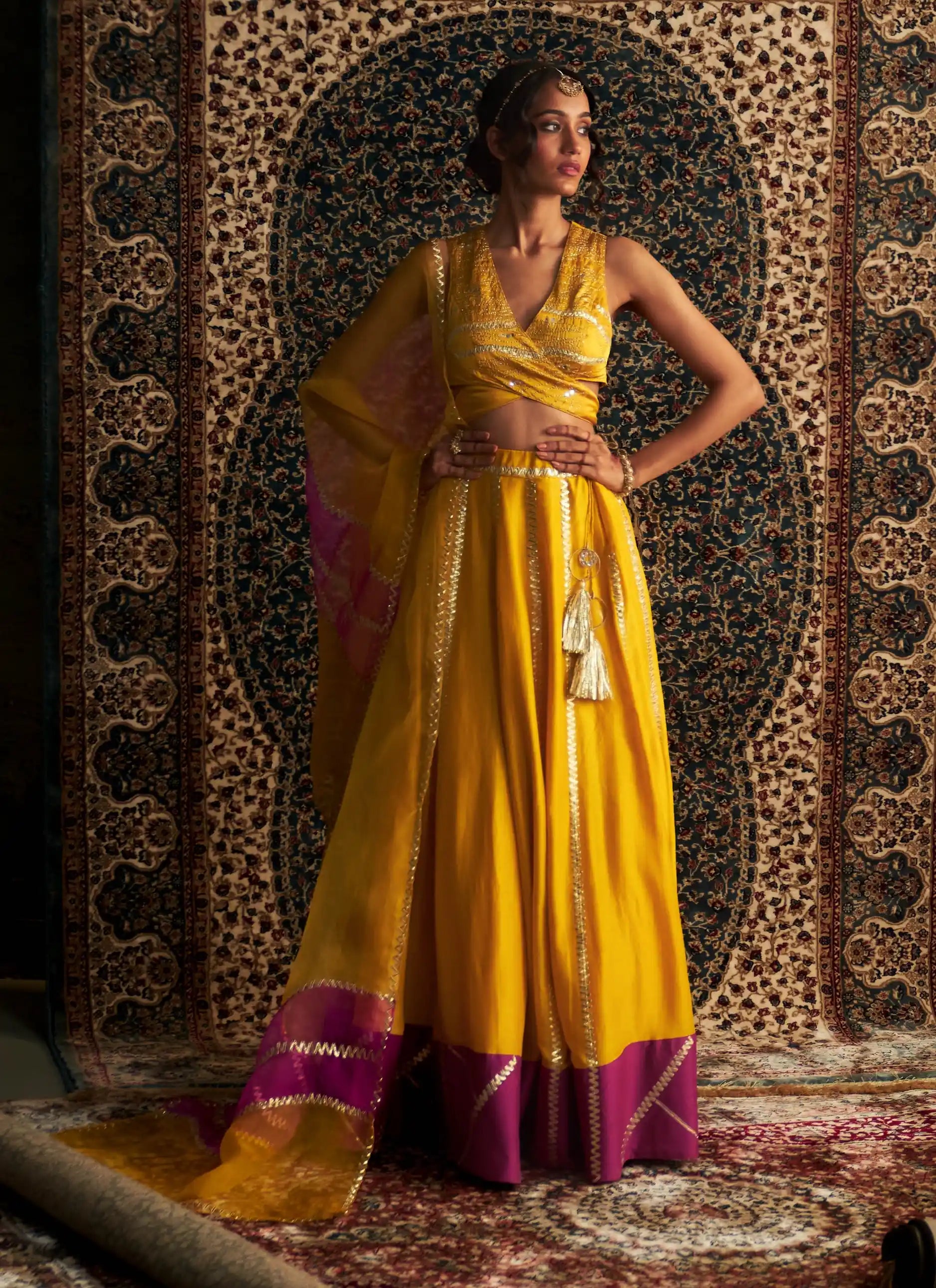 Perfect for any special occasion, this set exudes a regal presence, ensuring admiration wherever you go. The lehenga, adorned with exquisite tassels, sways gracefully, adding a sense of opulence and charm to the ensemble.
