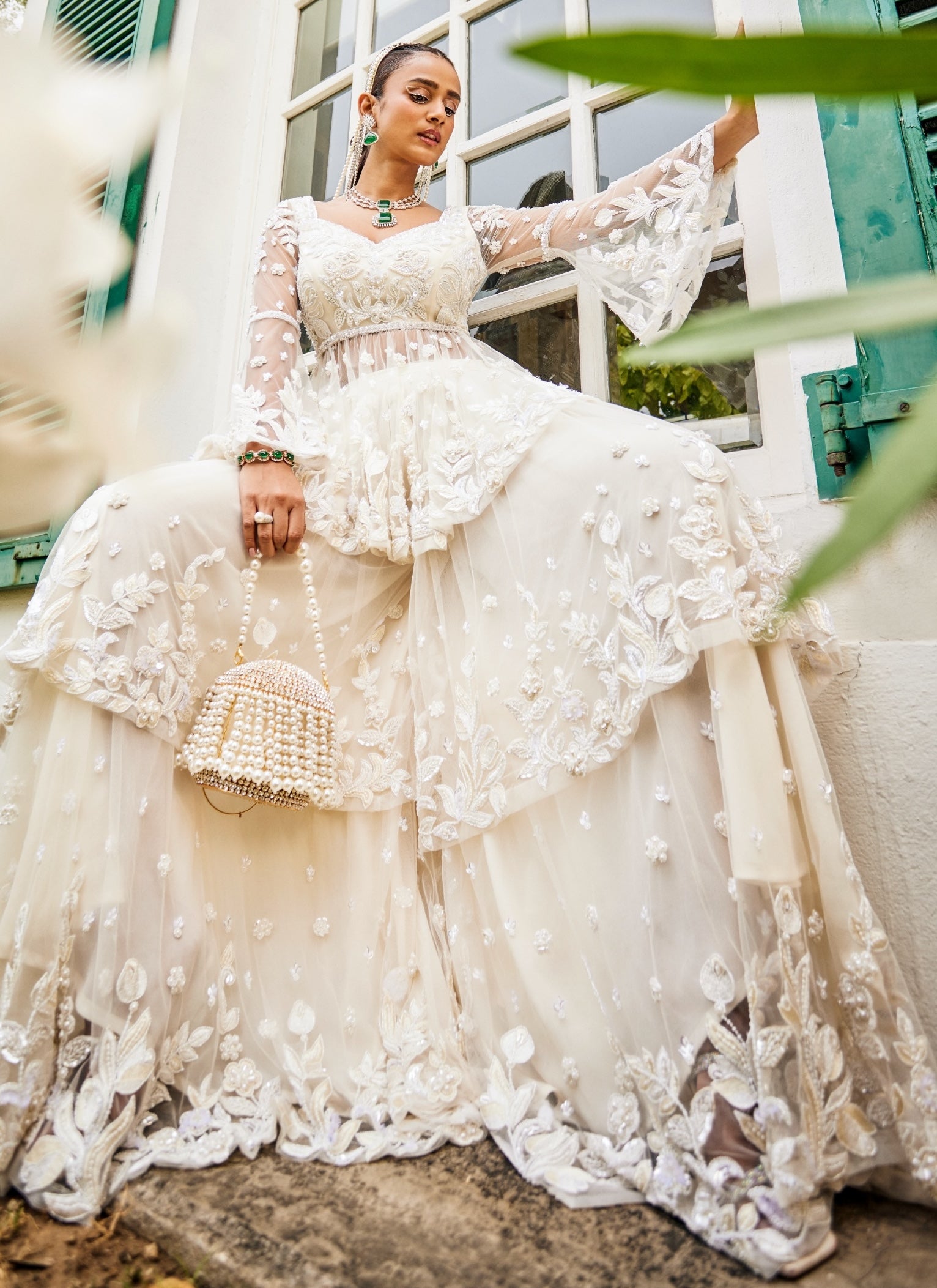Embrace timeless elegance with this exquisite set. The ivory peplum top features graceful bell sleeves, offering a flattering and sophisticated silhouette. It is beautifully complemented by a double-layered sharara, which is intricately tonal embroidered with pearls, sequins, cutdana, and resham, adding a rich texture and a touch of sparkle.